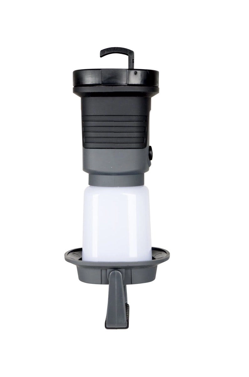 De inklapbare haak en het handvat maken ophangen in verschillende posities mogelijk, ook ondersteboven. De stabiele basis is ideaal om op een tafel of in een tent neer te zetten.