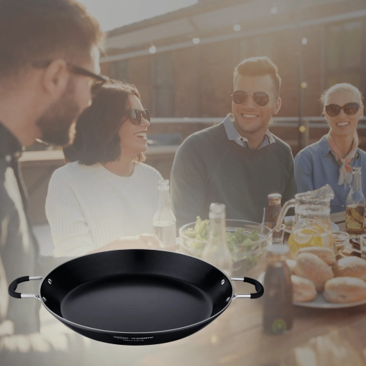 Het grote oppervlak en de lage randen zorgen voor gelijkmatige bereiding van de rijst en snel indampen – ideaal voor paella, risotto en roerbakken.