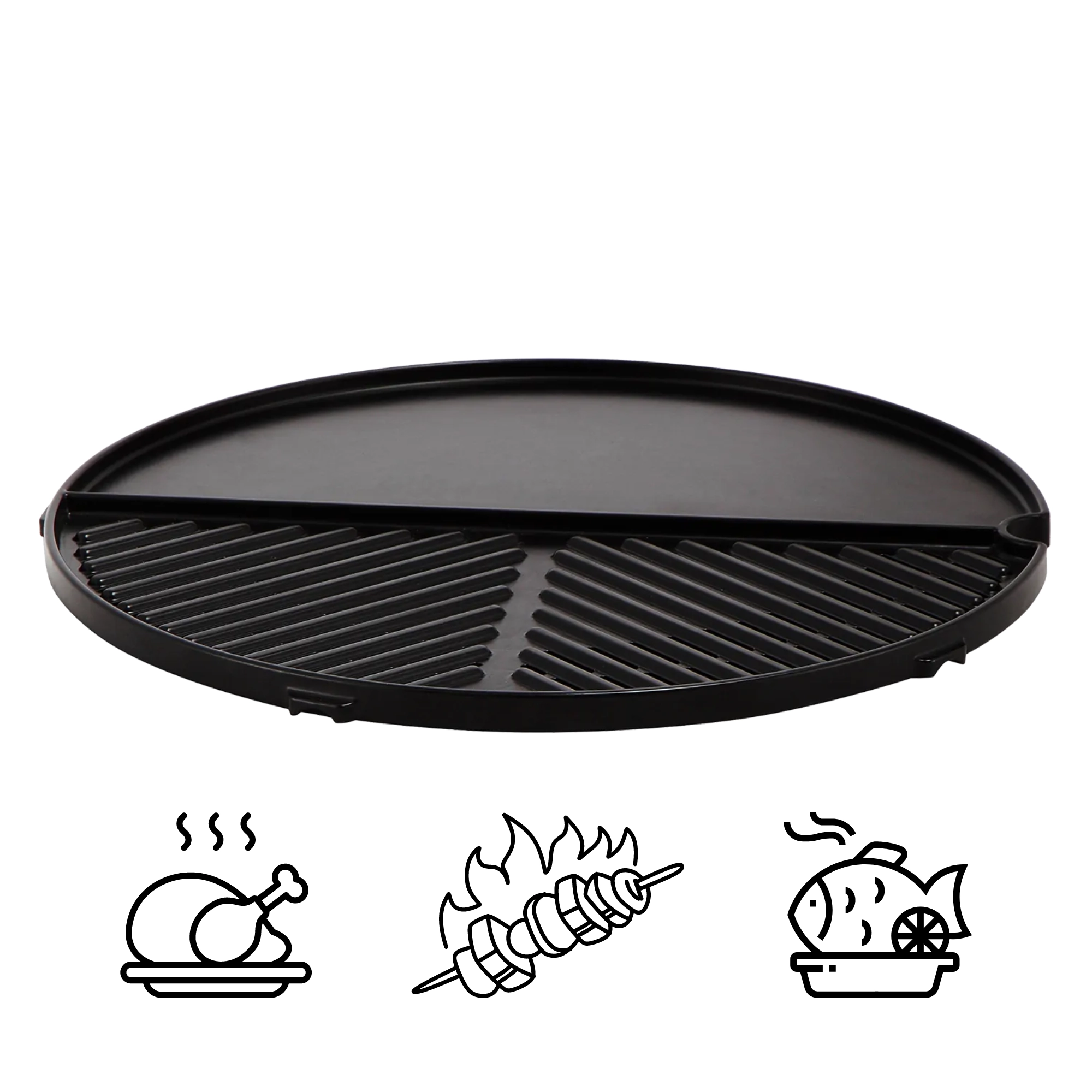 Gladde plancha voor eieren en zeevruchten, geribbeld deel voor vlees en groenten – bereid verschillende gerechten tegelijk zonder compromissen.