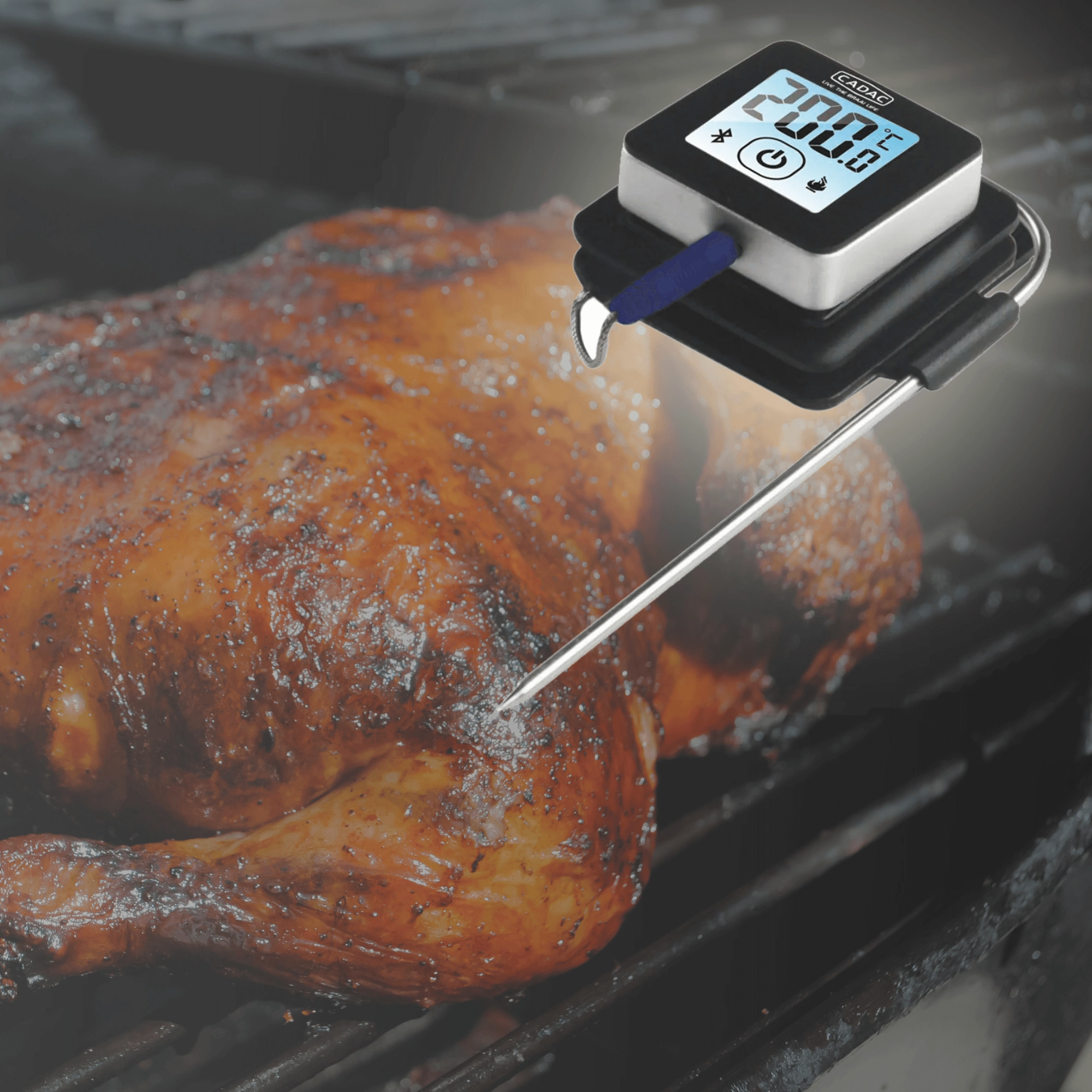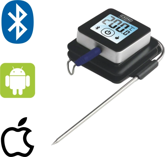 Bereik consistente resultaten bij bakken en grillen. De digitale CADAC-thermometer met RVS sonde en goed leesbaar LCD-display laat je de kerntemperatuur van vlees precies bewaken. Via Bluetooth verbind je met je telefoon en zie je in de app live gegevens en de temperatuurcurve.