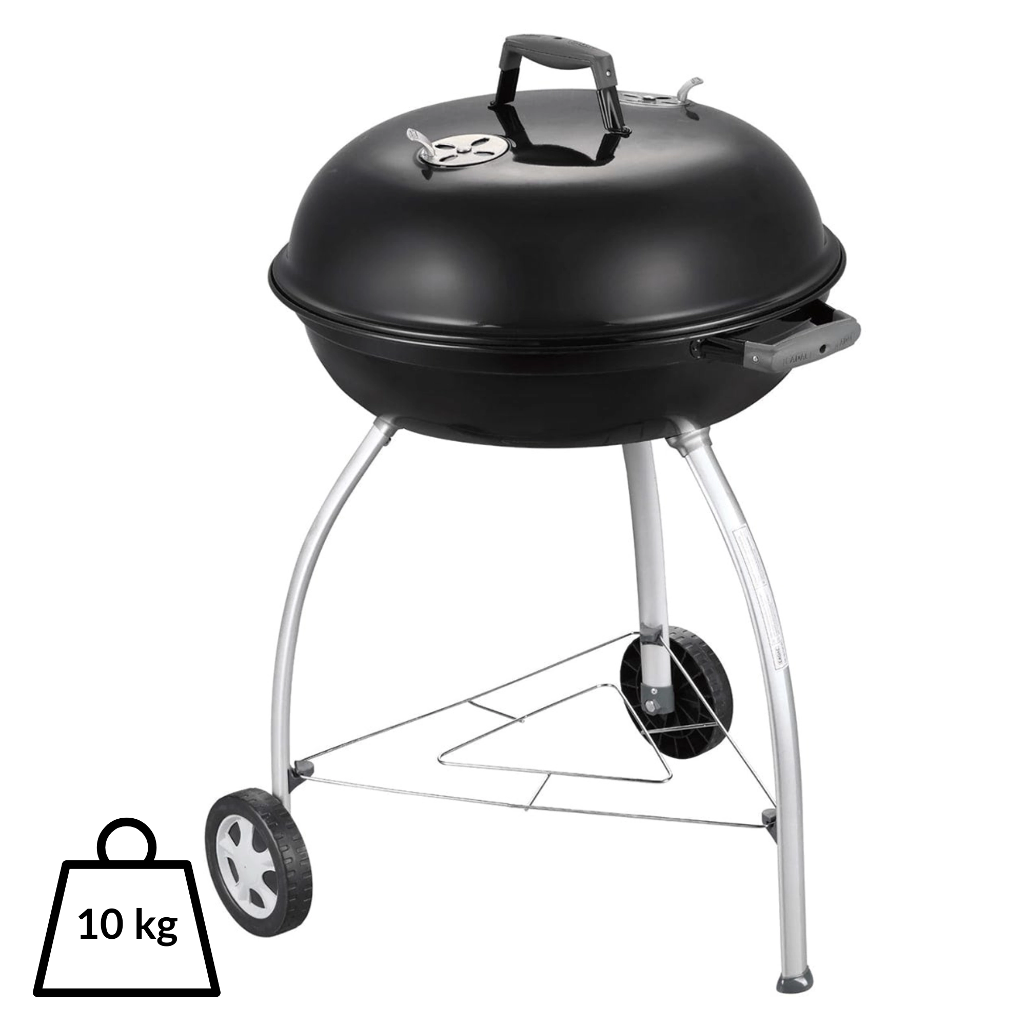 Praktische houtskoolbarbecue CHARCOAL MATE van duurzame geëmailleerde staal biedt een ruim grilloppervlak van 54 cm, twee verstelbare ventilaties in deksel en eenvoudig onderhoud. De stabiele constructie met aluminium poten en wielen zorgt voor comfortabel verplaatsen, terwijl dubbel omgevouwen randen roestvorming tegengaan voor een langere levensduur.