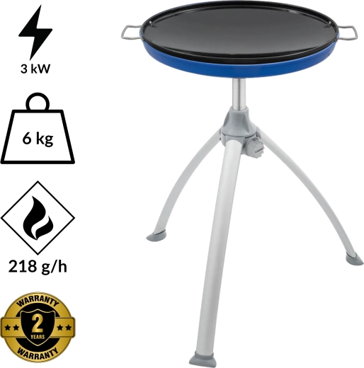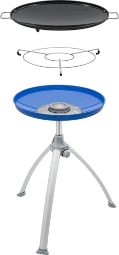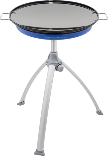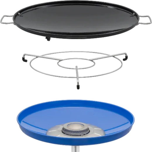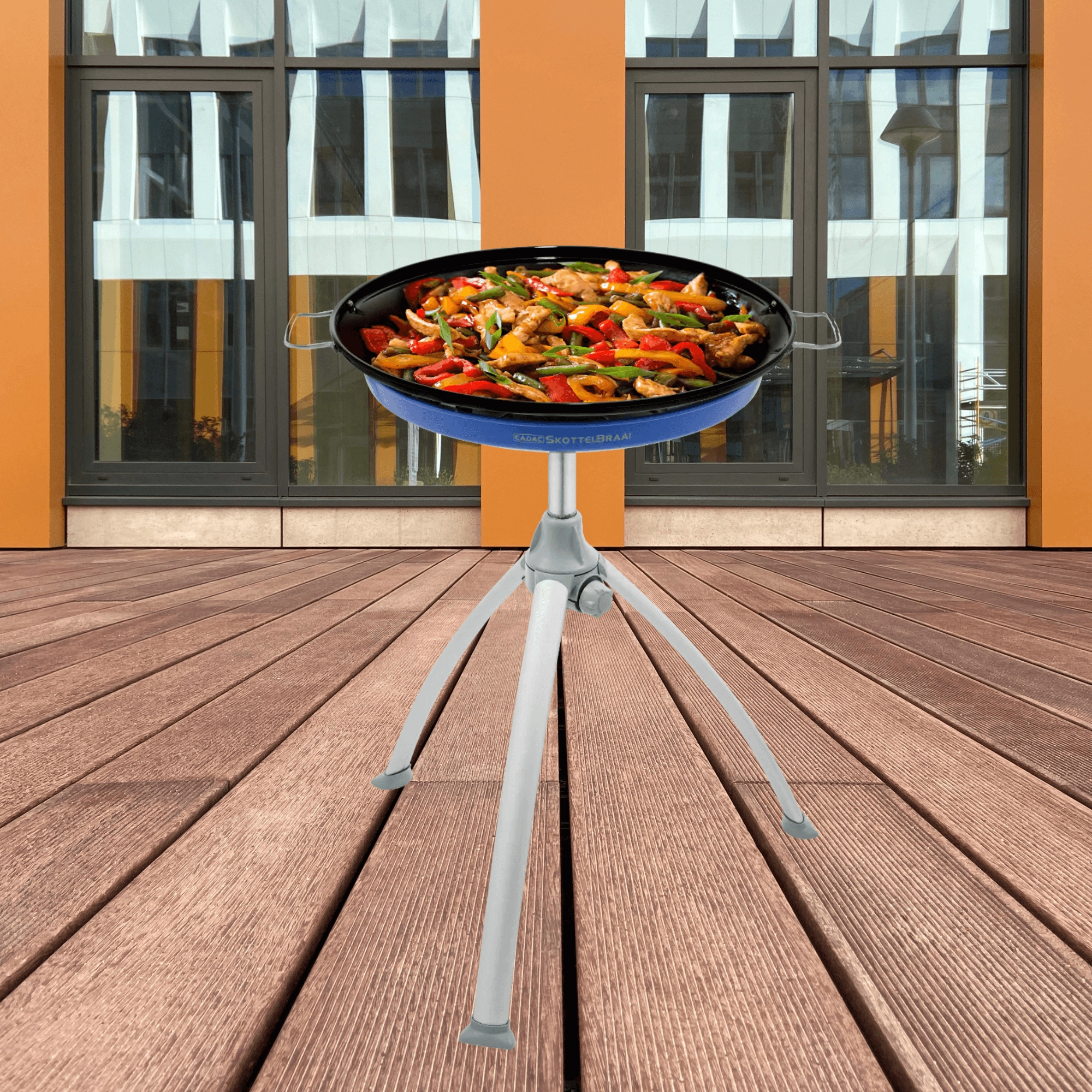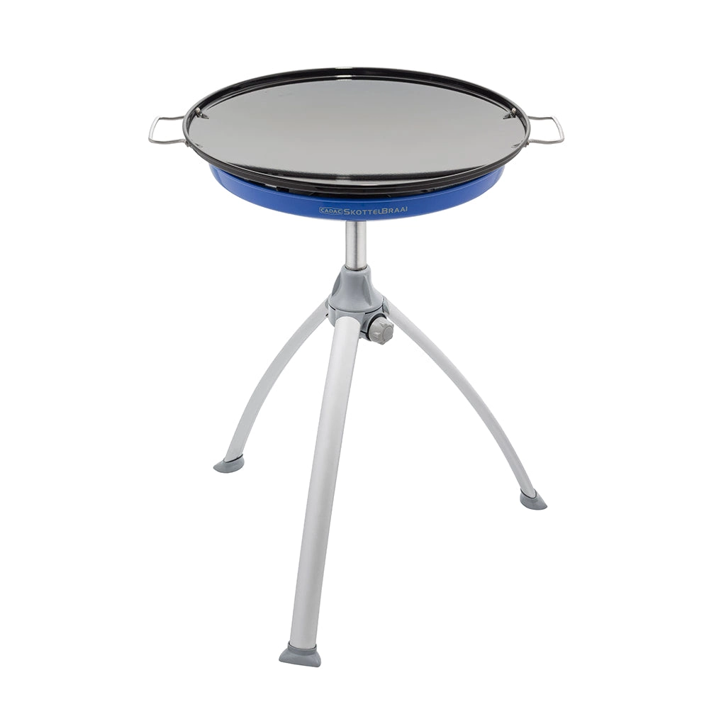 De universele en draagbare gasbarbecue CADAC Skottel Braai met een diameter van 48 cm is ideaal voor kamperen, de tuin en uitstapjes. Biedt een groot kookoppervlak, een stabiele driepoot, laag gewicht onder 6 kg en twee verwisselbare kookplaten – een gladde/geribbelde plaat en een pannenring. Dankzij het vermogen van 3 kW en de gelijkmatige warmteverdeling bereid je moeiteloos ontbijt, paella, Aziatische gerechten en sappige steaks.