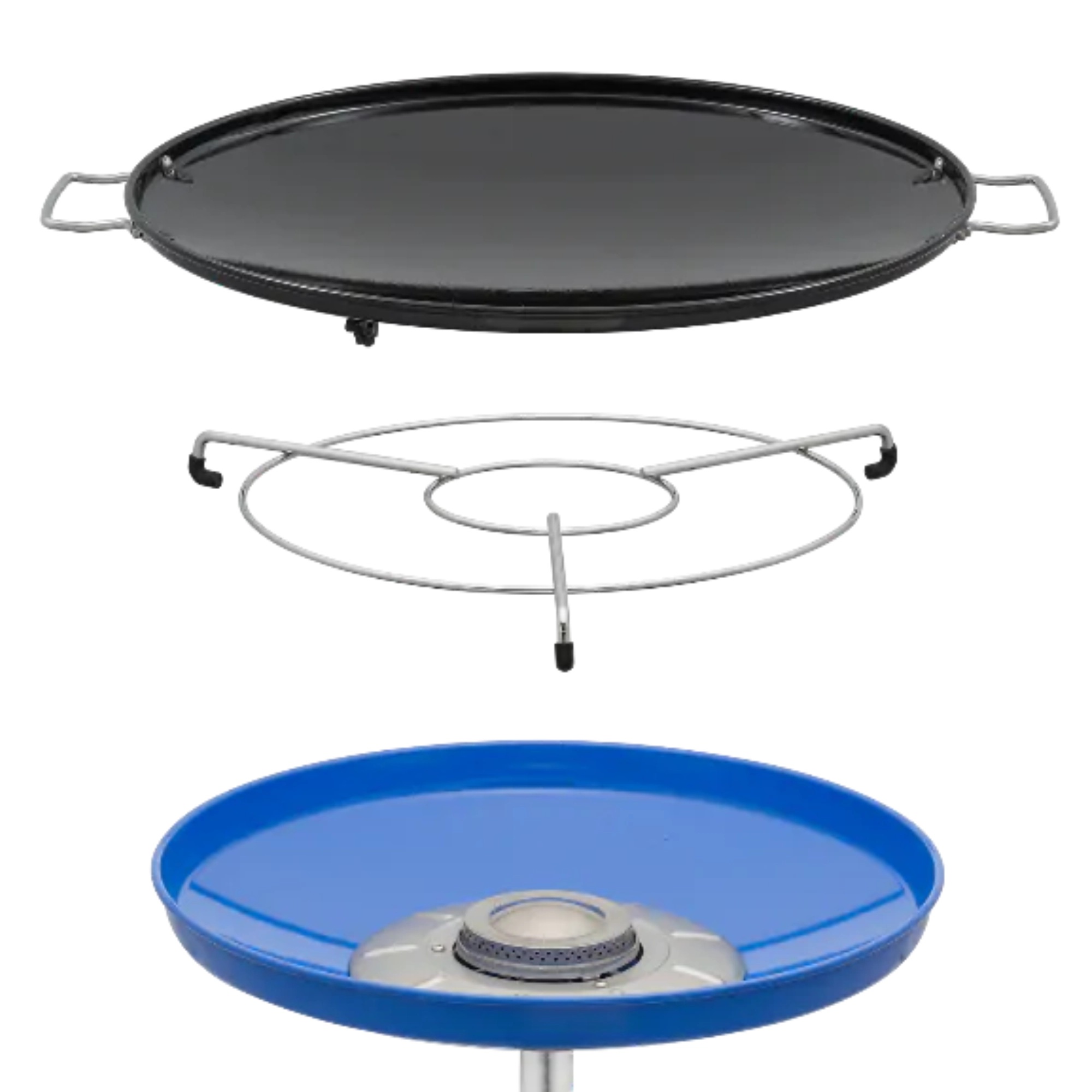 De Skottel Braai is geïnspireerd op de traditionele Afrikaanse pan, heeft een duurzame kom met een harde porselein-emaillelaag en roestvrijstalen handgrepen voor veilige bediening. In de set vind je een 2-in-1 plaat (glad/geribbeld) voor bakken en grillen en een pannenhouder voor koken in pannen tot een diameter van 30 cm.