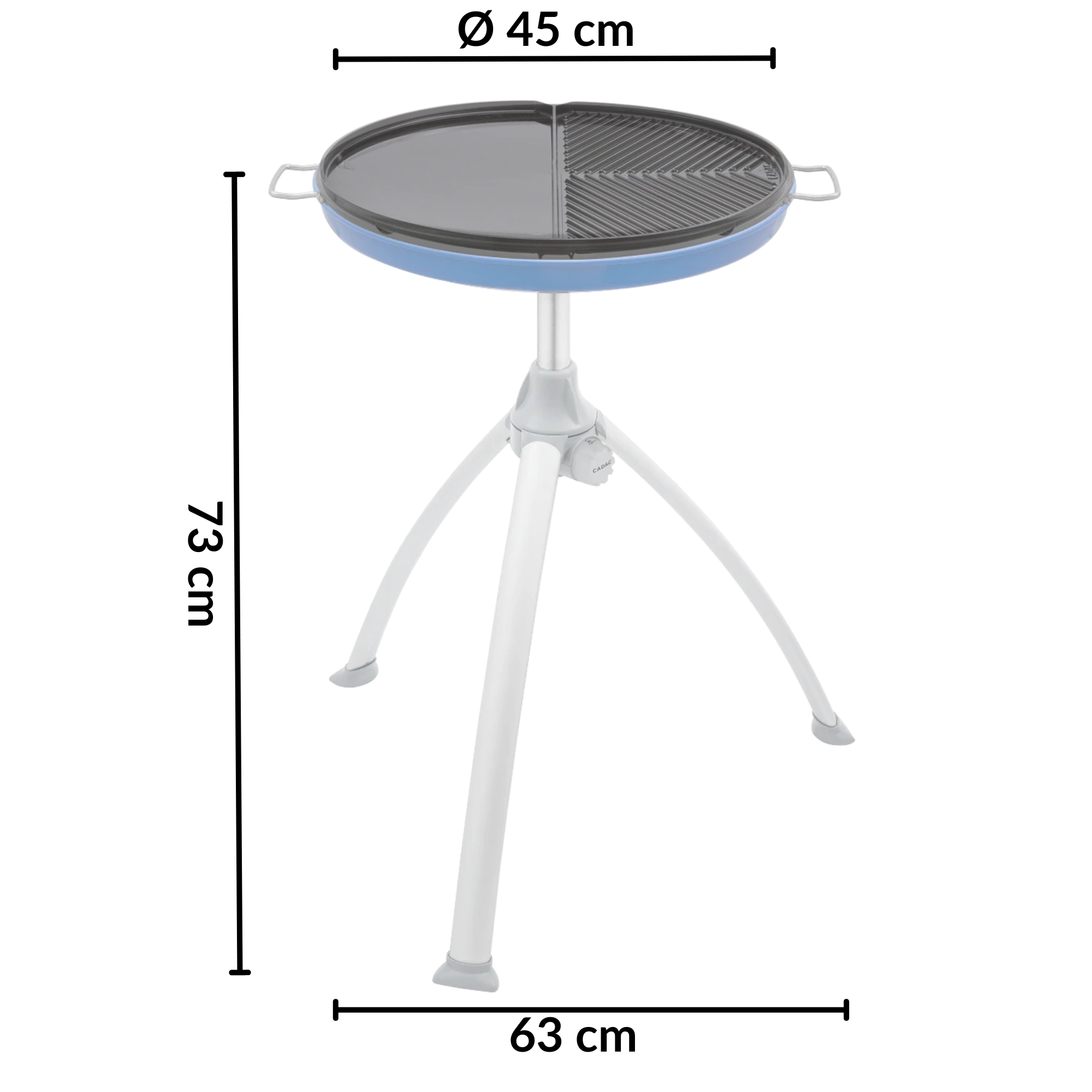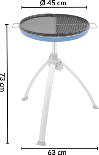 Universele buitenkoker en grill in één voor kamperen en tuin. Dankzij de dubbelzijdige antiaanbakplaat met een helft glad en een helft geribbeld oppervlak bereid je vlees, vis, groenten en pannenkoeken tegelijk. Licht opvouwbaar driepootstatief, panstandaard en praktische tas inbegrepen. Precieze vlamregeling, groot oppervlak van 45 cm en werking op gasfles.