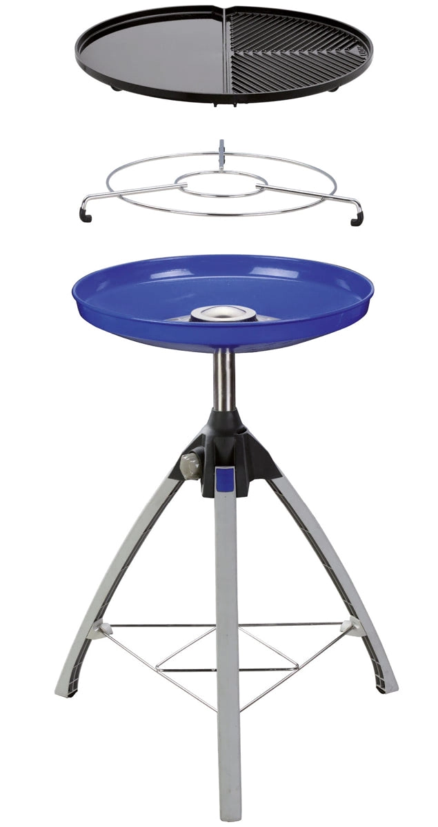 Het stabiele maar lichte opvouwbare driepootstatief van geanodiseerd aluminium is makkelijk in te pakken en geschikt voor camping, chalet en tuin. De grill heeft precieze vlamregeling, een groot oppervlak van 45 cm en een afneembaar kruidenrekje. Werking op een navulbare gasfles met slang en regelaar (niet inbegrepen).