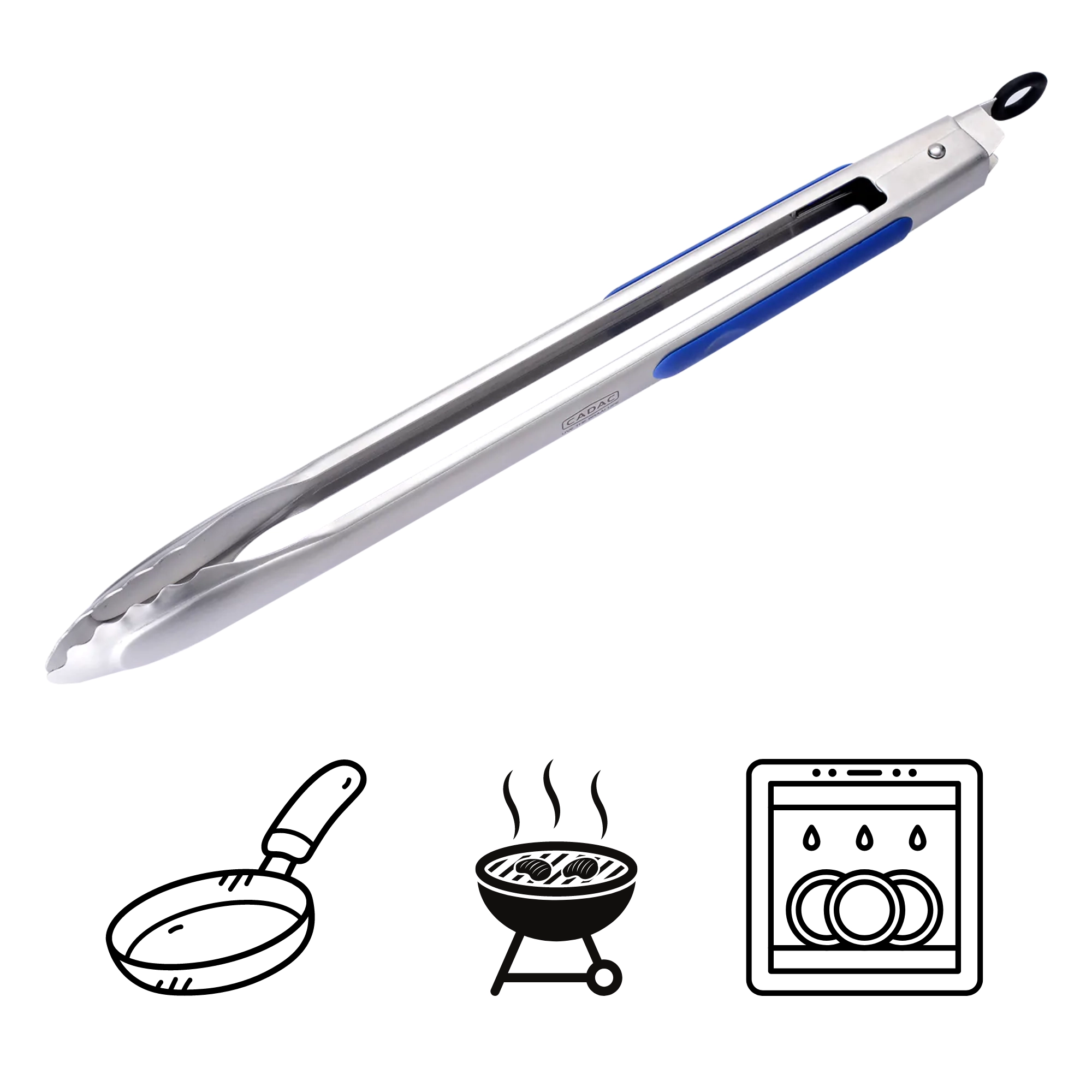 Praktische en duurzame RVS BBQ-tang met een antislip siliconen handgreep voor een zekere grip. Dankzij de lengte van 45 cm blijven je handen op afstand van de hitte, de vergrendeling voor opslag bespaart ruimte en de vaatwasserbestendigheid maakt reinigen eenvoudig – ideaal voor barbecue, pan en kamperen.