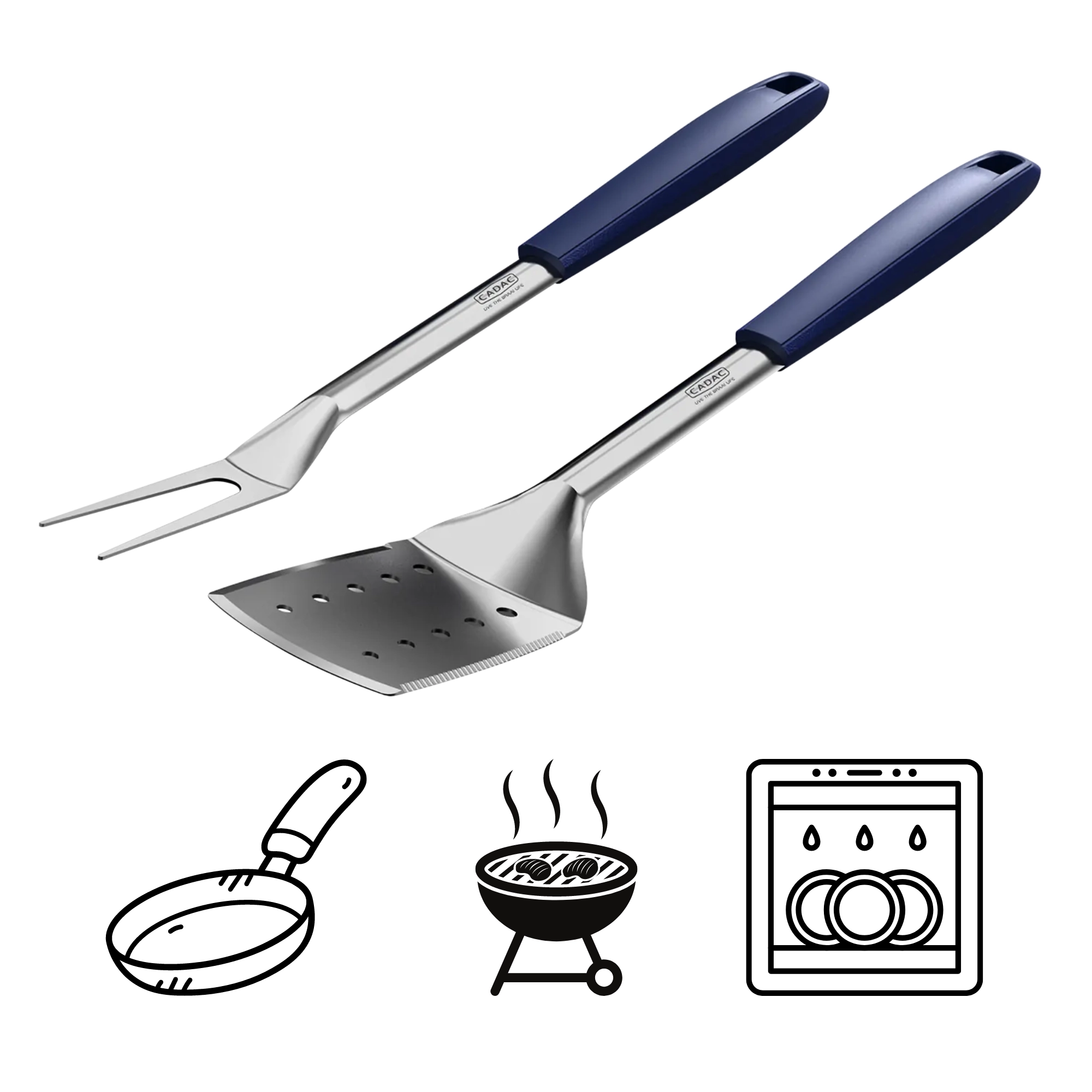 De professionele CADAC-barbecueset bevat een robuuste roestvrijstalen spatel en vork met lange, ergonomische handgrepen. Dankzij de magneten in de handgrepen bevestig je ze eenvoudig op de meeste metalen oppervlakken en houden de geïntegreerde steunen het werkgedeelte boven het werkblad voor betere hygiëne. Duurzame materialen weerstaan hoge temperaturen en bieden comfortabel en veilig gebruik bij de barbecue en in de keuken.