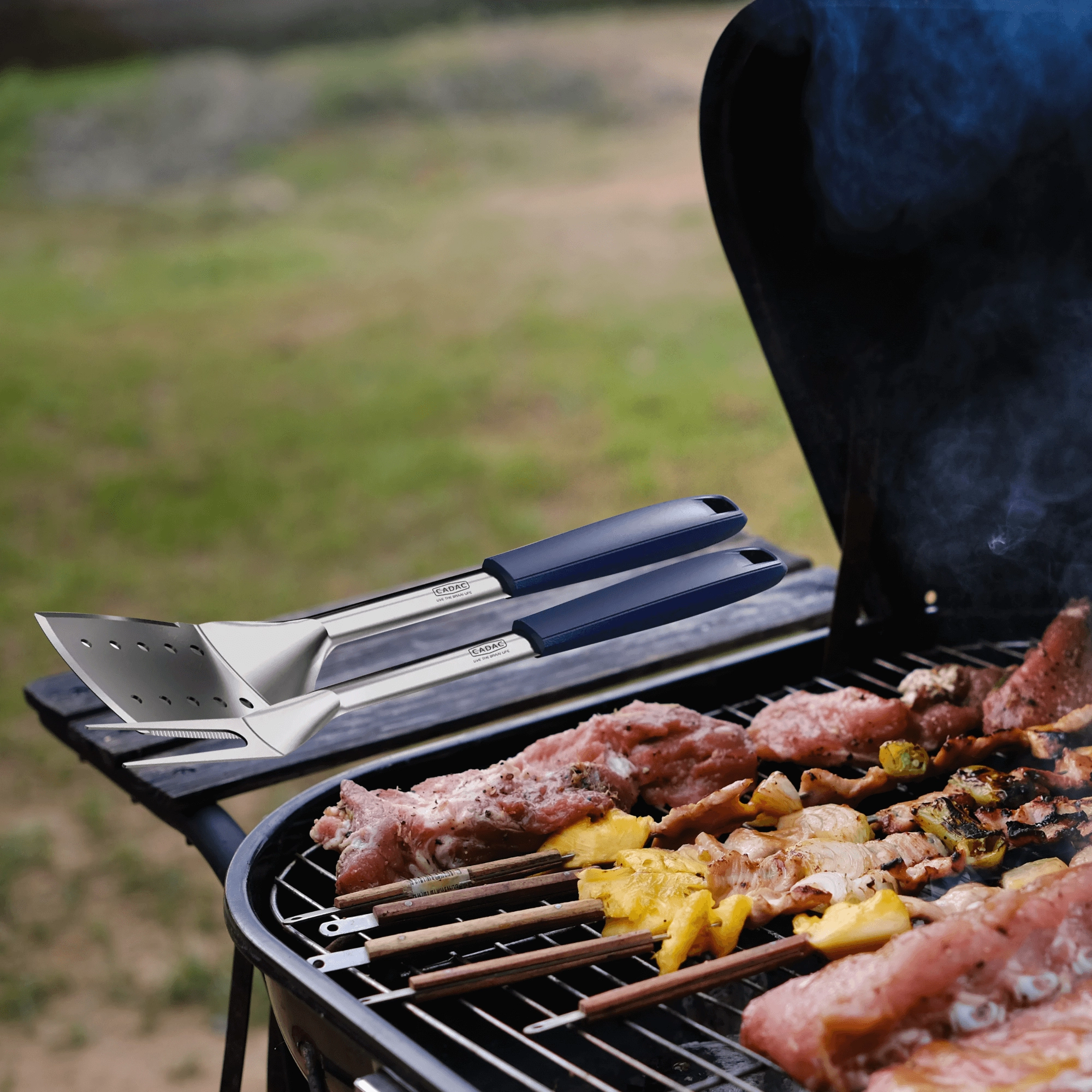 De CADAC-set combineert roestvrij staal voor de werkdelen met hittebestendig kunststof voor de handgrepen. Het lange gereedschap (45 cm) biedt zekerheid en voldoende afstand tot de hitte, terwijl magnetische uiteinden snel wegleggen op een metalen oppervlak mogelijk maken (niet op rvs). Geïntegreerde steunen houden de punten boven het werkblad en voorkomen contact met vuil.