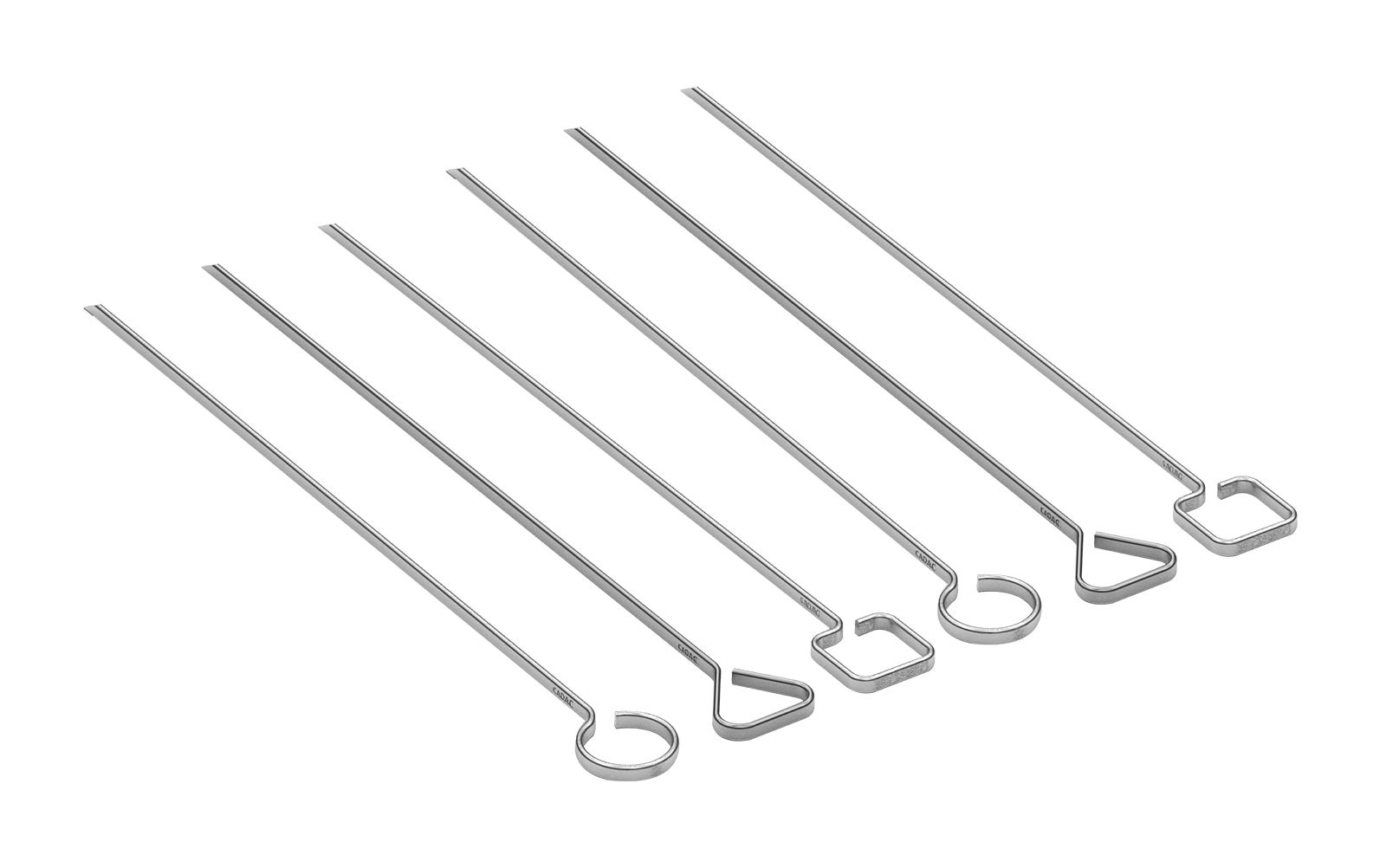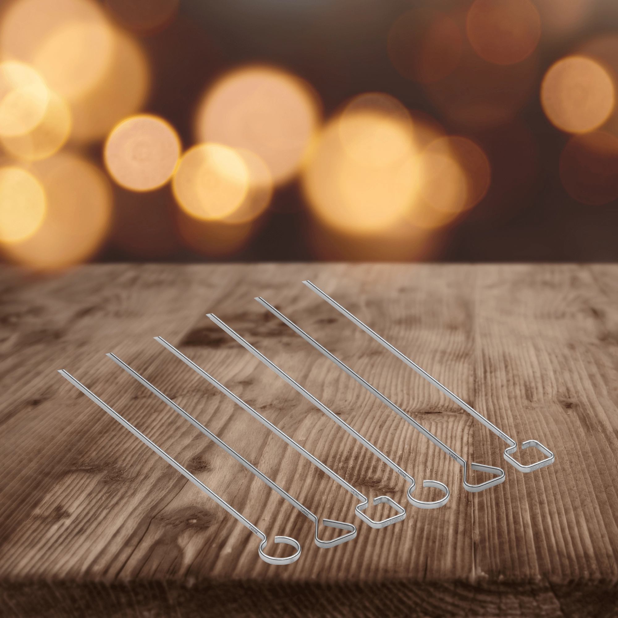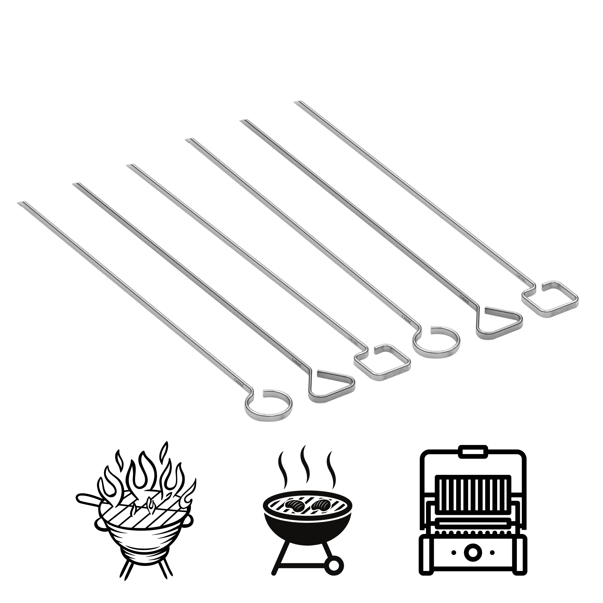Stijlvolle set van zes roestvrijstalen CADAC-spiesen voor het grillen van vlees en groenten. Ze hebben een scherpe punt voor eenvoudig rijgen, unieke handgrepen voor herkenning, zijn duurzaam, herbruikbaar en met een lengte van 30 cm geschikt voor de meeste grills.