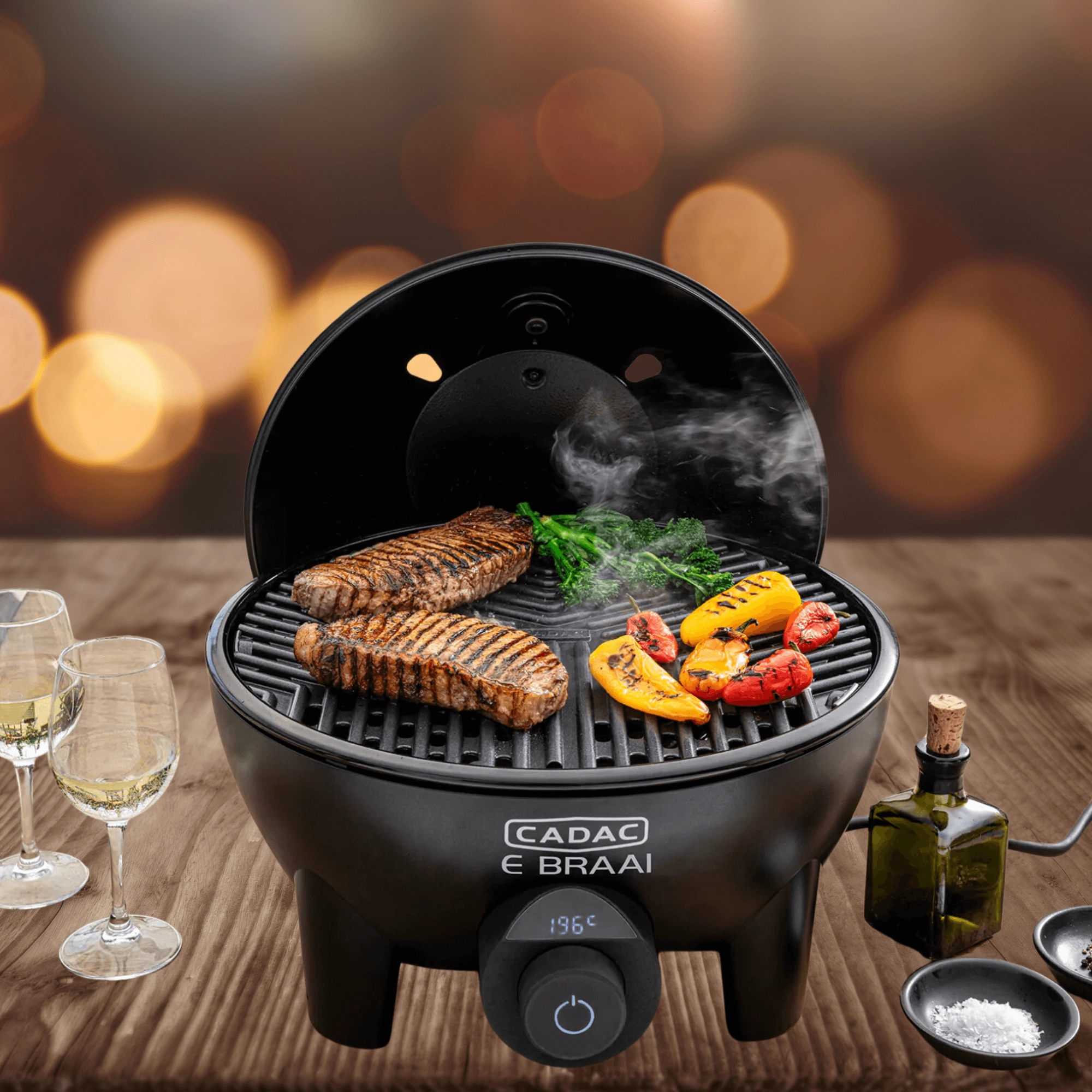 Ontdek het gemak en de smaak van elektrisch grillen met de compacte CADAC E‑Braai. Het krachtige 2,3 kW verwarmingselement zorgt voor snel opwarmen, terwijl de automatische, nauwkeurige temperatuurregeling direct op het rooster meet. Het bereik van 70–270 °C is ideaal voor langzaam garen tot heet grillen. Onderhoud is eenvoudig dankzij de uitneembare vaatwasserbestendige vetopvangbak en het keramische GreenGrill-rooster voor gezonder bereiden.
