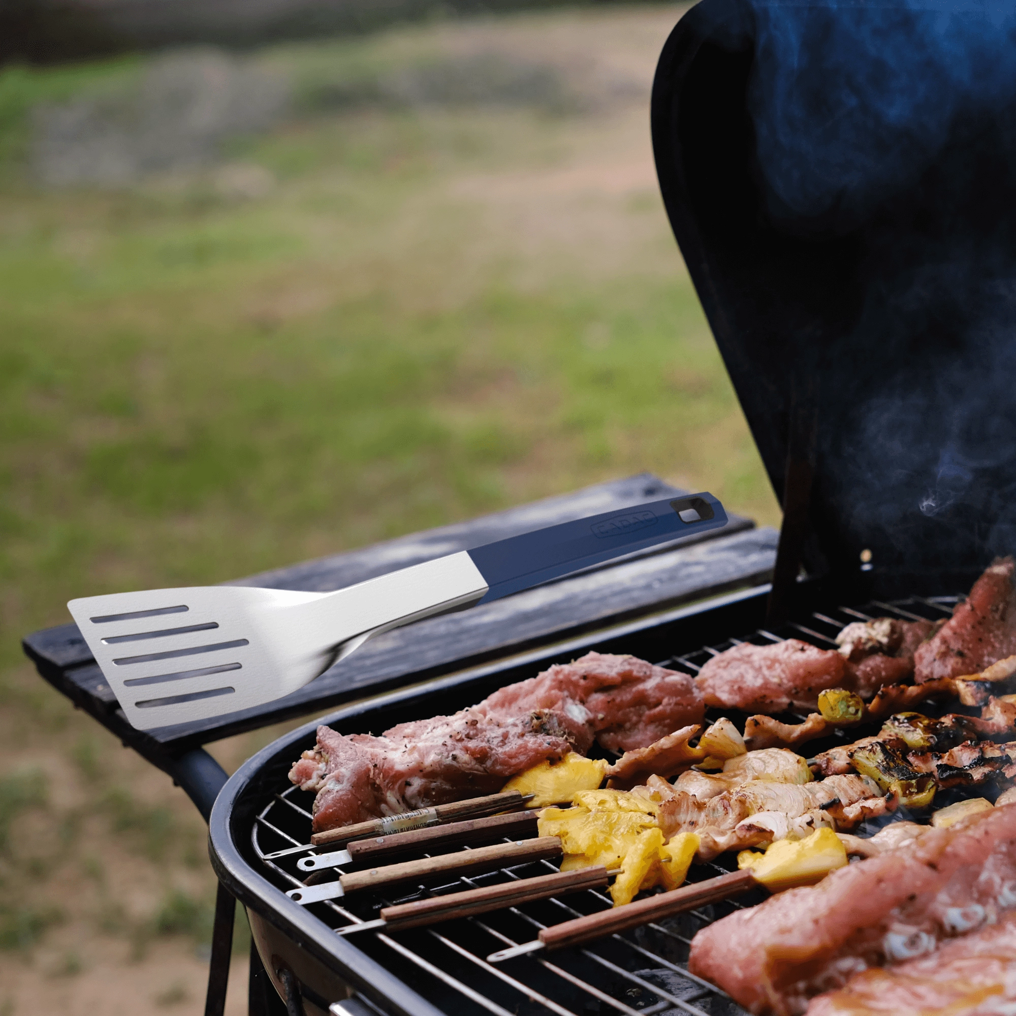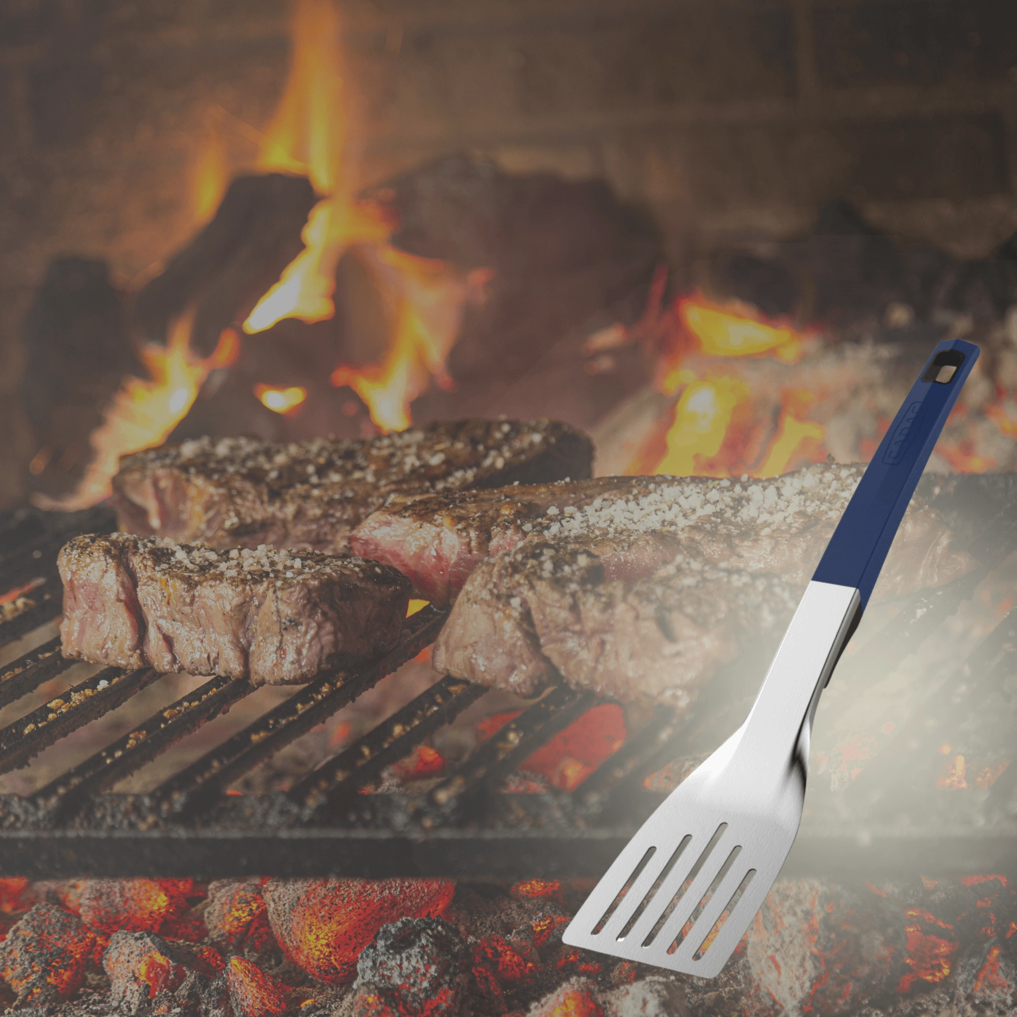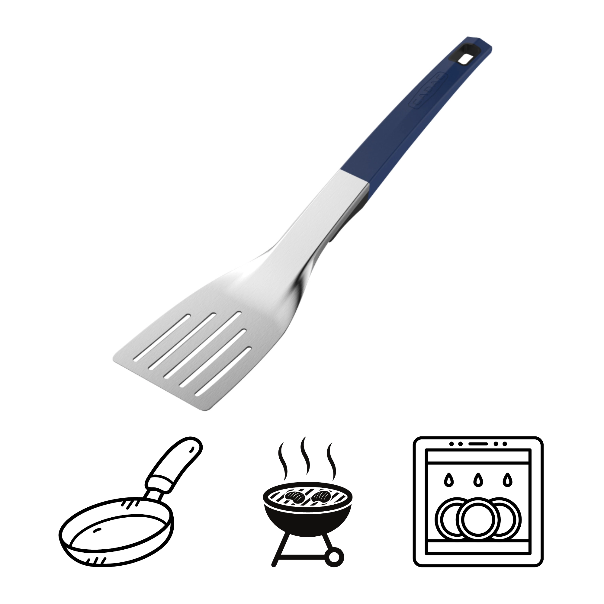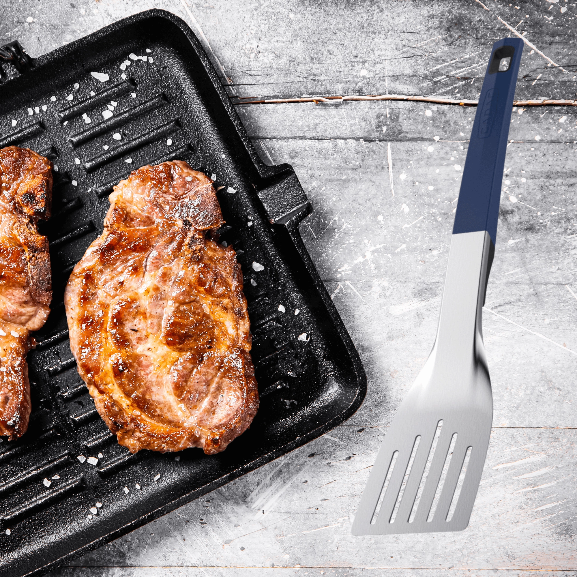 Het brede, geperforeerde blad maakt efficiënt opscheppen en keren van vlees, groenten of vis mogelijk, terwijl de openingen helpen overtollige olie en sappen af te voeren. Na gebruik kun je hem eenvoudig in de vaatwasser reinigen en ophangen aan de praktische opening.