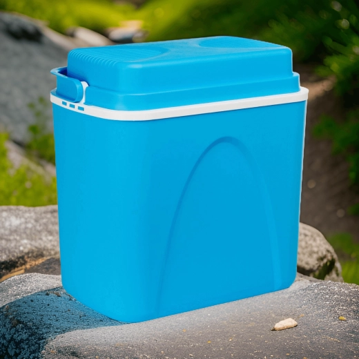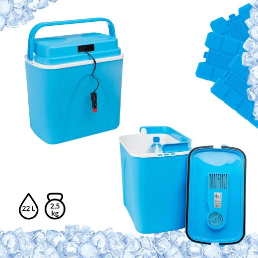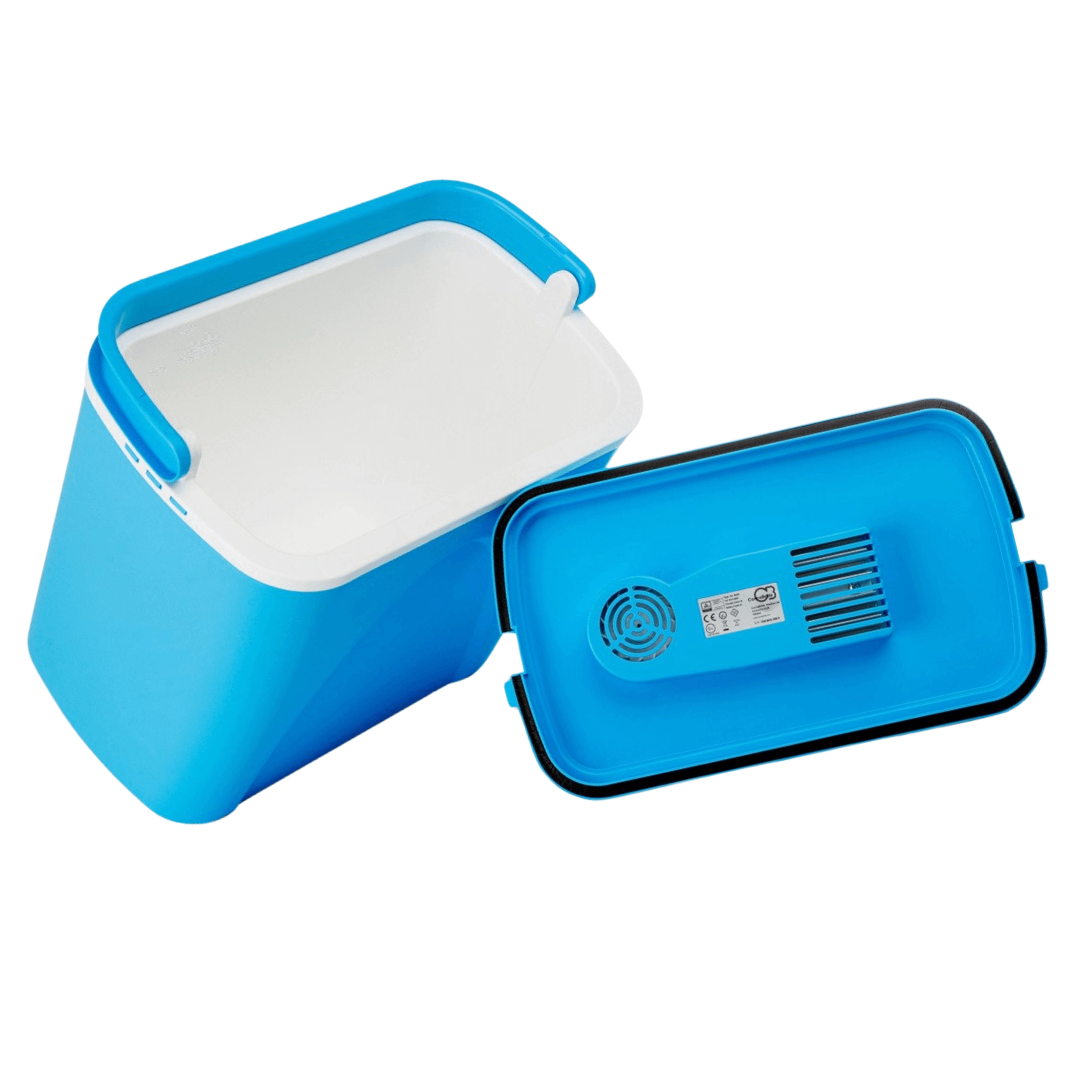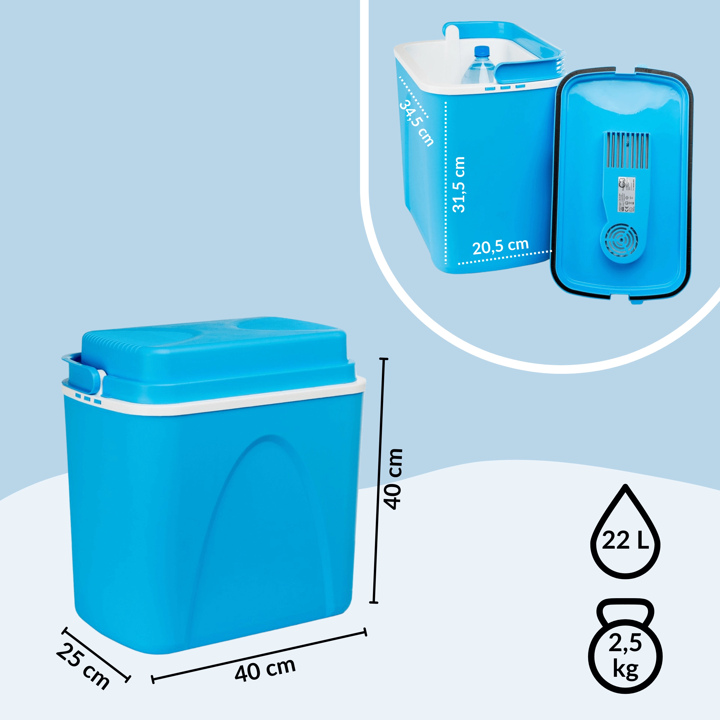 Doordachte afmetingen maken het mogelijk om 1,5 l flessen rechtop te plaatsen en snacks en drankjes overzichtelijk te rangschikken. De lichte maar stevige behuizing van polypropyleen is duurzaam en eenvoudig te reinigen. Het stijlvolle blauwe design past perfect op het strand, op de camping en in de kofferbak.