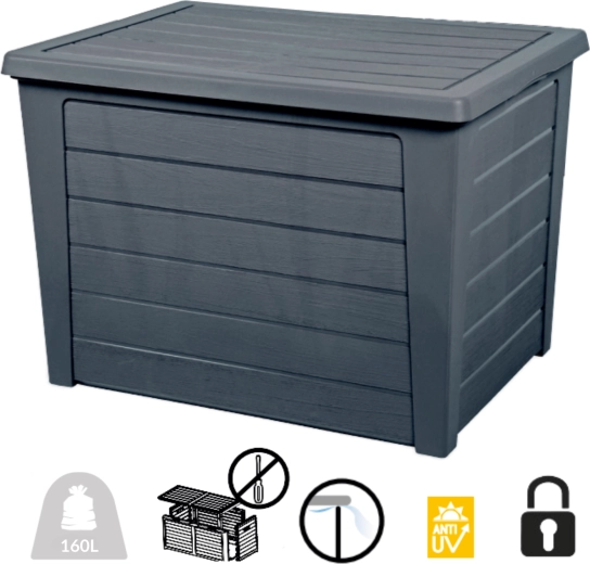 De compacte tuinkist BAYA met een inhoud van 160 l in elegante antraciet houdt alles wat u nodig heeft binnen handbereik en droog. Het duurzame kunststof met UV-stabilisatie is onderhoudsvrij, het houtlook oppervlak past perfect op terras, balkon en in de tuin. De constructie is waterdicht, licht en eenvoudig te reinigen.