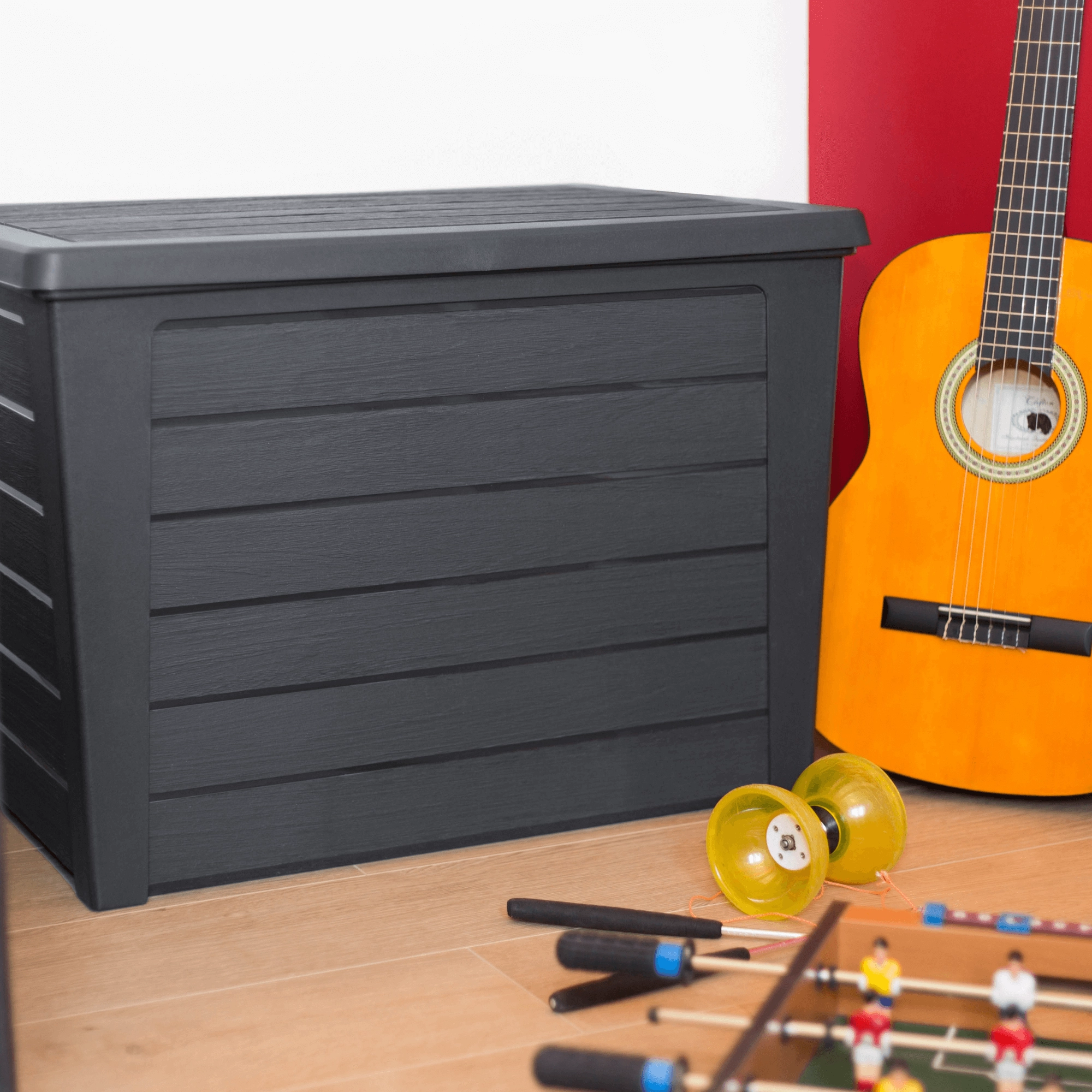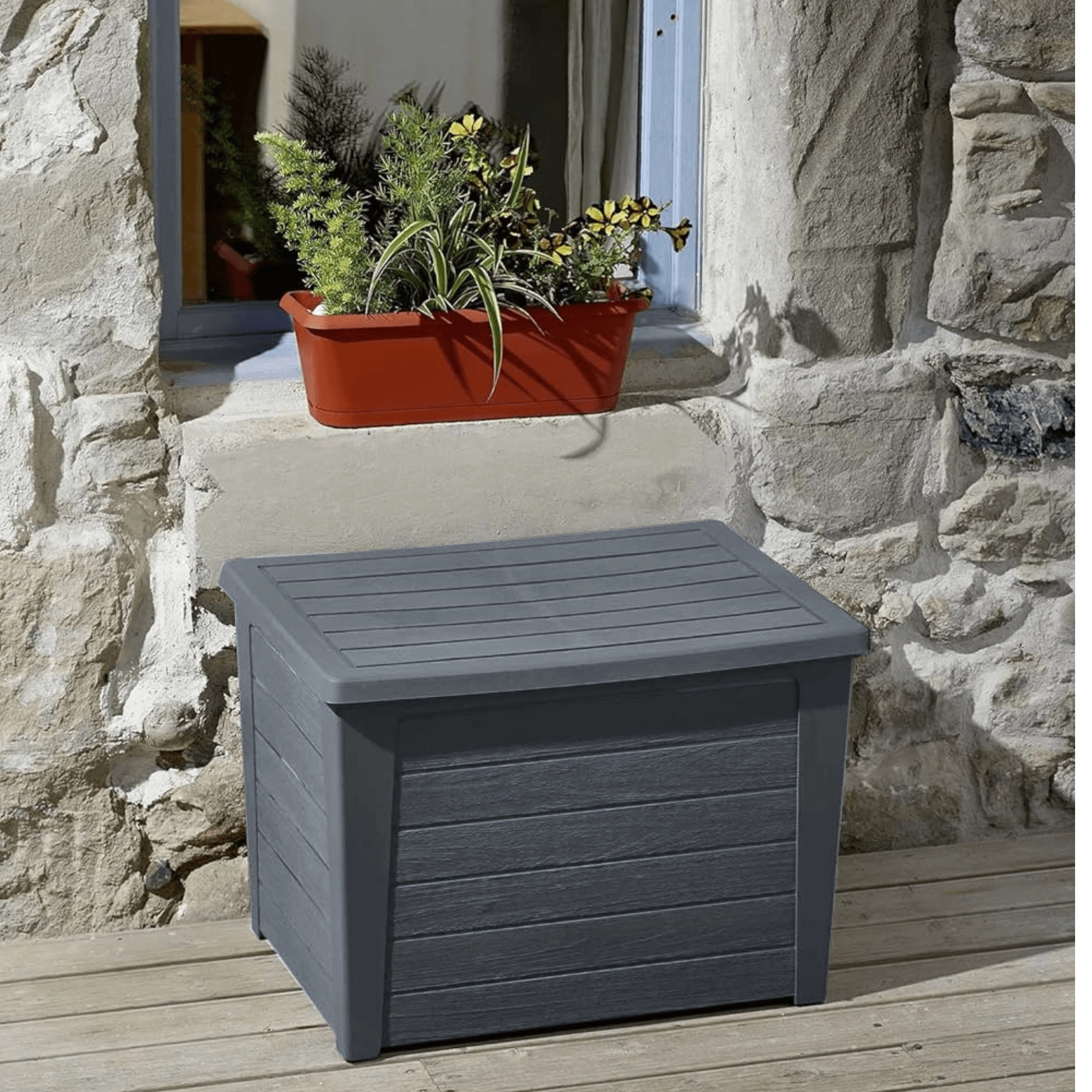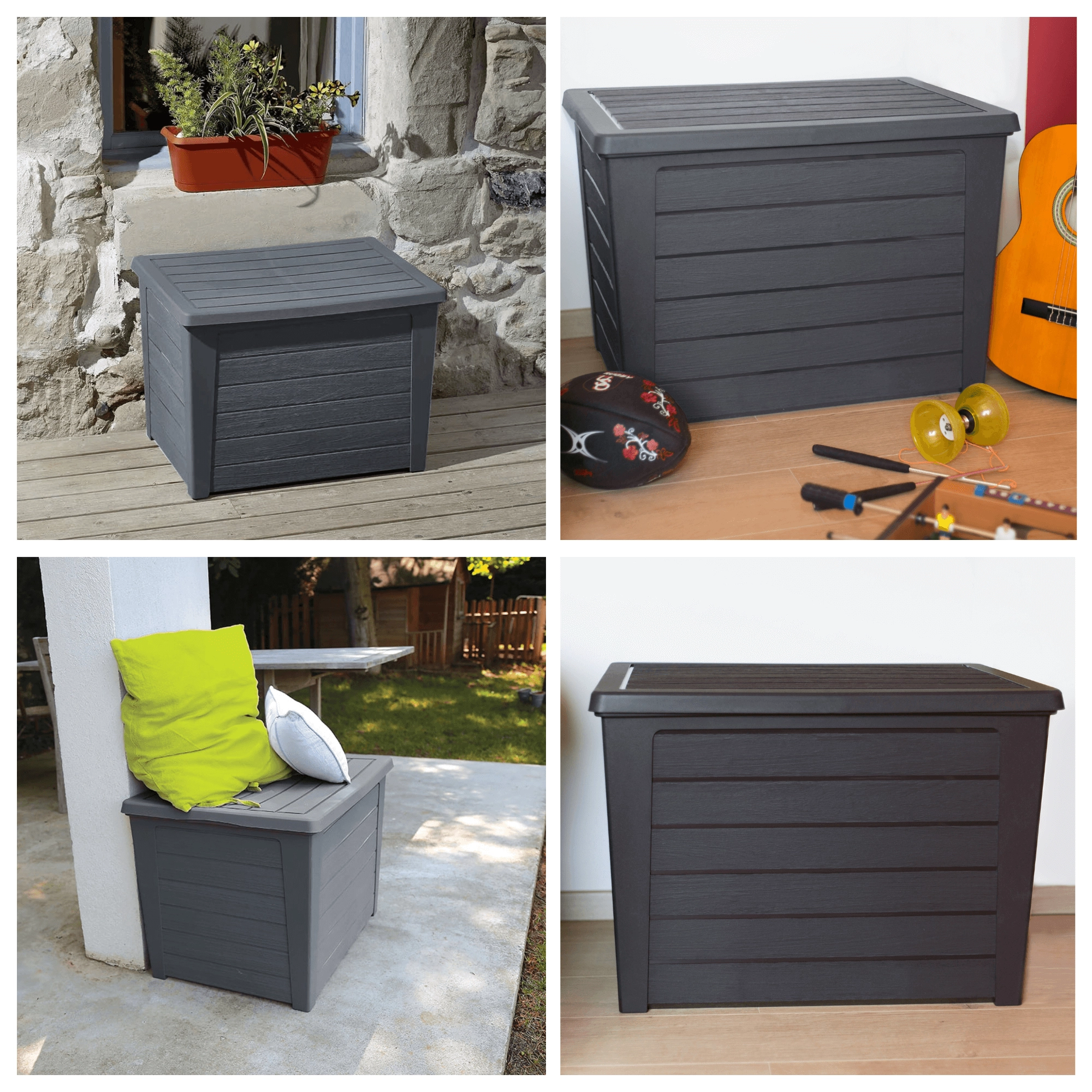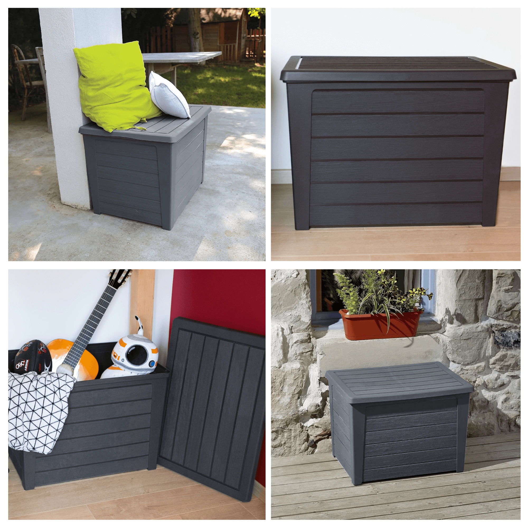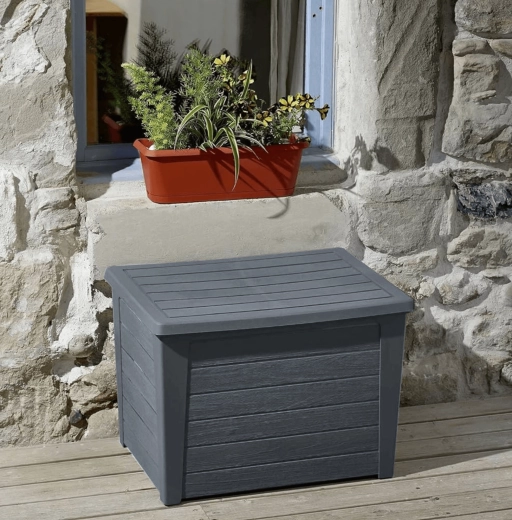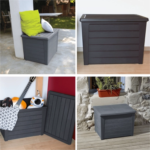 De praktische kist zorgt voor orde op het terras, balkon en binnenshuis en kan ook dienen als extra afzetoppervlak.