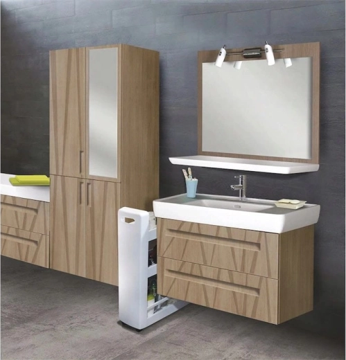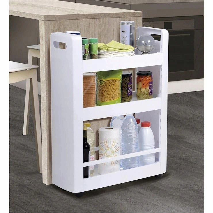 Deze slanke opbergkast op wieltjes is ideaal om loze ruimtes tussen meubels te benutten, naast het aanrecht of onder het werkblad tot 80 cm hoog. De brede planken bieden plaats voor twee flessen van 1,5 l naast elkaar, cosmetica, schoonmaakmiddelen, voorraadbussen, kruidenpotjes en kookboeken.