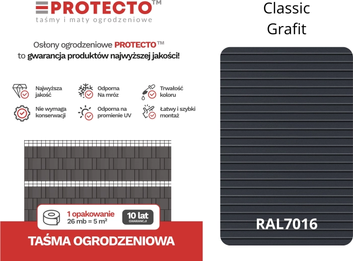 De Thermoplast Classic Line hekband in de tint grafiet (RAL 7016) is de ideale oplossing voor maximale privacy en bescherming tegen wind, stof en geluid. Het premium PP-materiaal biedt uitzonderlijke uv-bestendigheid, evenals weerstand tegen vorst, sneeuw en vocht, terwijl de band langdurig kleuren vormvast blijft. De Classic-structuur is aan beide zijden gelijk en oogt esthetisch bij elk type omheining.