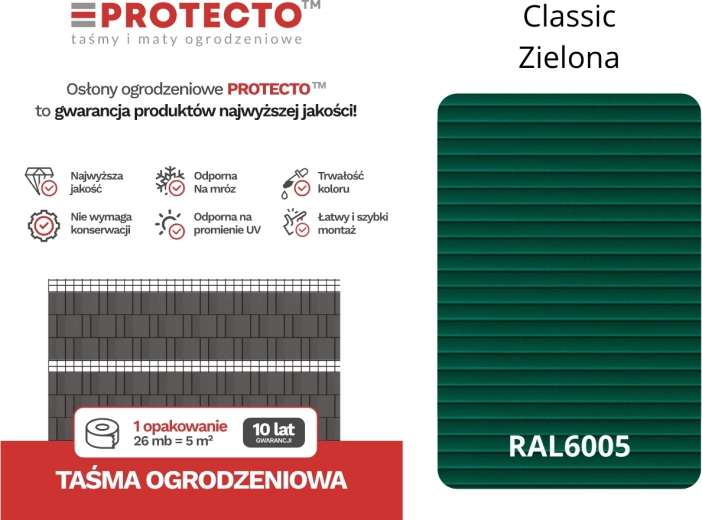 De PROTECTO schuttingband in kleur RAL 6005 (groen) is ontworpen voor maximale privacy en bescherming tegen wind, stof en geluid. Premium polypropyleen (PP) zorgt voor hoge flexibiliteit, sterkte en kleurechtheid, zodat de band bij het vlechten niet breekt of vervormt. De CLASSIC-structuur is aan beide zijden gelijk en oogt elegant bij moderne hekwerkpanelen.