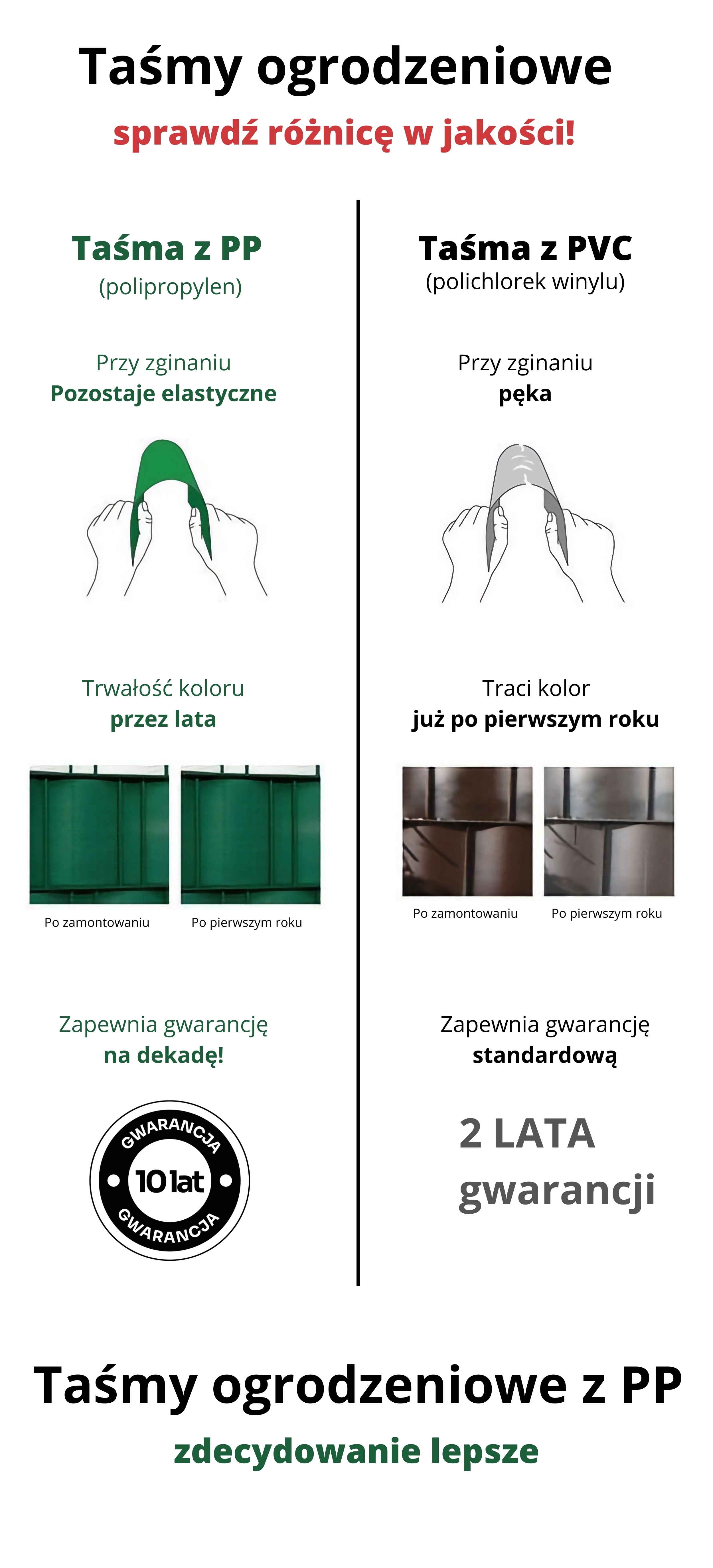 De montage doet u zelf in een paar minuten – u vlecht de band eenvoudig tussen de spijlen van het paneel. Dankzij de stijfheid van het materiaal zijn clips niet nodig (optioneel toe te voegen). De band is ideaal voor 2D- en 3D-panelen, balkon- en terrasleuningen en hekwerken met vullingen. De productie vindt plaats volgens ISO 9001 en het materiaal is veilig voor mensen, dieren en het milieu.