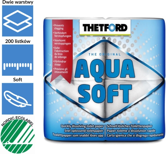 Speciaal toiletpapier THETFORD Aqua Soft is bedoeld voor chemische en reistoiletten. Het is extra zacht, lost snel op in de afvaltank, waardoor verstoppingen worden voorkomen en het legen wordt vergemakkelijkt. De milde samenstelling beschermt de bewegende onderdelen van de tank en zorgt voor een probleemloze werking.