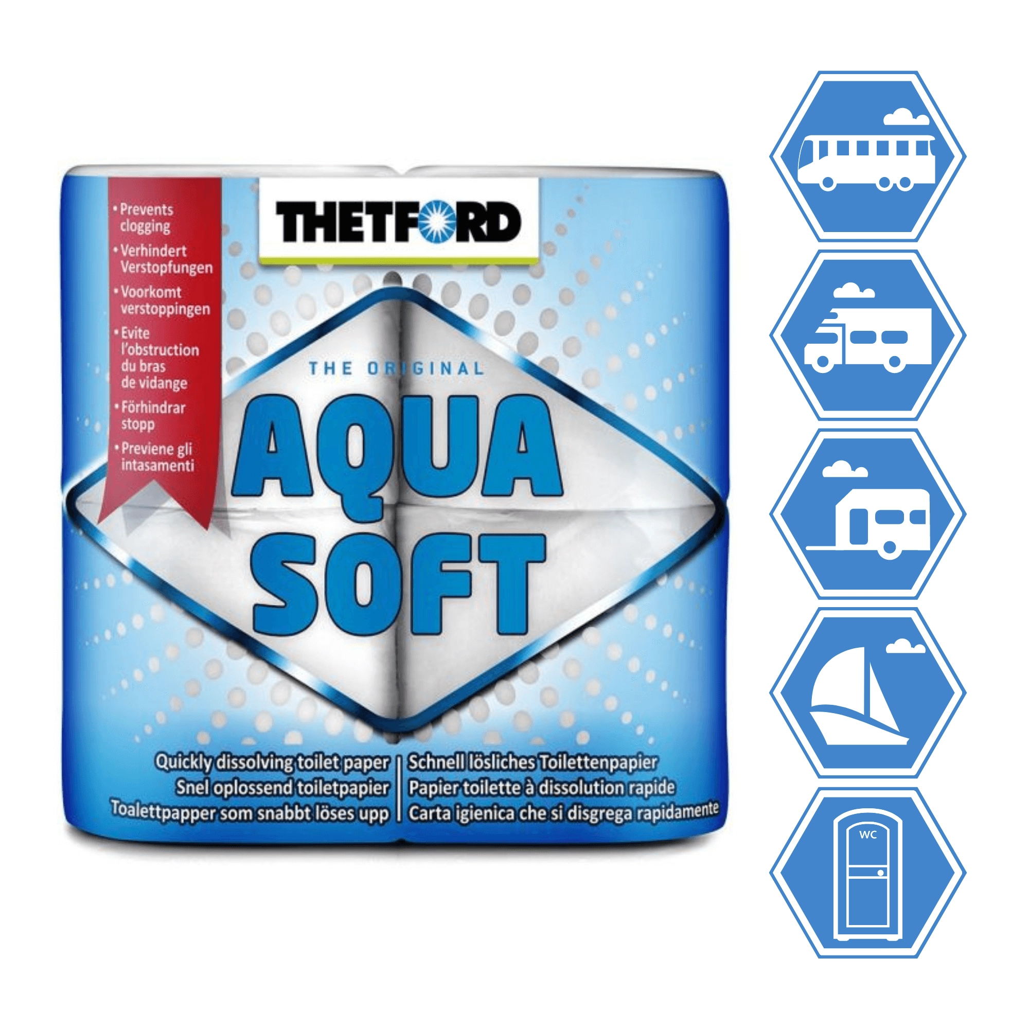 Geniet van thuiscomfort, ook onderweg. THETFORD Aqua Soft toiletpapier is speciaal ontwikkeld voor draagbare en ingebouwde chemische toiletten in campers, caravans of boten. Het is zeer zacht aan de aanraking en breekt snel af in de vuilwatertank, zodat het toilet niet verstopt en het onderhoud zo eenvoudig mogelijk is.