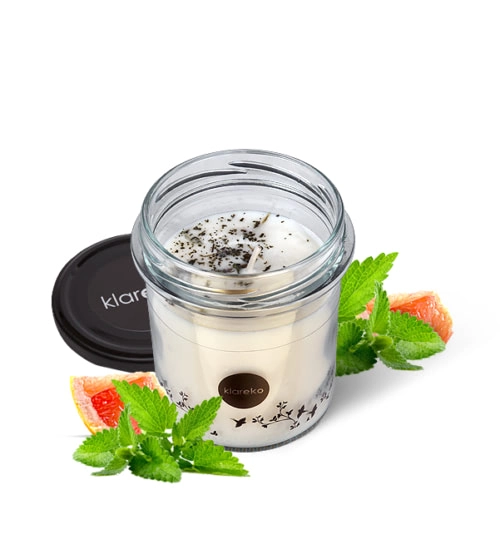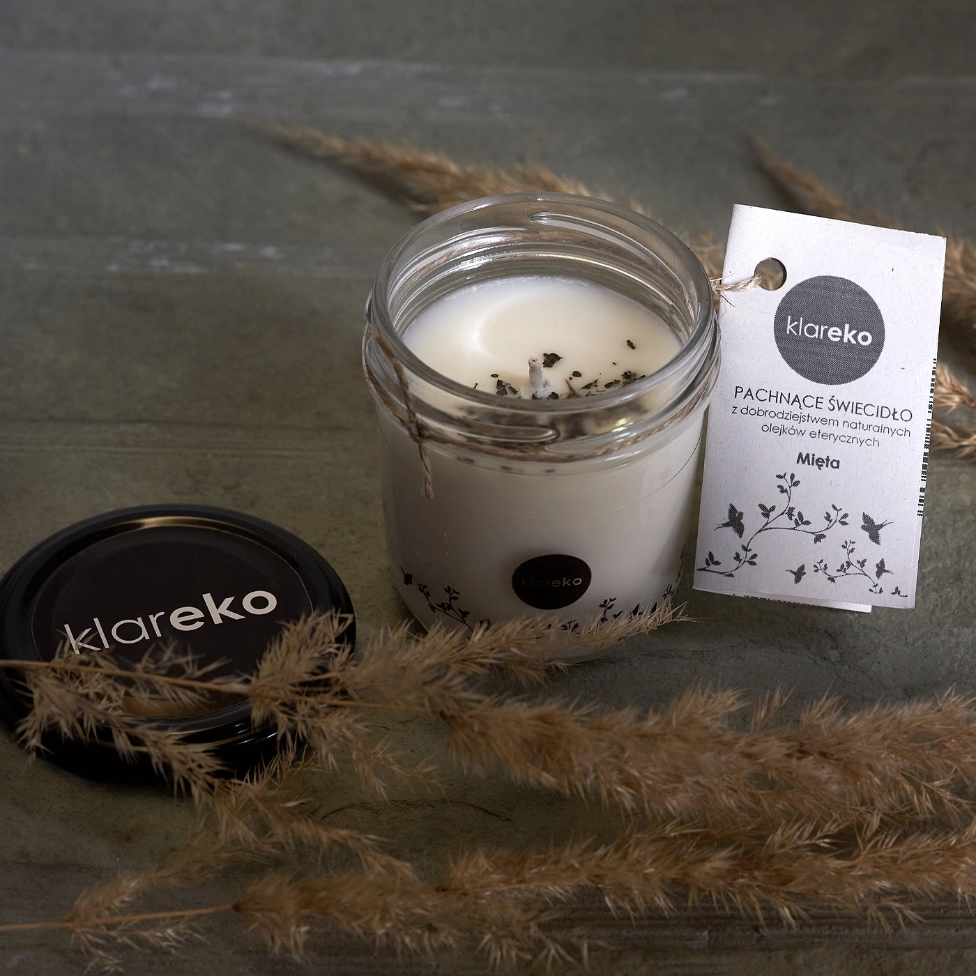Ontdek de frisse muntgeur in de natuurlijke KLAREKO-kaars, handgemaakt van pure sojawas en verrijkt met natuurlijke munt-etherische oliën. De kaars brandt gelijkmatig en produceert geen roet, waardoor ze vriendelijk is voor je gezondheid en interieur. Dankzij de compacte afmetingen past ze in elke ruimte en vult ze zowel een moderne als minimalistische stijl perfect aan.