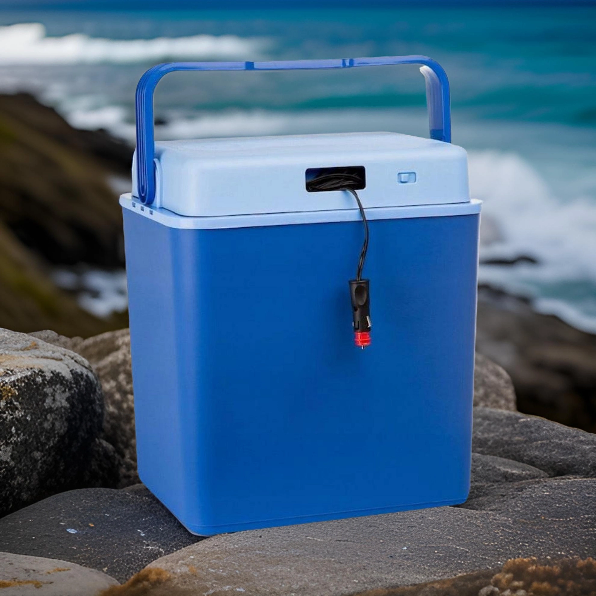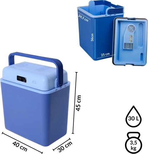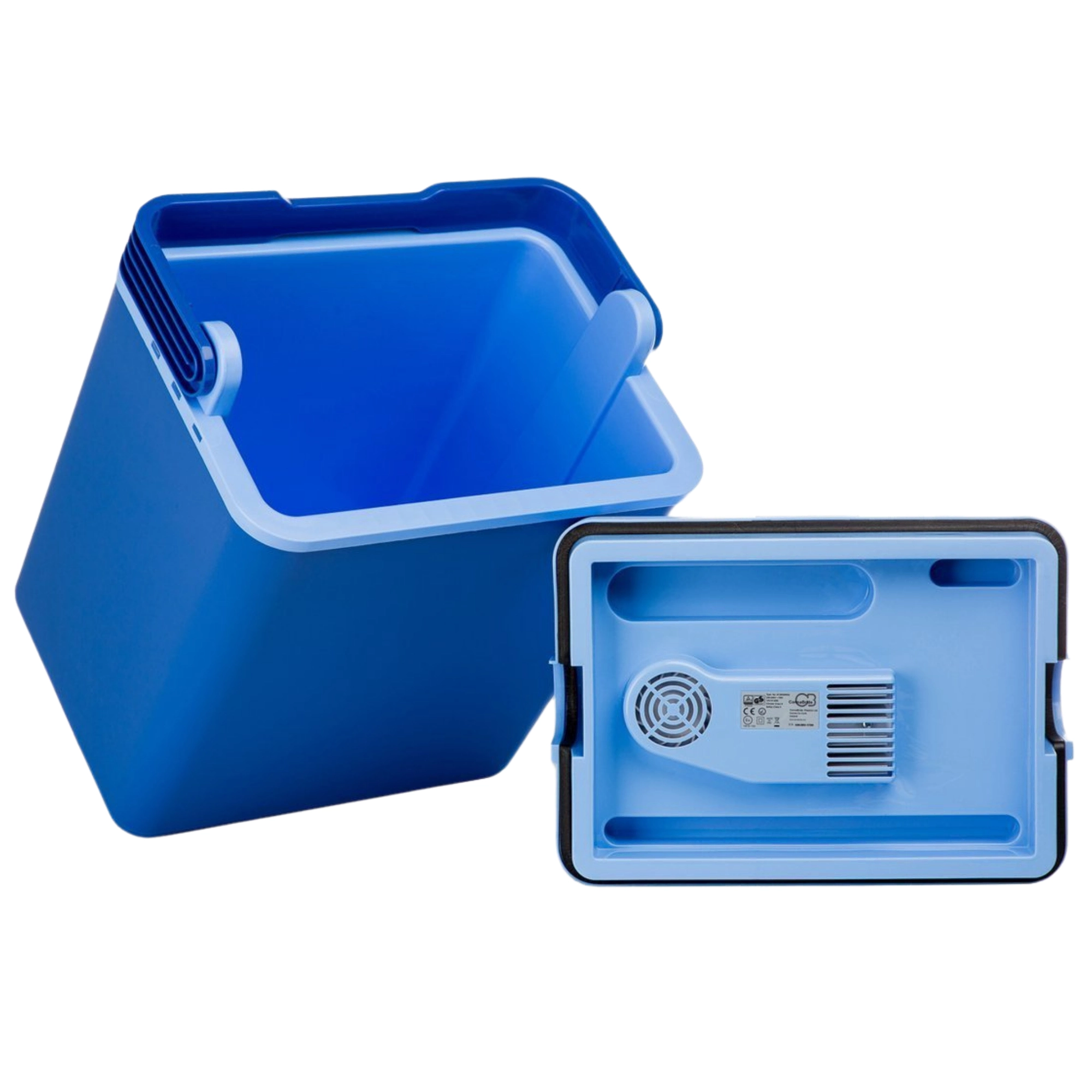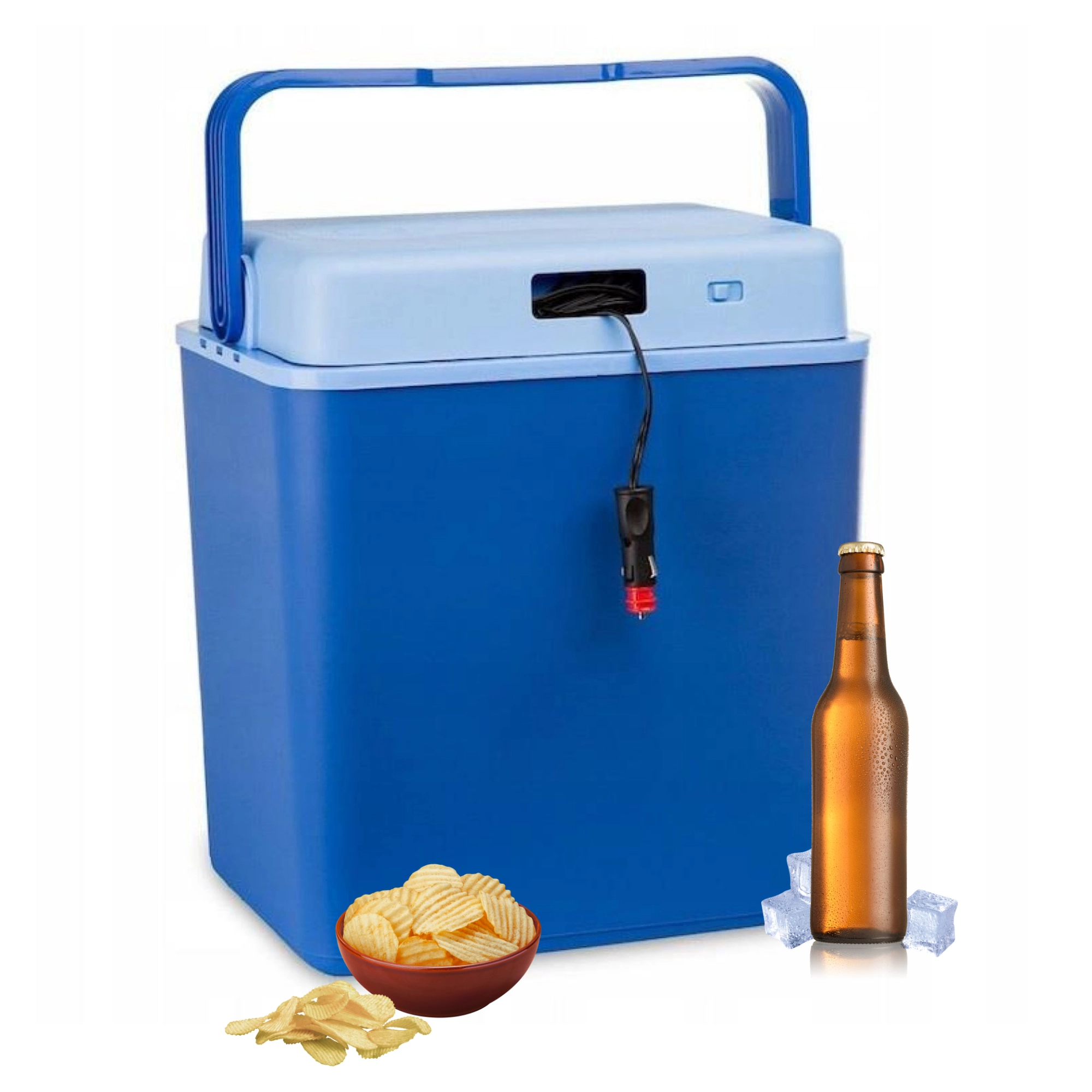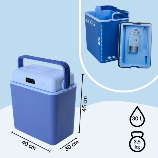Praktische draagbare autokoelbox met een inhoud van 30 l voor voeding via de 12V‑aansluiting in de auto houdt je drankjes en etenswaren koel onderweg. Maakt gebruik van een Peltier‑element voor efficiënte koeling zonder schadelijke chemicaliën, biedt een ruim interieur voor 1,5 l‑flessen in verticale positie en heeft een stevige, duurzame constructie met een vergrendelbare draaggreep en een geïntegreerde ventilator voor gelijkmatige luchtcirculatie.