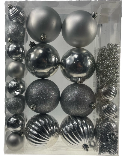 Een elegante set zilverkleurige kerstornamenten die elke boom laat stralen. Bevat verschillende vormen en afwerkingen voor een harmonieuze, feestelijke look. Dankzij het lichte materiaal zijn de ornamenten veilig voor kinderen en huisdieren en eenvoudig op te hangen. Zilveren tinten weerkaatsen het licht en creëren een betoverende feestelijke sfeer.