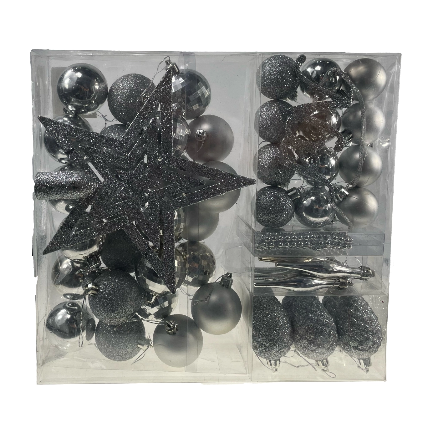 Een elegante set kerstversieringen van 48 stuks in een uniforme zilveren kleur die je boom een klassieke en feestelijke uitstraling geeft. Het lichte kunststof materiaal is breukbestendig, ideaal voor gezinnen met kinderen. De set bevat ballen in verschillende vormen en maten, een kralenguirlande en een piek in stervorm voor een complete en harmonieuze decoratie.