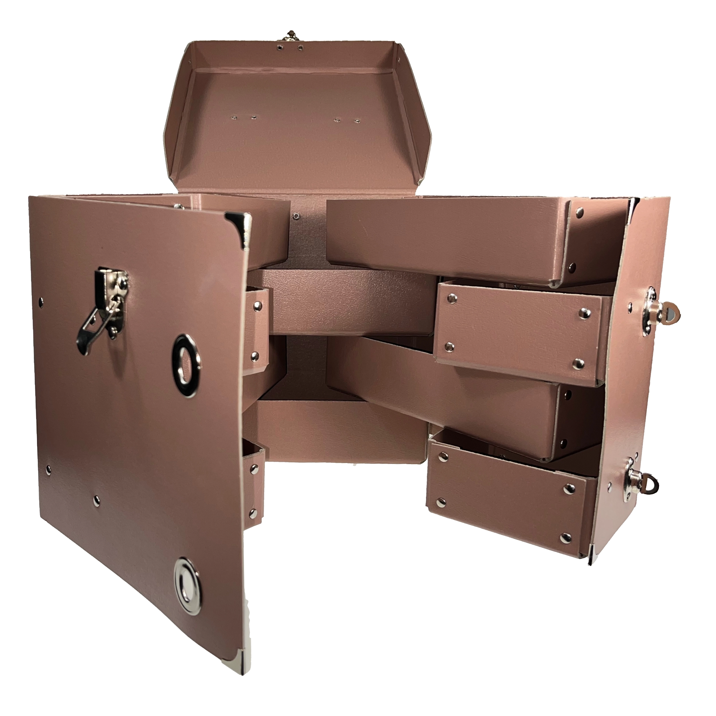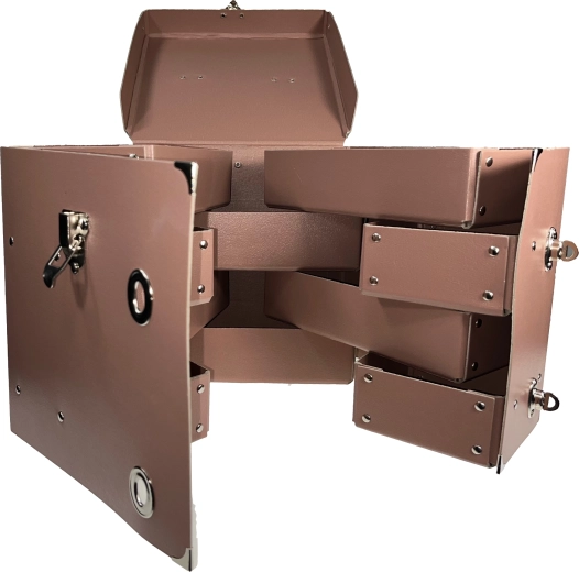 Drievoudige metalen sluitingen houden het deksel stevig vast en voorkomen onbedoeld openen tijdens vervoer en opslag.