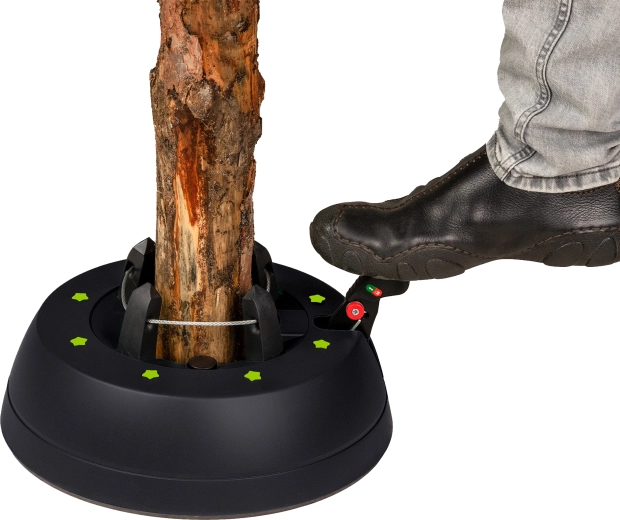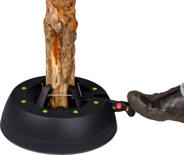 Plaats de stam op de centrale pin en bedien de hendel – de binnenklemmen trekken de boom direct aan met een stalen kabel. De hendelvergrendeling voorkomt ongewenst lossen.