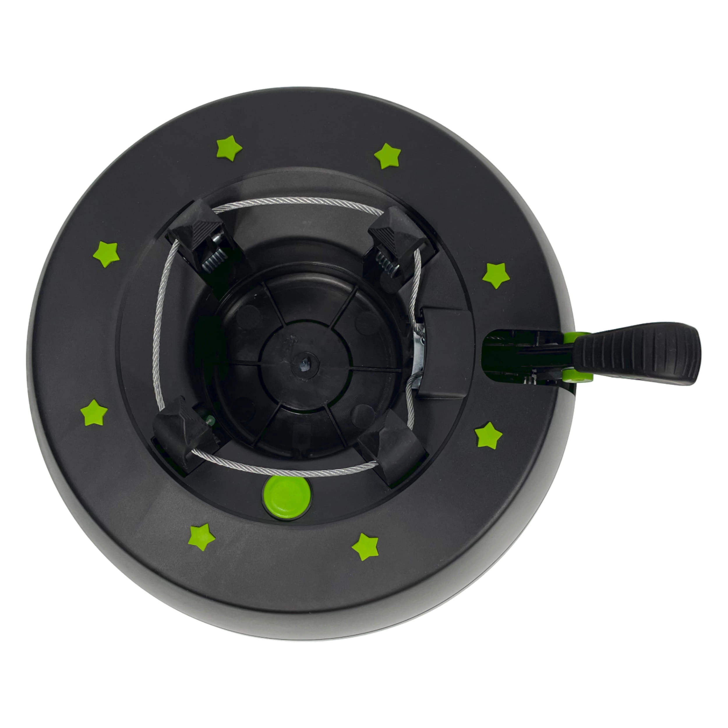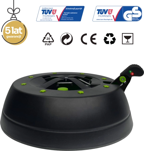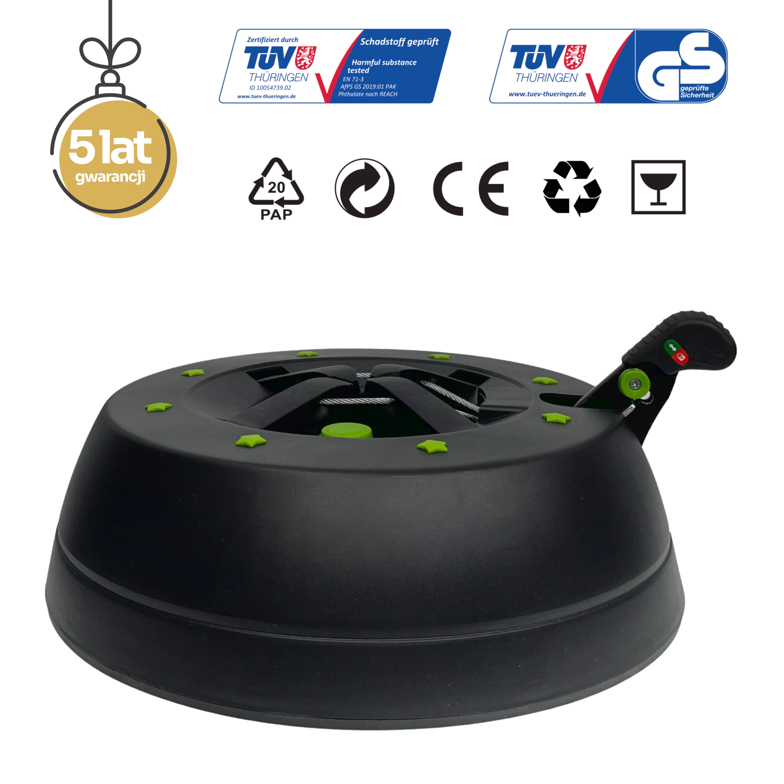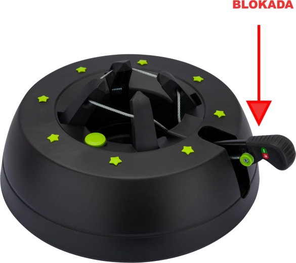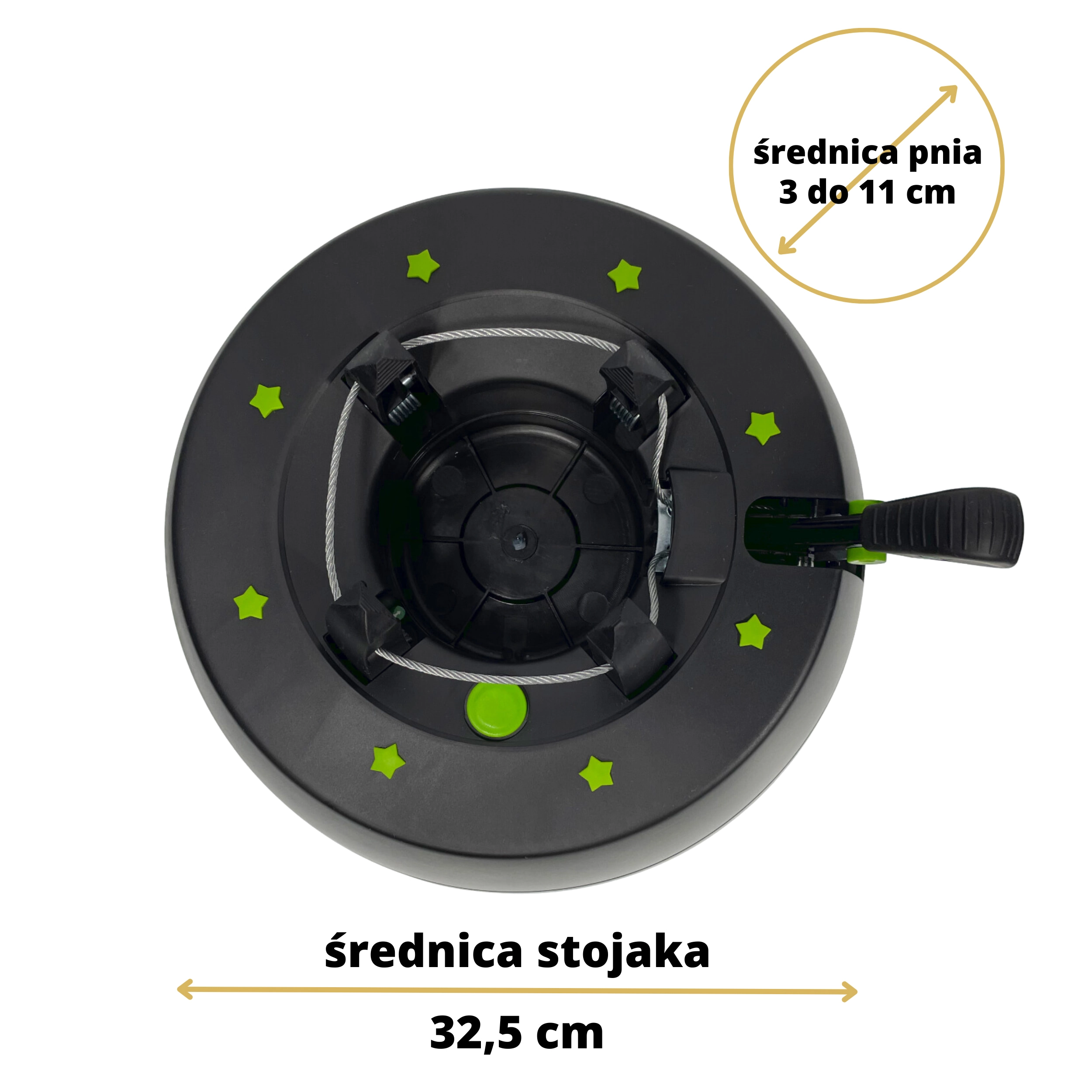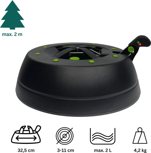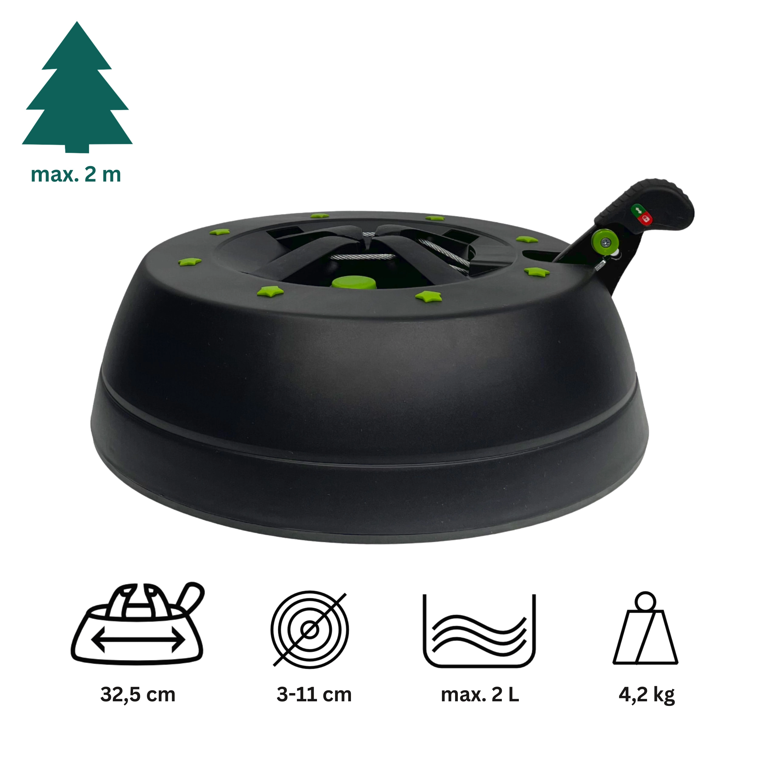 De praktische kerstboomstandaard Kamai Start 1 Pro Nature voor bomen tot 2 m zorgt voor maximale stabiliteit en snelle bevestiging dankzij een stalen kabelmechanisme met 4 automatische klemmen. Hij heeft een brede basis, een reservoir van 2 l water met peilindicator en een veiligheidsvergrendeling van de hendel tegen onbedoeld losmaken.