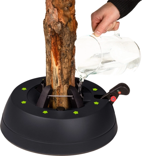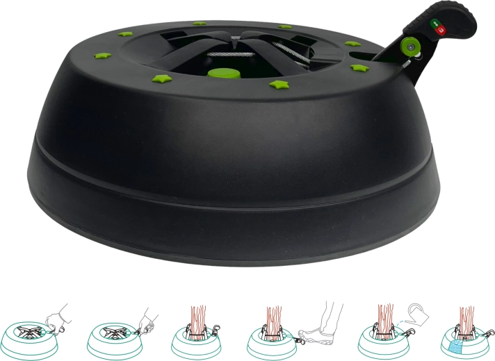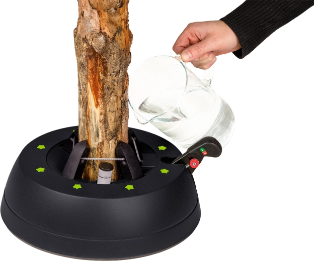 Dankzij de snelspanhendel monteert u de boom in een oogwenk: plaats de stam op de centrale pin, trap/hef de hendel enkele keren en de klemmen trekken automatisch aan. Het reservoir met een inhoud van 2 liter houdt de boom langer vers – ideaal thuis, in hotels en in commerciële ruimtes.