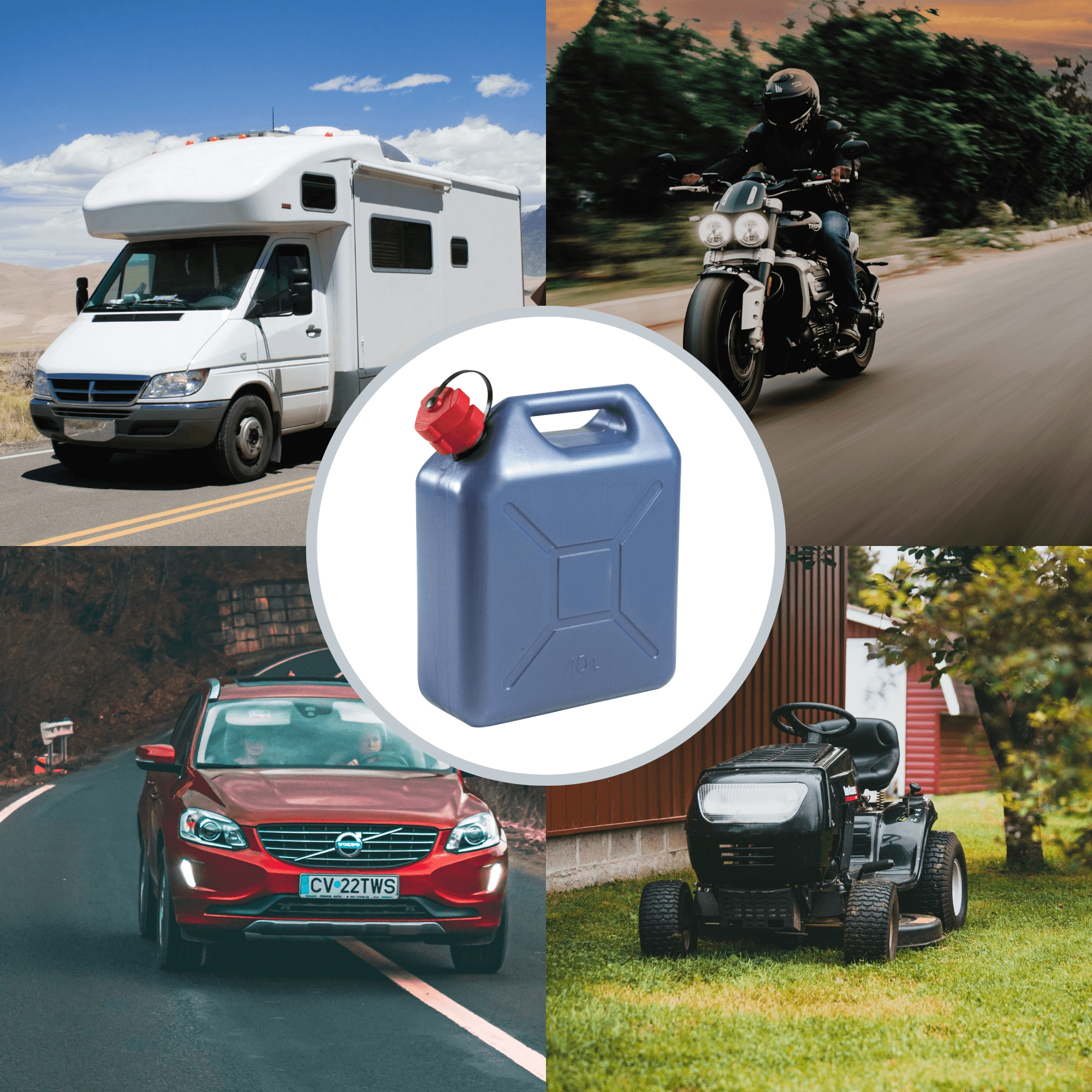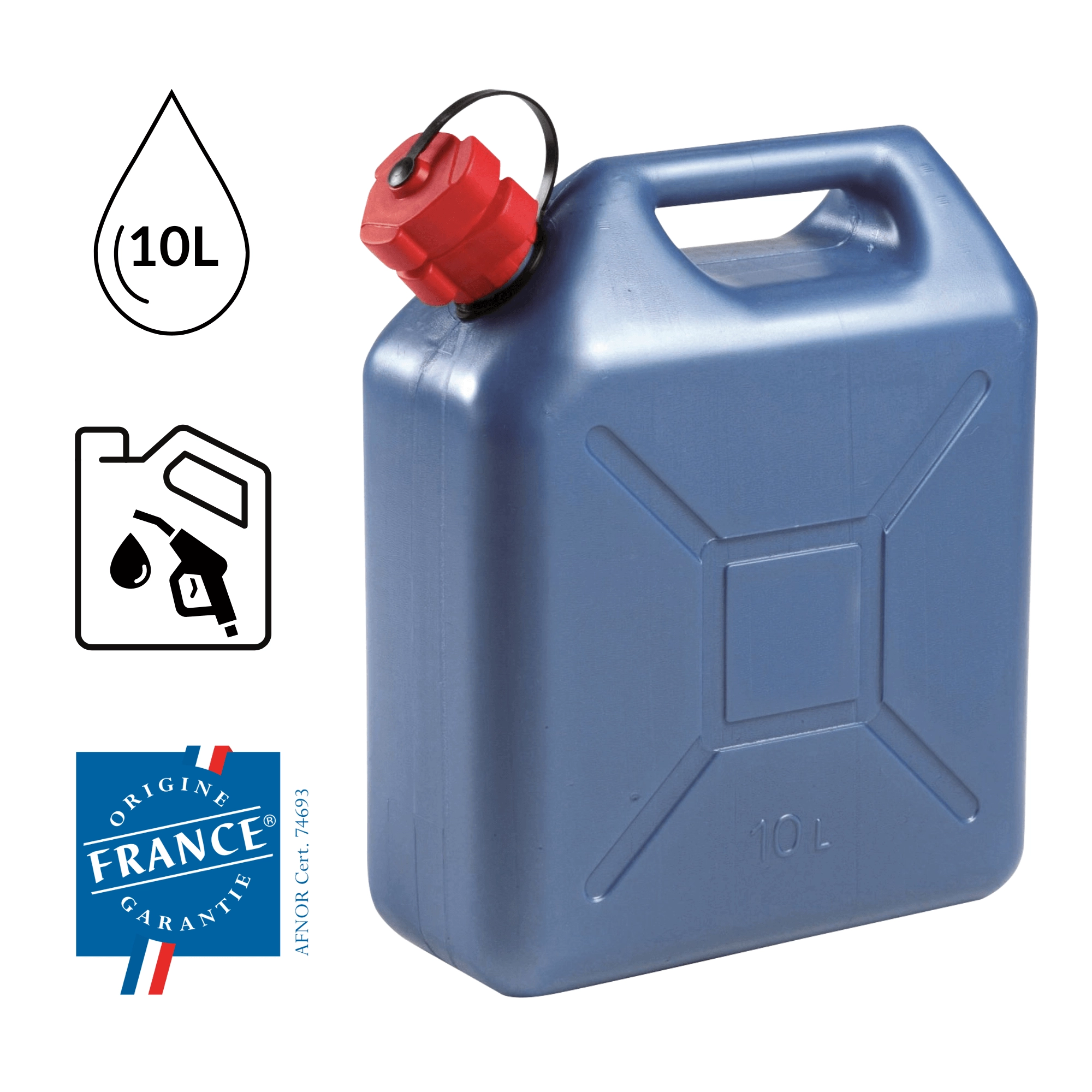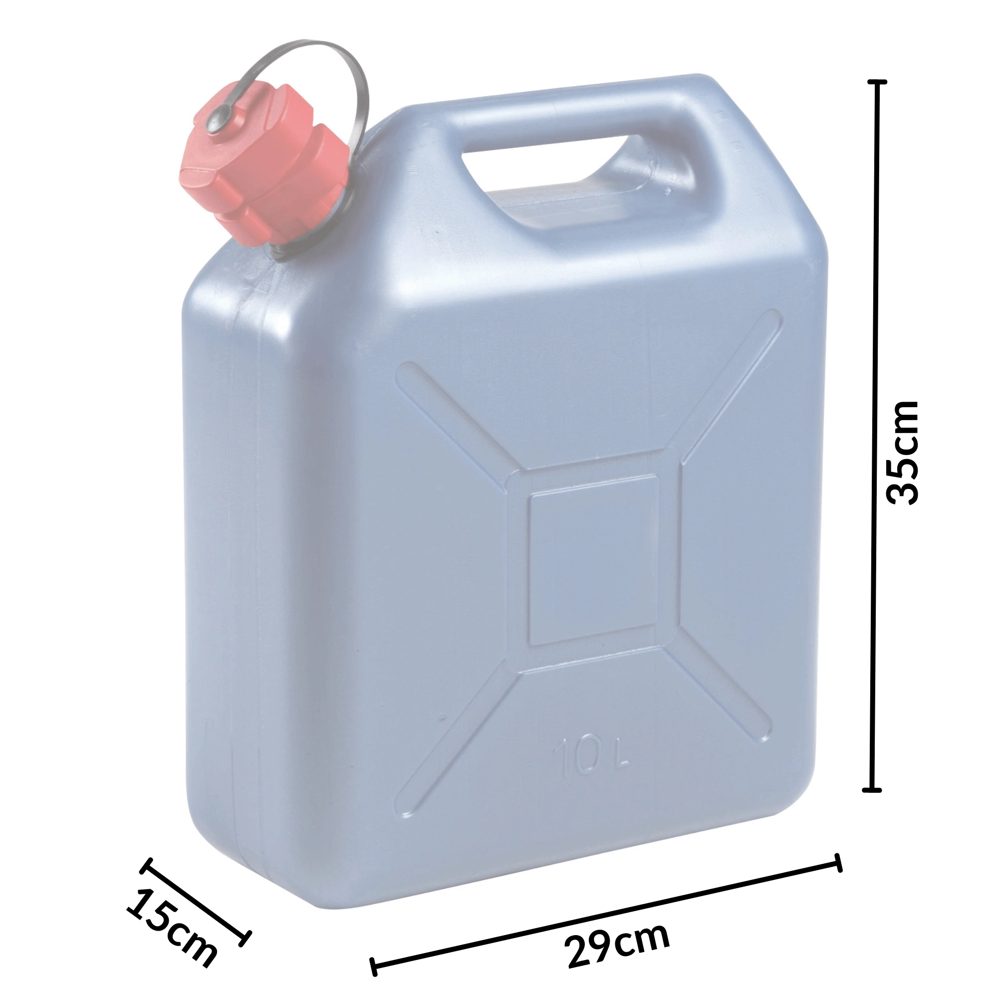Praktische brandstofkan met een inhoud van 10 l van duurzaam polypropyleen voor veilig opslaan en vervoeren. Dankzij de uitschuimbare tuit, de schroefdop en het ergonomische handvat zorgt hij voor schoon, lekvrij en comfortabel tanken zonder morsen.