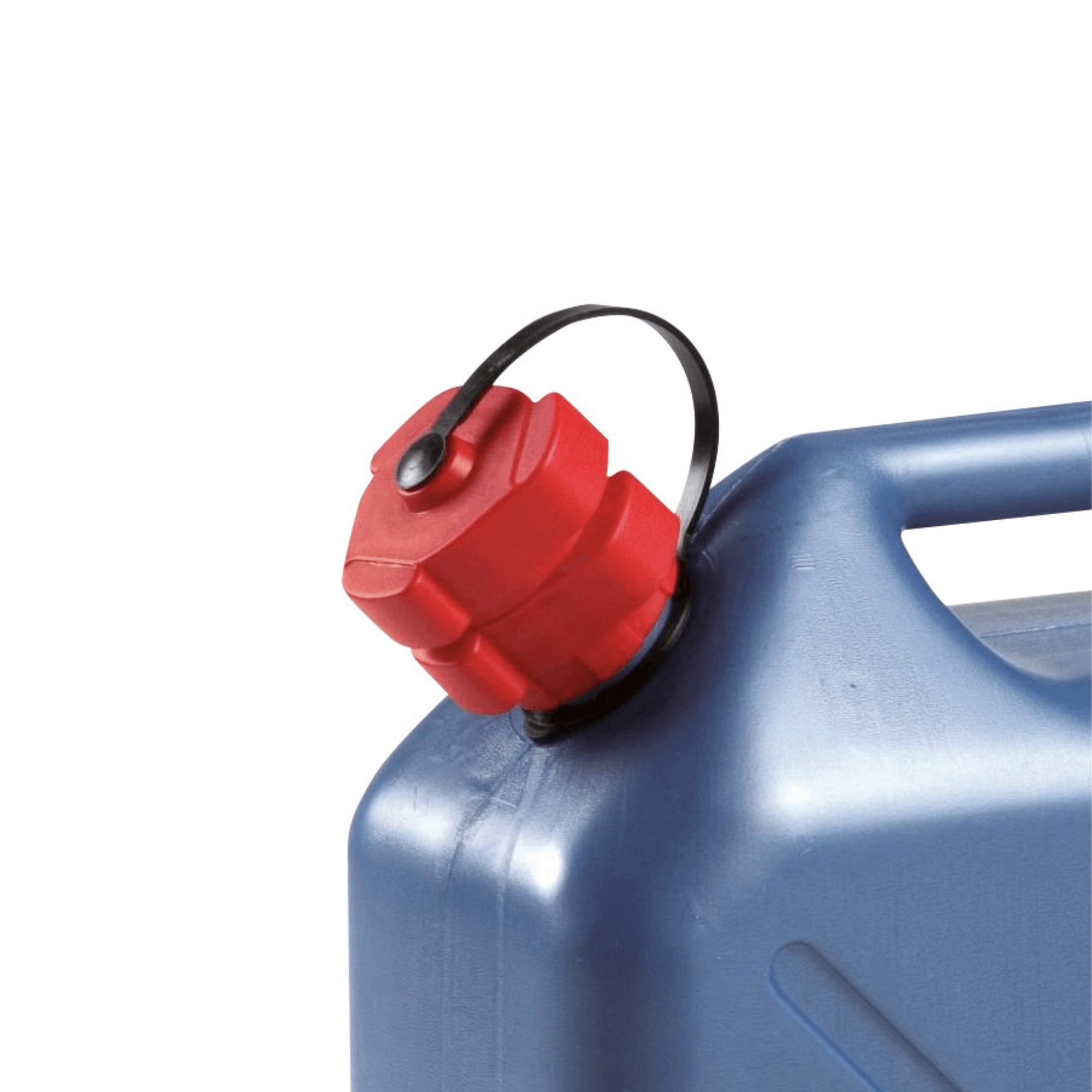 De rode schroefdop met bandje minimaliseert het risico op lekkage en helpt de brandstof tijdens het transport veilig afgesloten te houden.