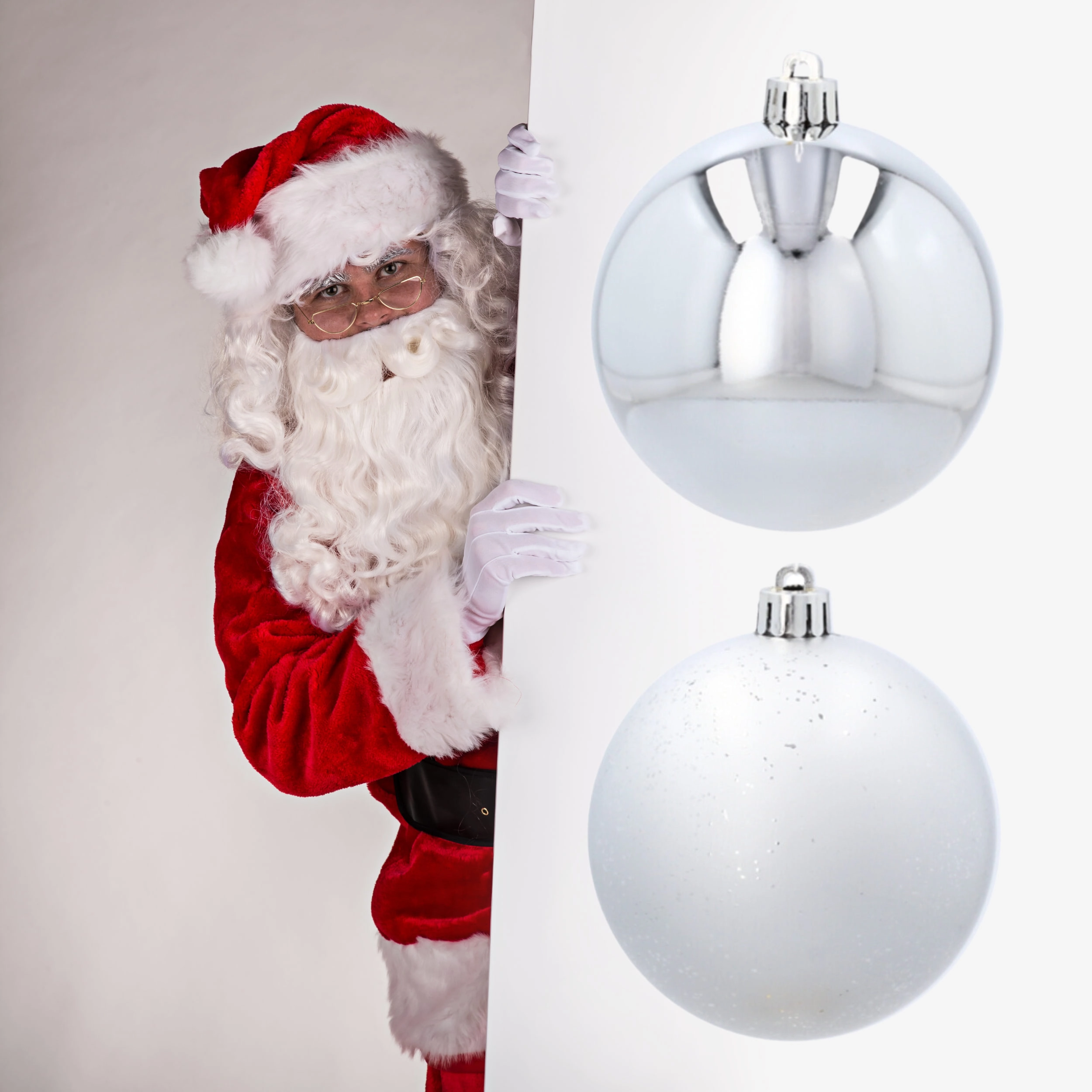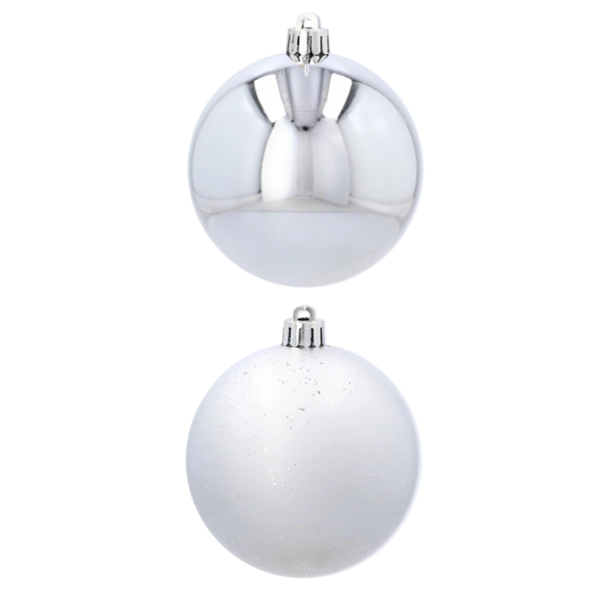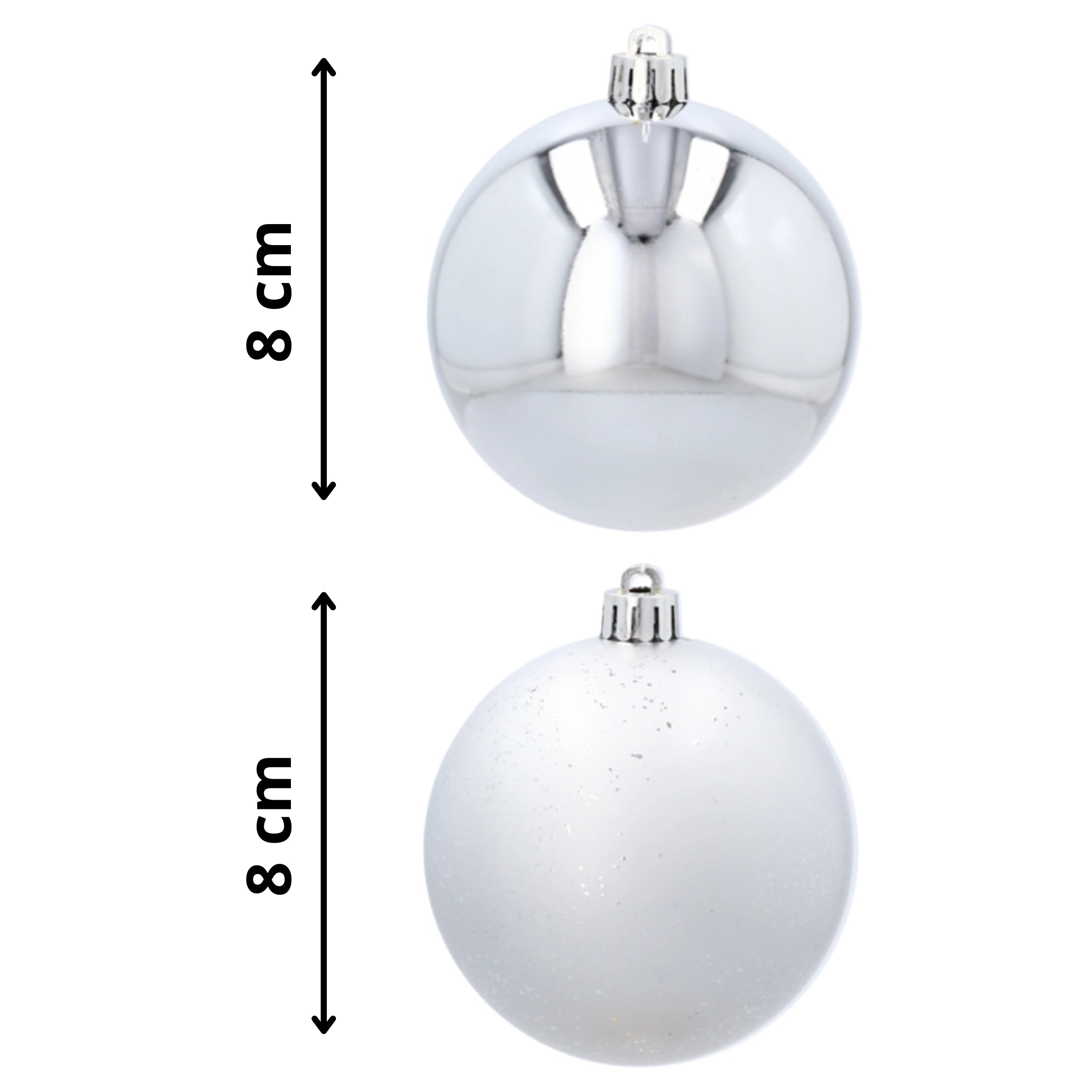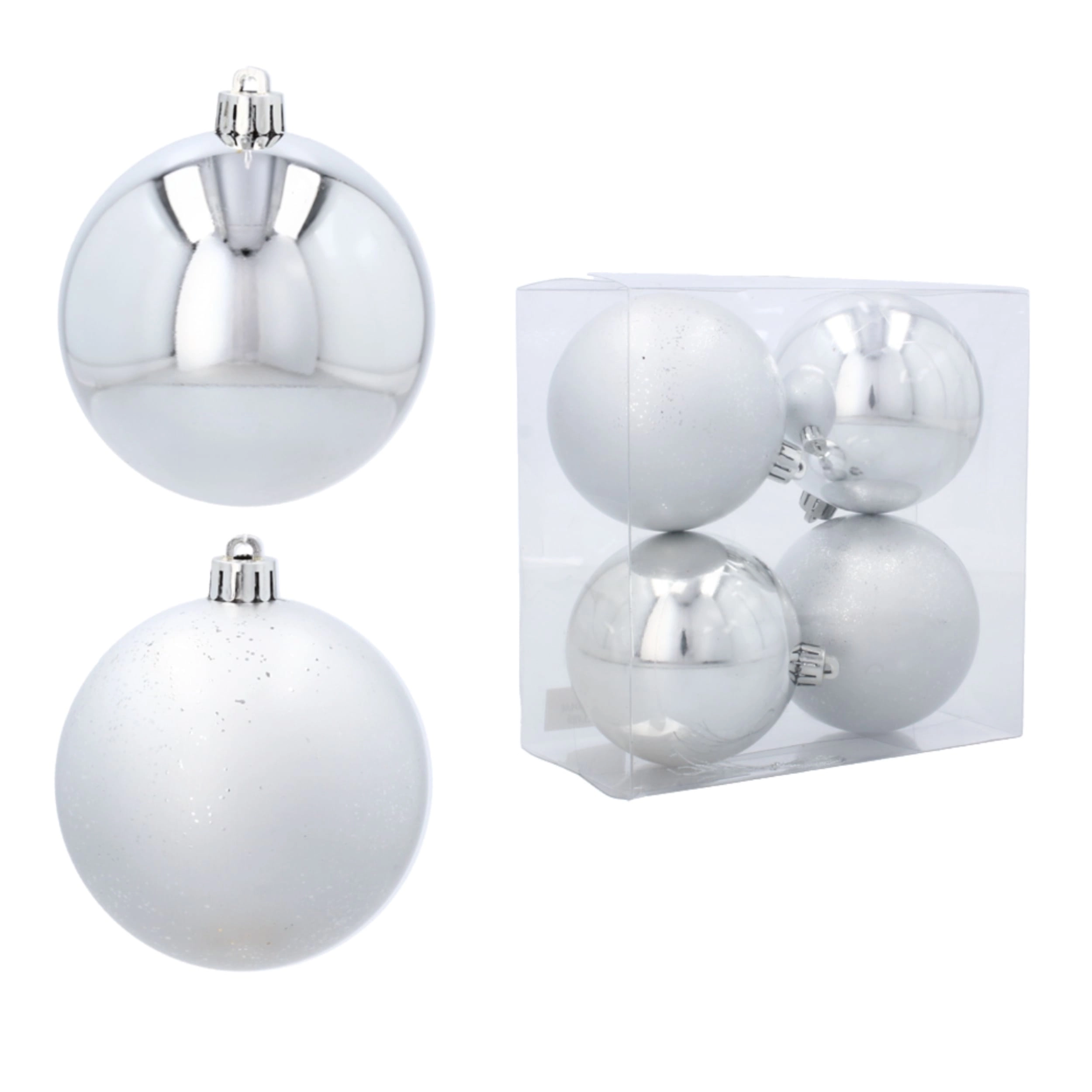 Creëer een magische feestelijke sfeer met een set van vier zilveren kerstballen met een diameter van 8 cm. Twee stuks hebben een glanzend, glad oppervlak en twee stuks een fijnkorrelige matte finish voor een gebalanceerde look zonder overdaad aan één stijl. De ballen zijn gemaakt van onbreekbaar materiaal en voorzien van zilveren koordjes voor eenvoudig ophangen.