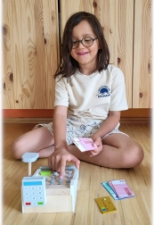 Deze duurzame kassa met minimalistisch design past perfect in de kinderkamer en speelruimte. Kinderen kunnen de prijs intoetsen, met biljetten of met een kaart betalen en basisrekenvaardigheden oefenen.