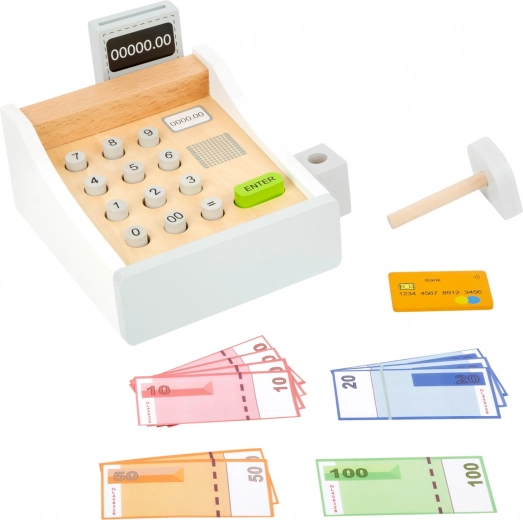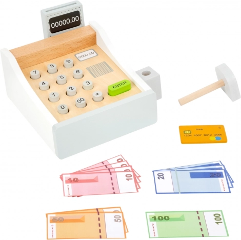 Ontdek de hoogwaardige houten kassa SMALL FOOT, die op een speelse manier kinderen leert rekenen, prijzen herkennen en sociale vaardigheden trainen tijdens het winkeltje spelen. Dankzij realistische elementen zoals een scanner, kaartlezer en geldlade voelt het spel authentiek en stimuleert het actief en betekenisvol spel.