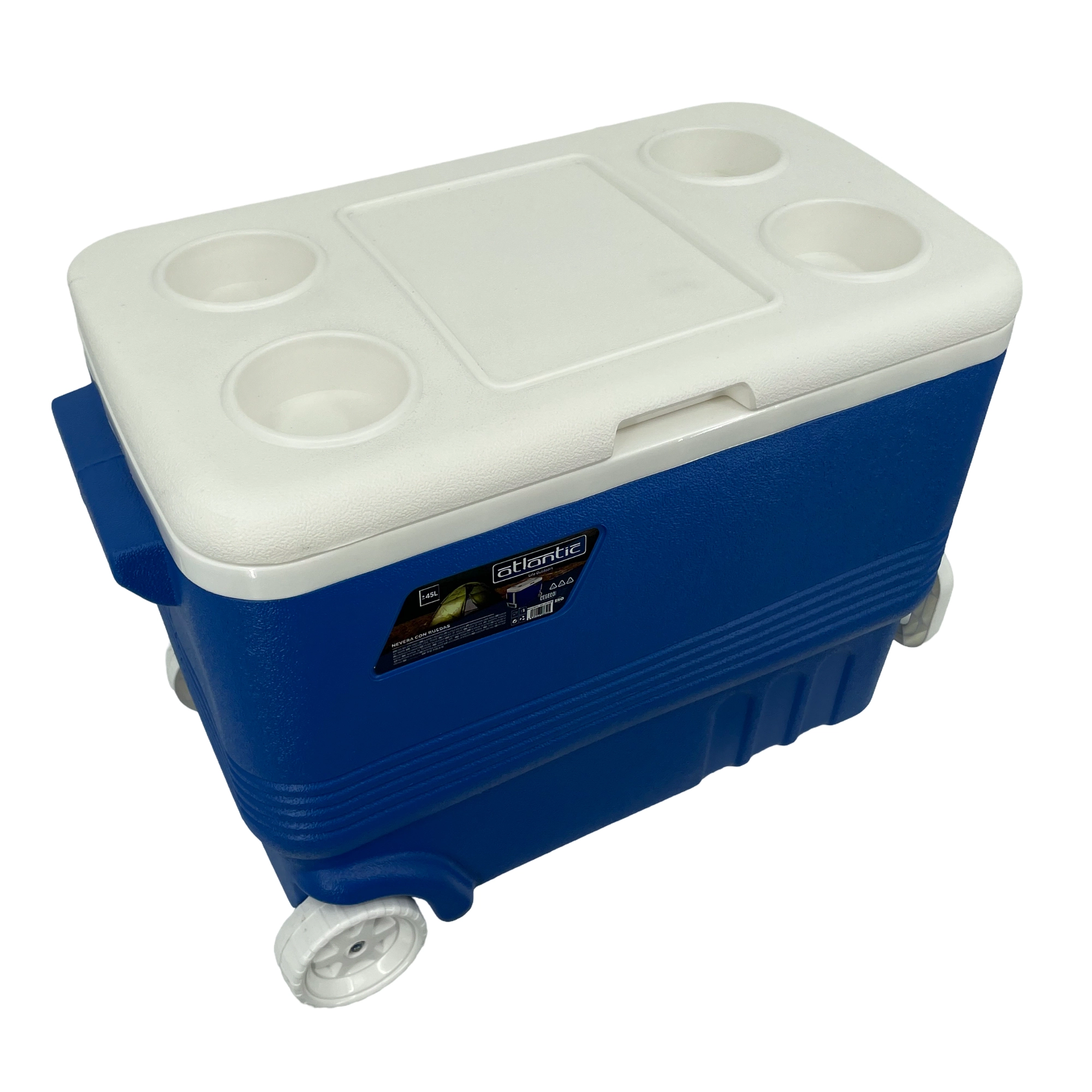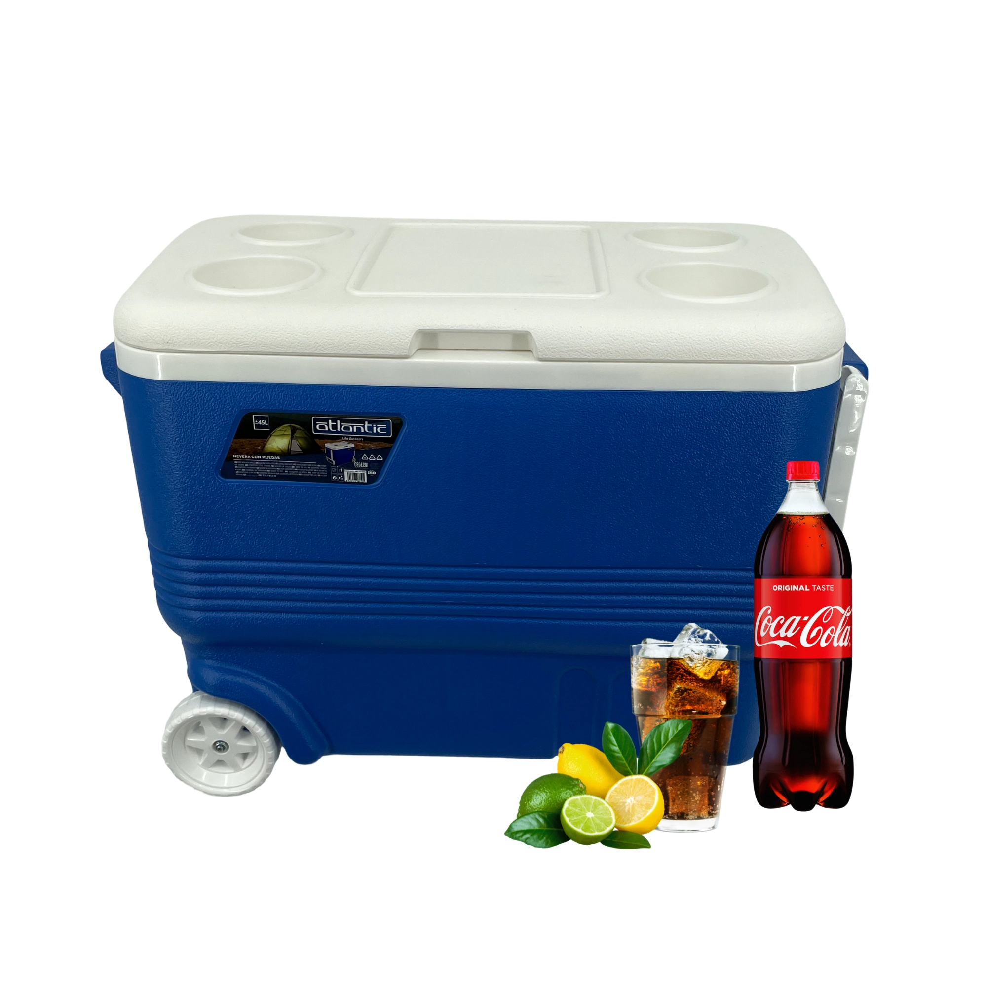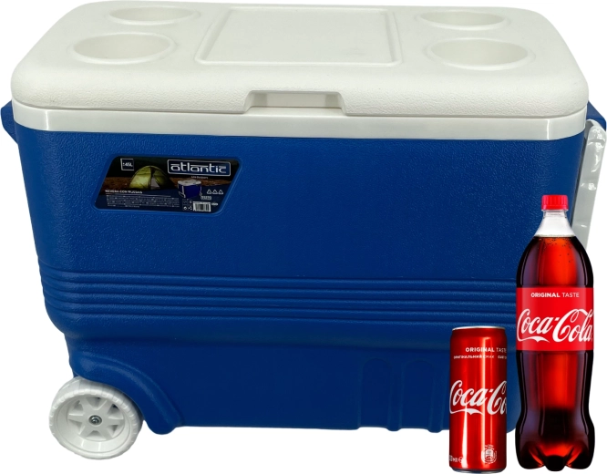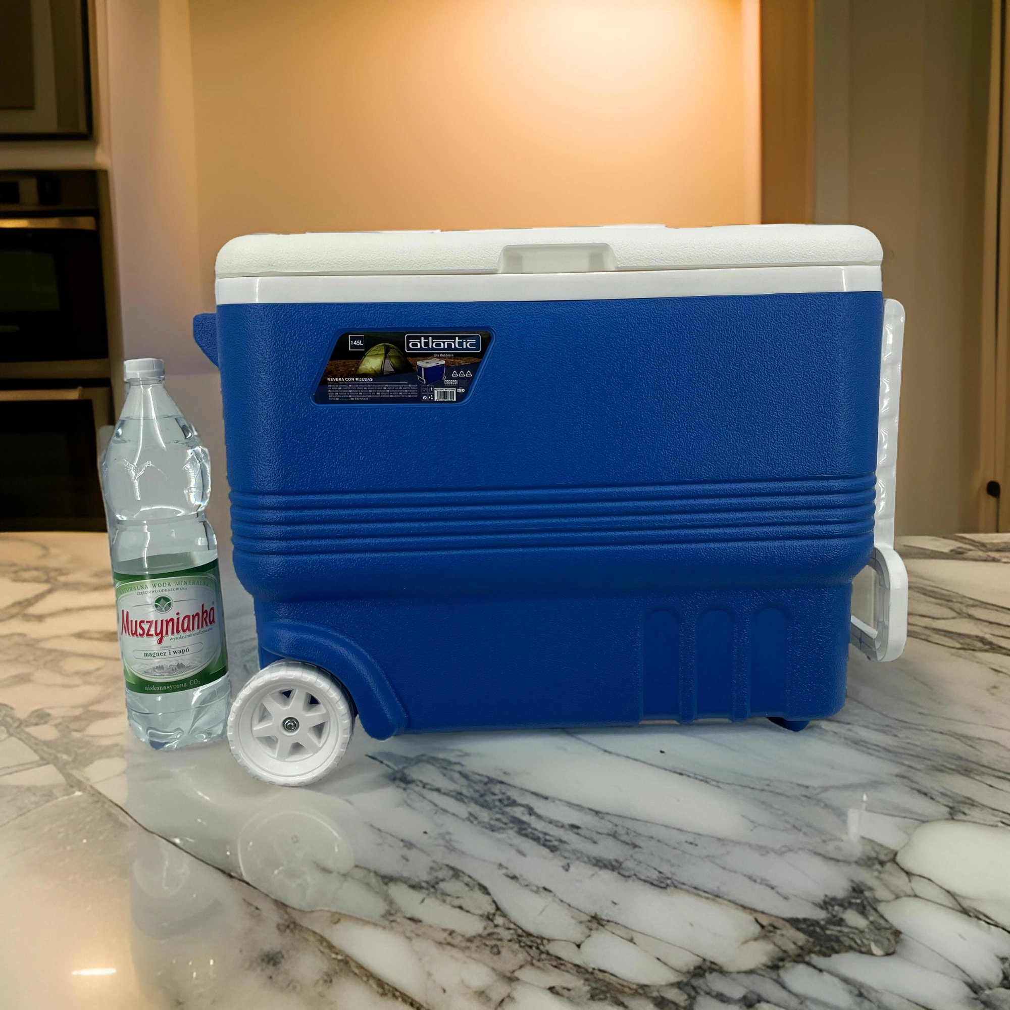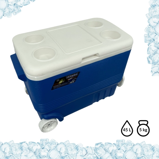 Lichte en ruime koelbox met een inhoud van 45 l, voorzien van praktische wielen en een uitschuifbare hendel. Ideaal voor uitstapjes, kamperen en het strand. Gemaakt in de EU van duurzaam polypropyleen, eenvoudig te reinigen en dankzij de hoogwaardige isolatie blijft de inhoud lang koel. In het deksel zijn bekerhouders geïntegreerd voor maximaal comfort. Grote capaciteit, eenvoudig vervoer en betrouwbare koeling voor uw drankjes en etenswaren.