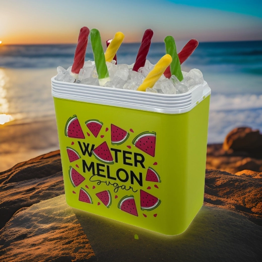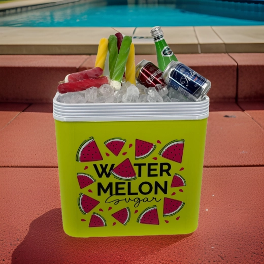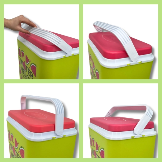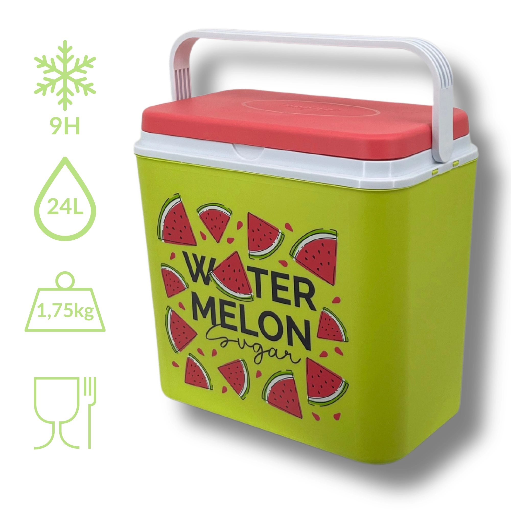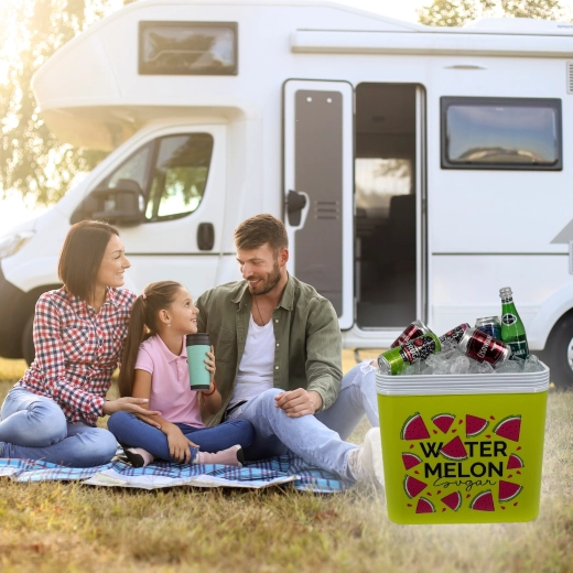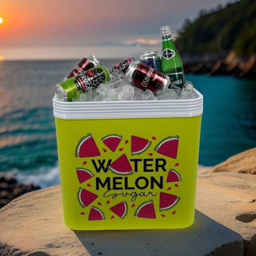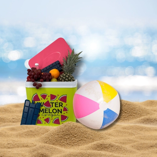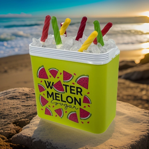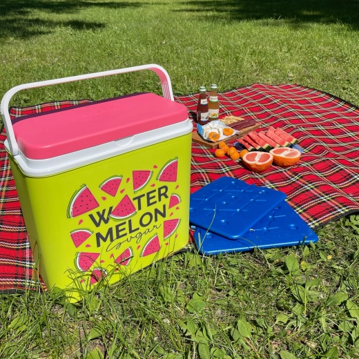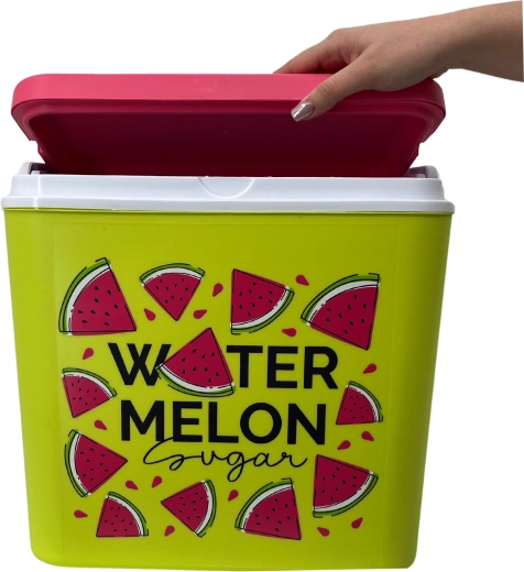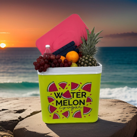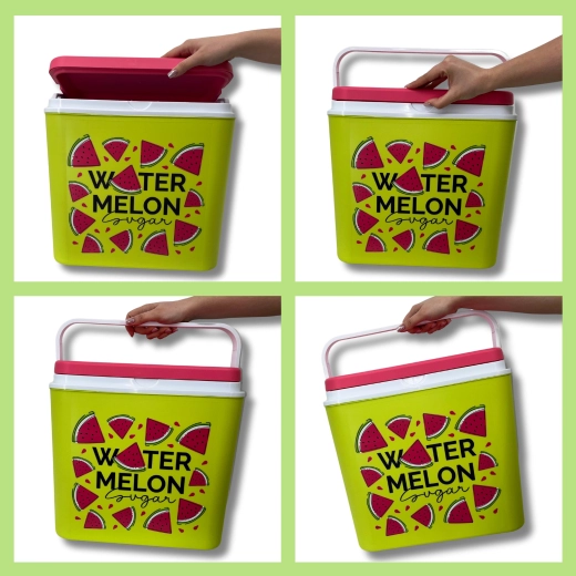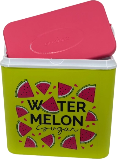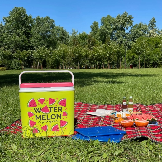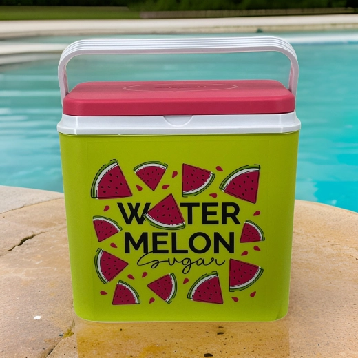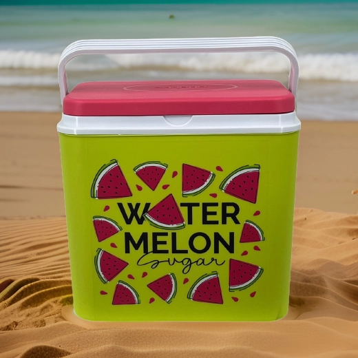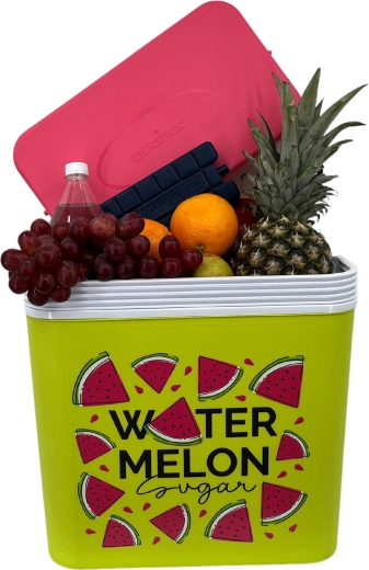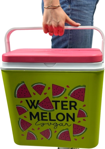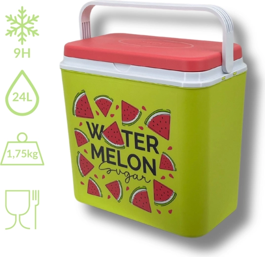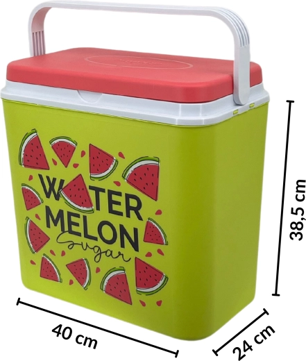 Stijlvolle passieve koelbox met een inhoud van 24 l houdt je drankjes en etenswaren lang vers dankzij de hoogwaardige isolatie en koeling met vrieselementen. Compacte afmetingen, een stevige draagbeugel voor eenvoudig transport en het zomerse WATERMELON-motief maken hem de perfecte keuze voor uitstapjes, strand en picknick. Gemaakt in de EU, veilig voor contact met levensmiddelen en gemakkelijk te reinigen.