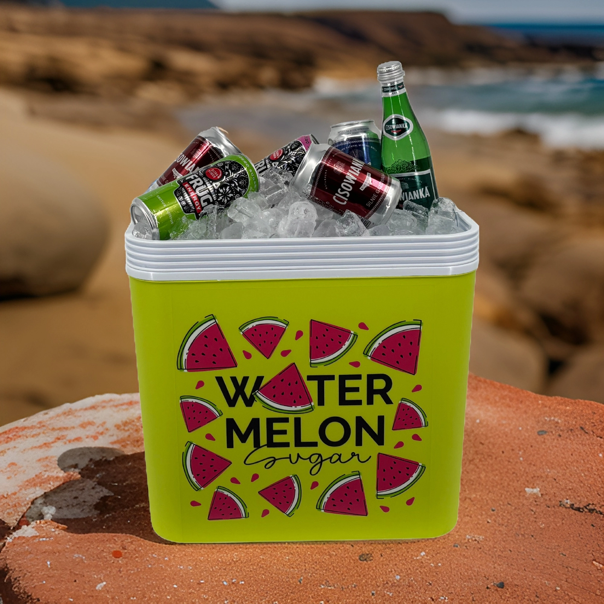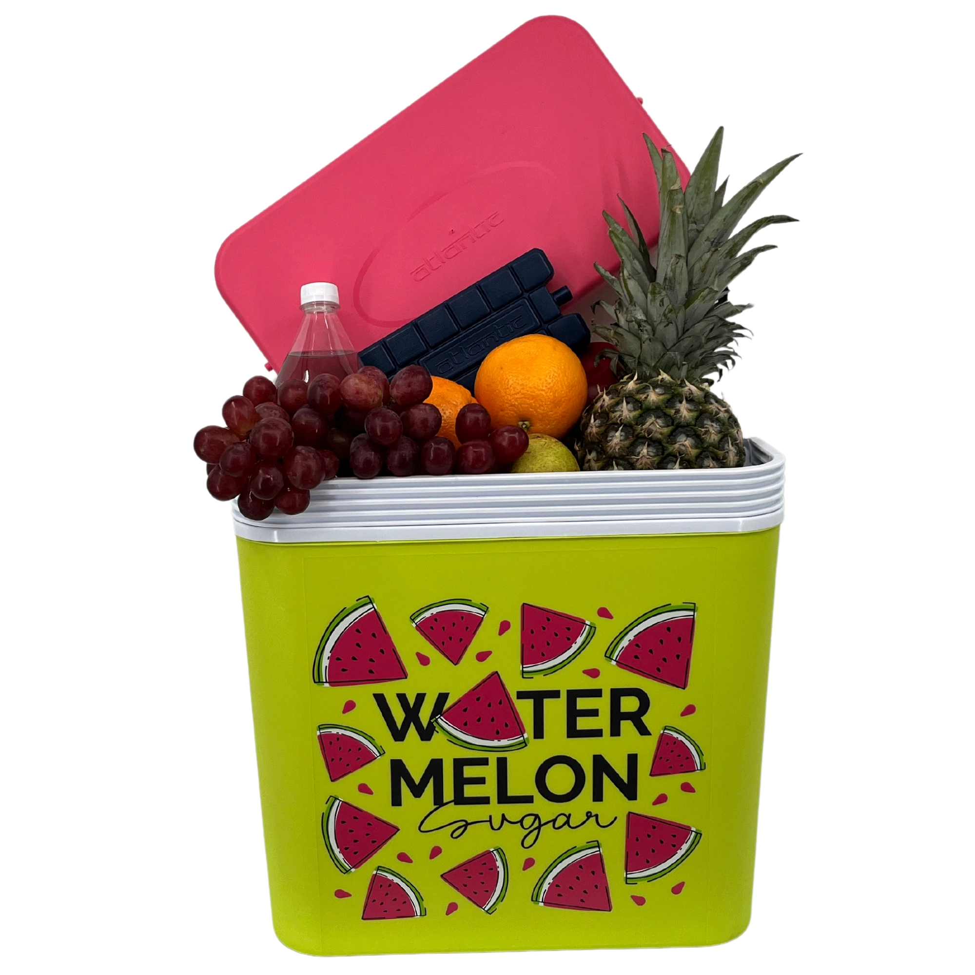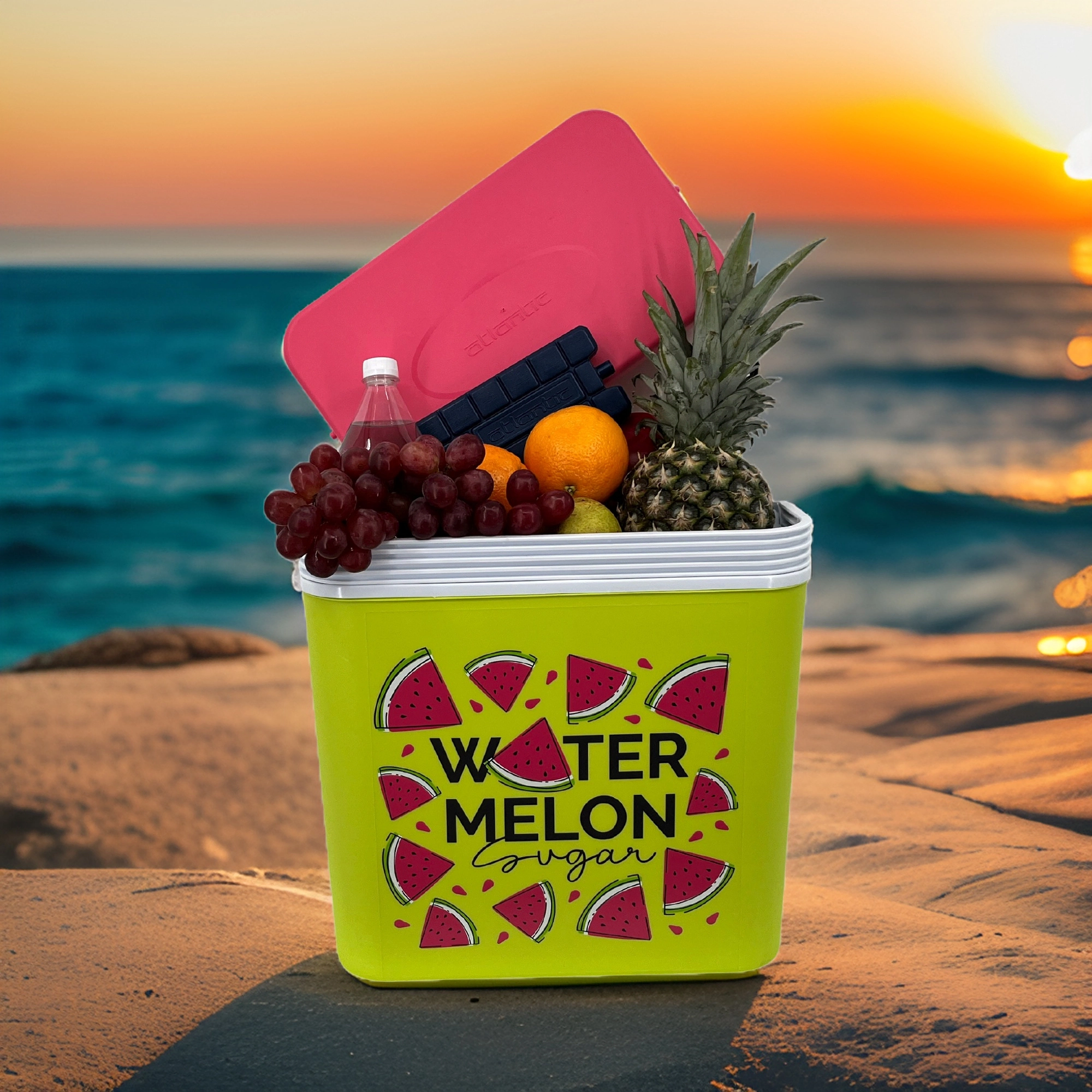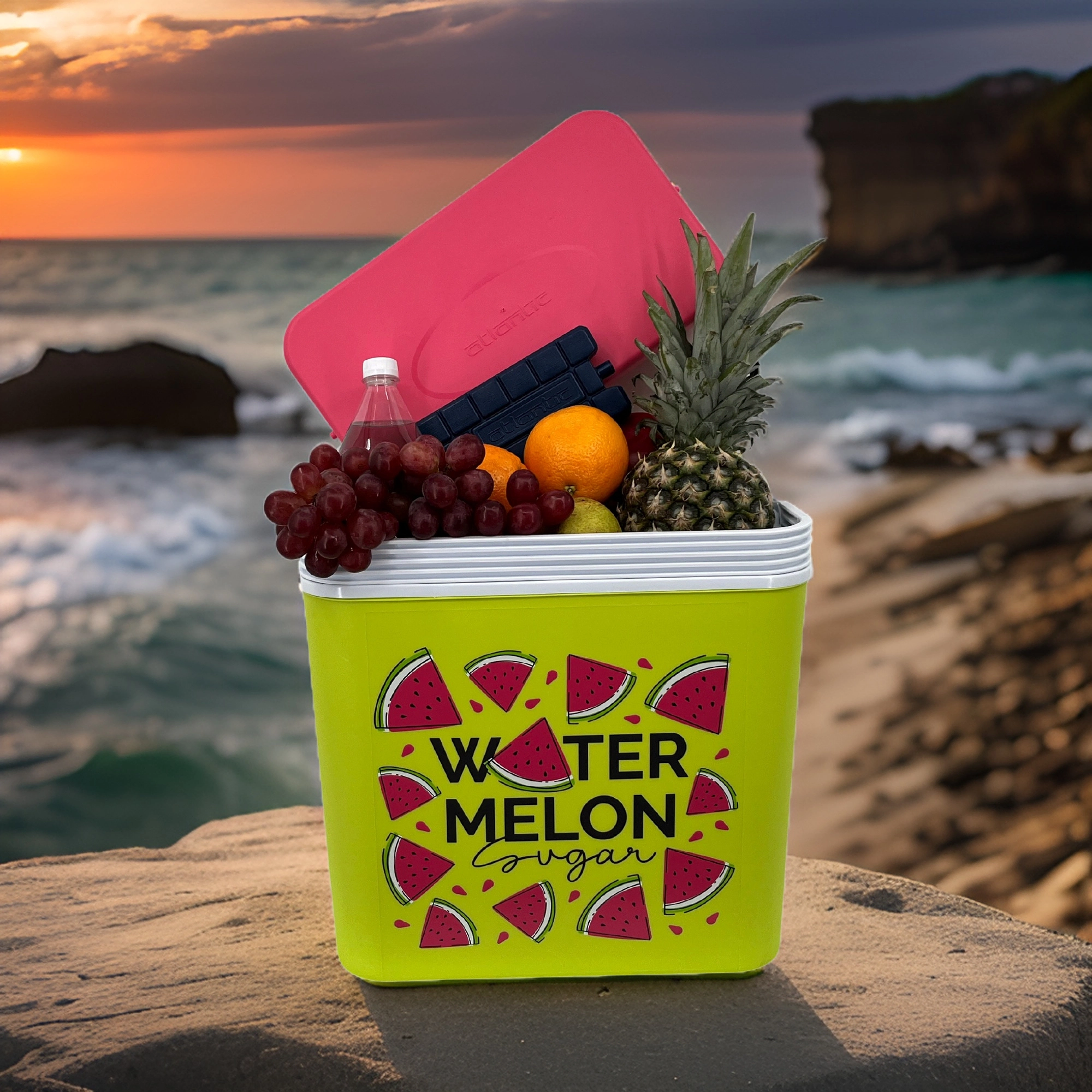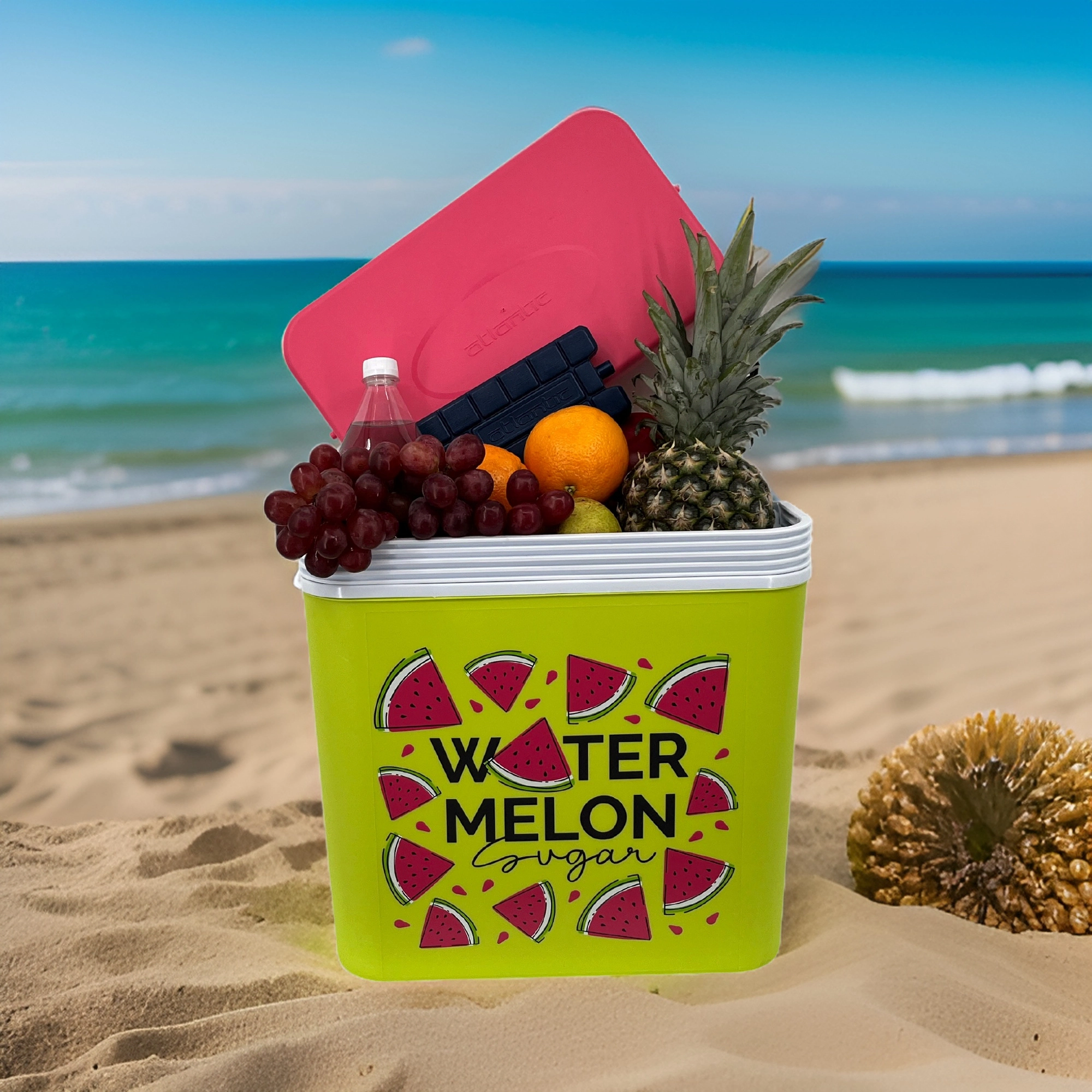Stijlvolle passieve koelbox met een inhoud van 24 l houdt je drankjes en etenswaren lang vers dankzij de hoogwaardige isolatie en koeling met vrieselementen. Compacte afmetingen, een stevige draagbeugel voor eenvoudig transport en het zomerse WATERMELON-motief maken hem de perfecte keuze voor uitstapjes, strand en picknick. Gemaakt in de EU, veilig voor contact met levensmiddelen en gemakkelijk te reinigen.