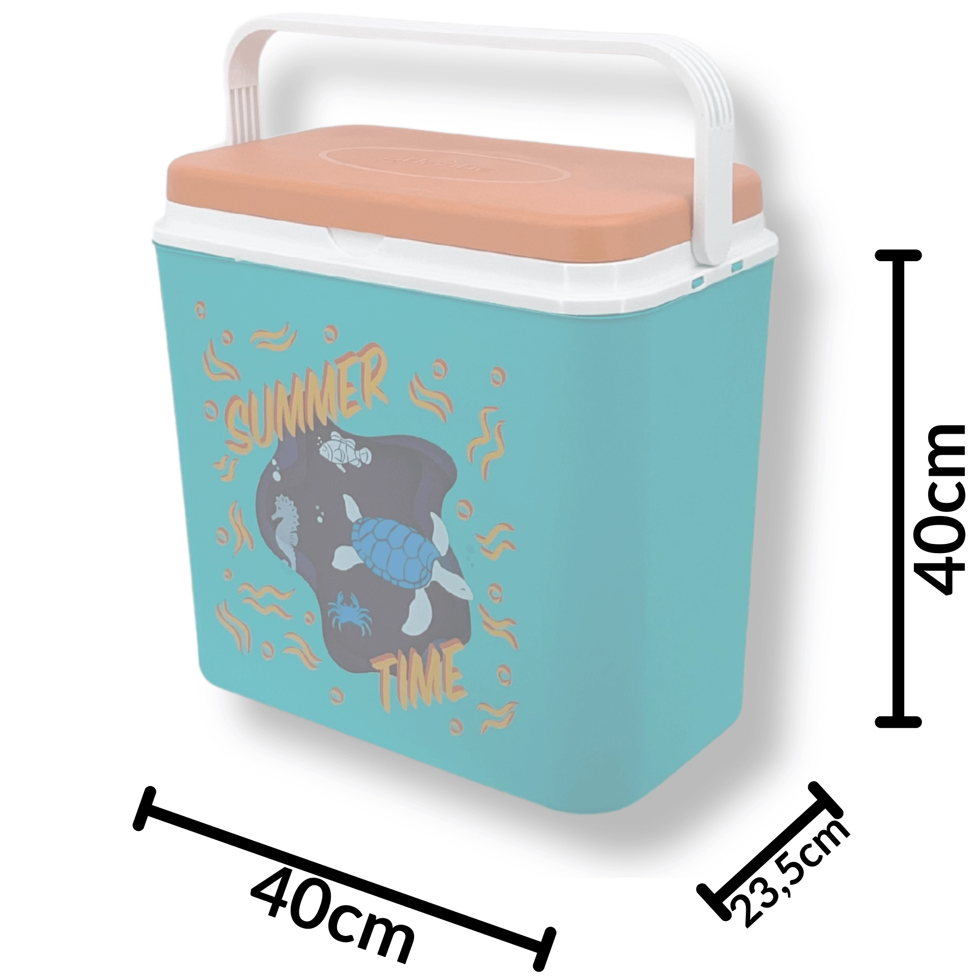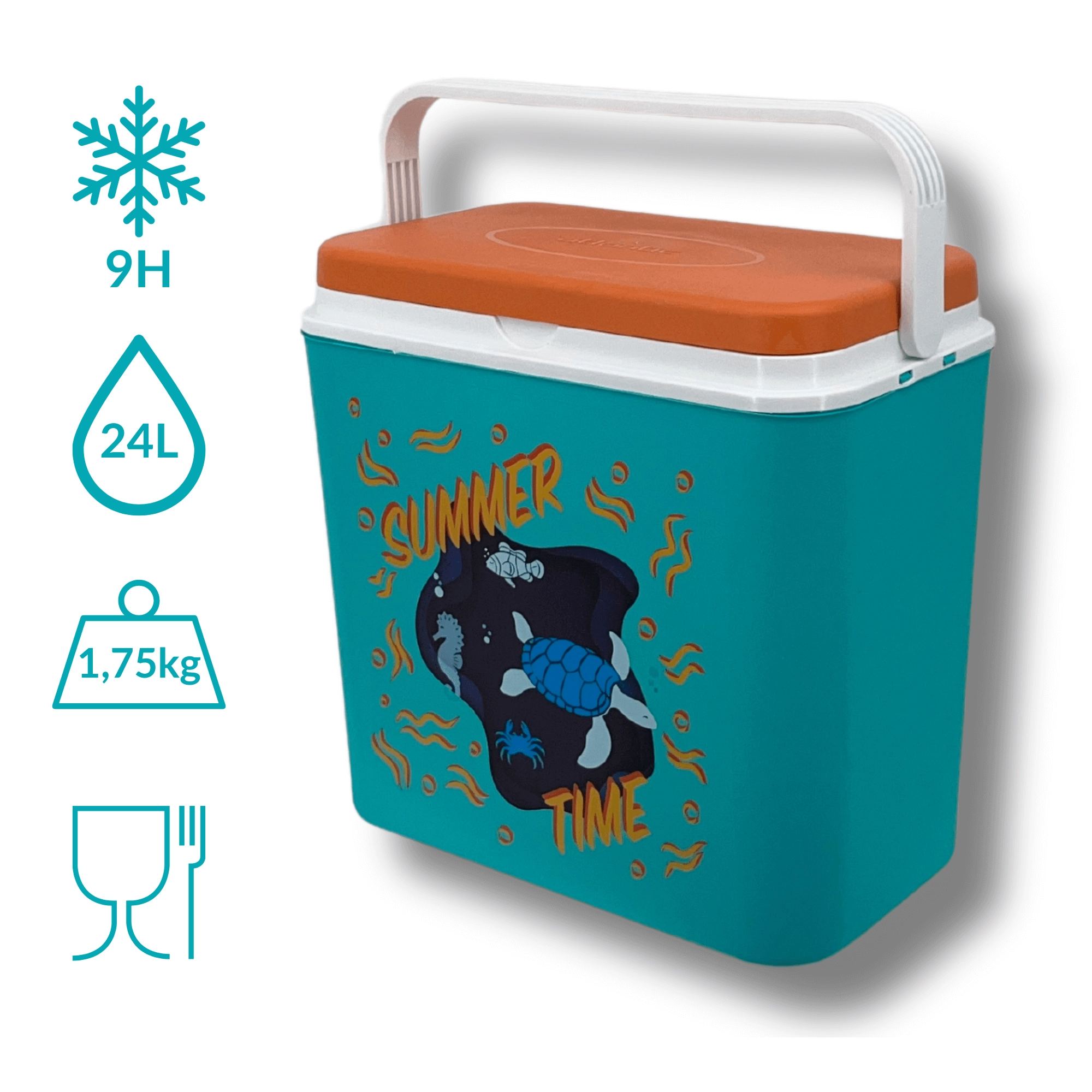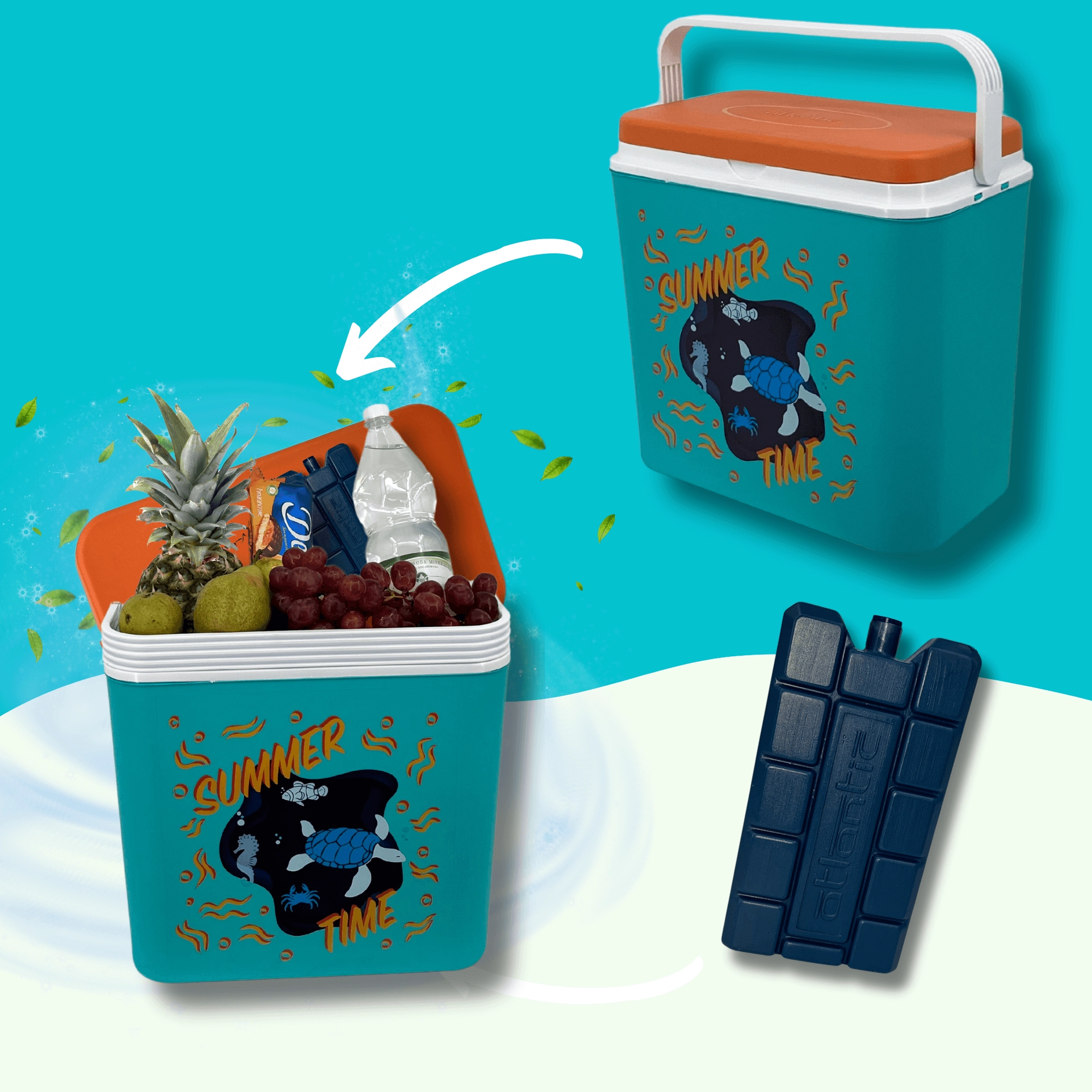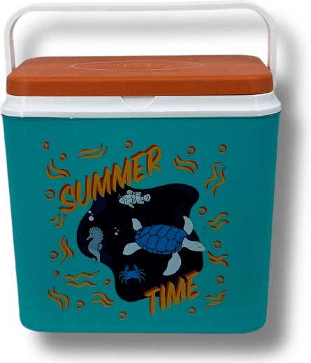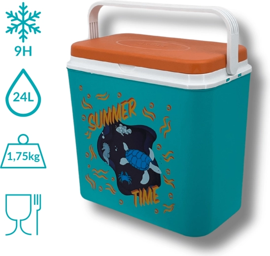 De box van duurzaam polypropyleen is eenvoudig te reinigen en de compacte constructie past in auto, camper en boot. De binnenhoogte maakt het mogelijk een 2 l fles rechtop te plaatsen; binnenin passen tot acht flessen van 1,5 l of drie van 2 l naast elkaar. De zomerse print met een schildpad en een zeepaardje en het contrasterende deksel geven de box een aantrekkelijke look.