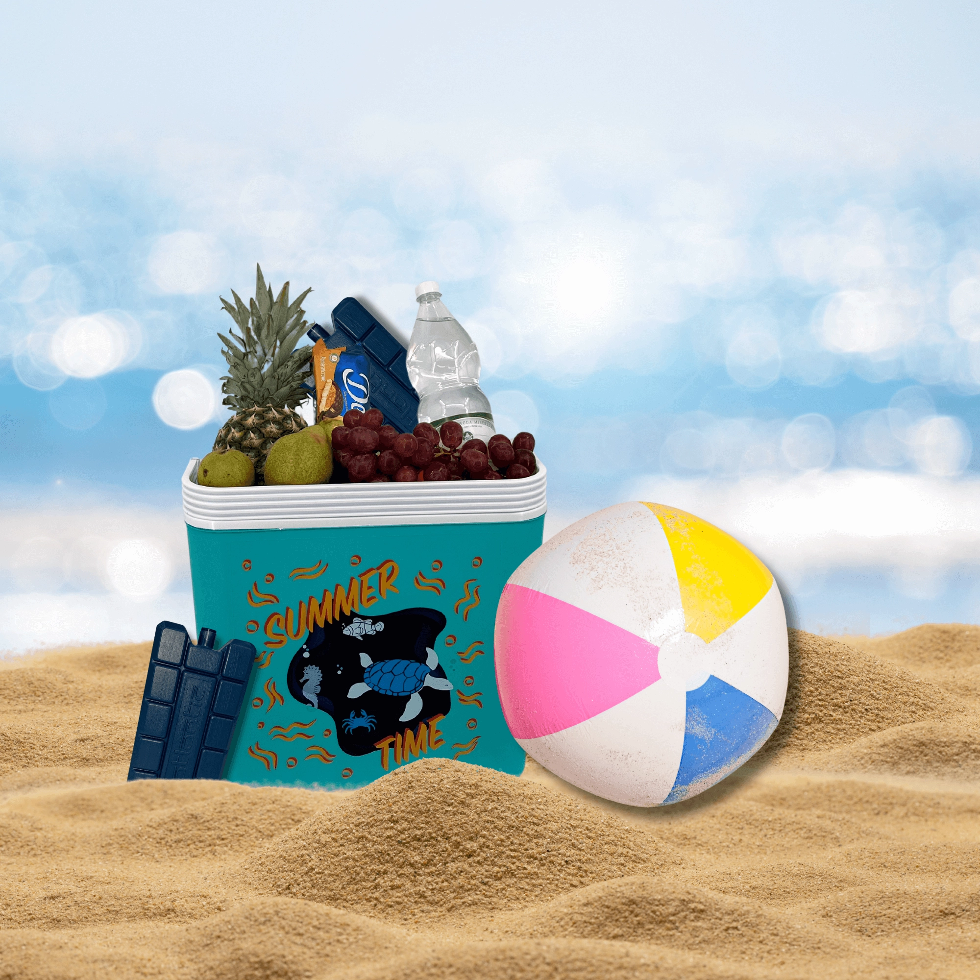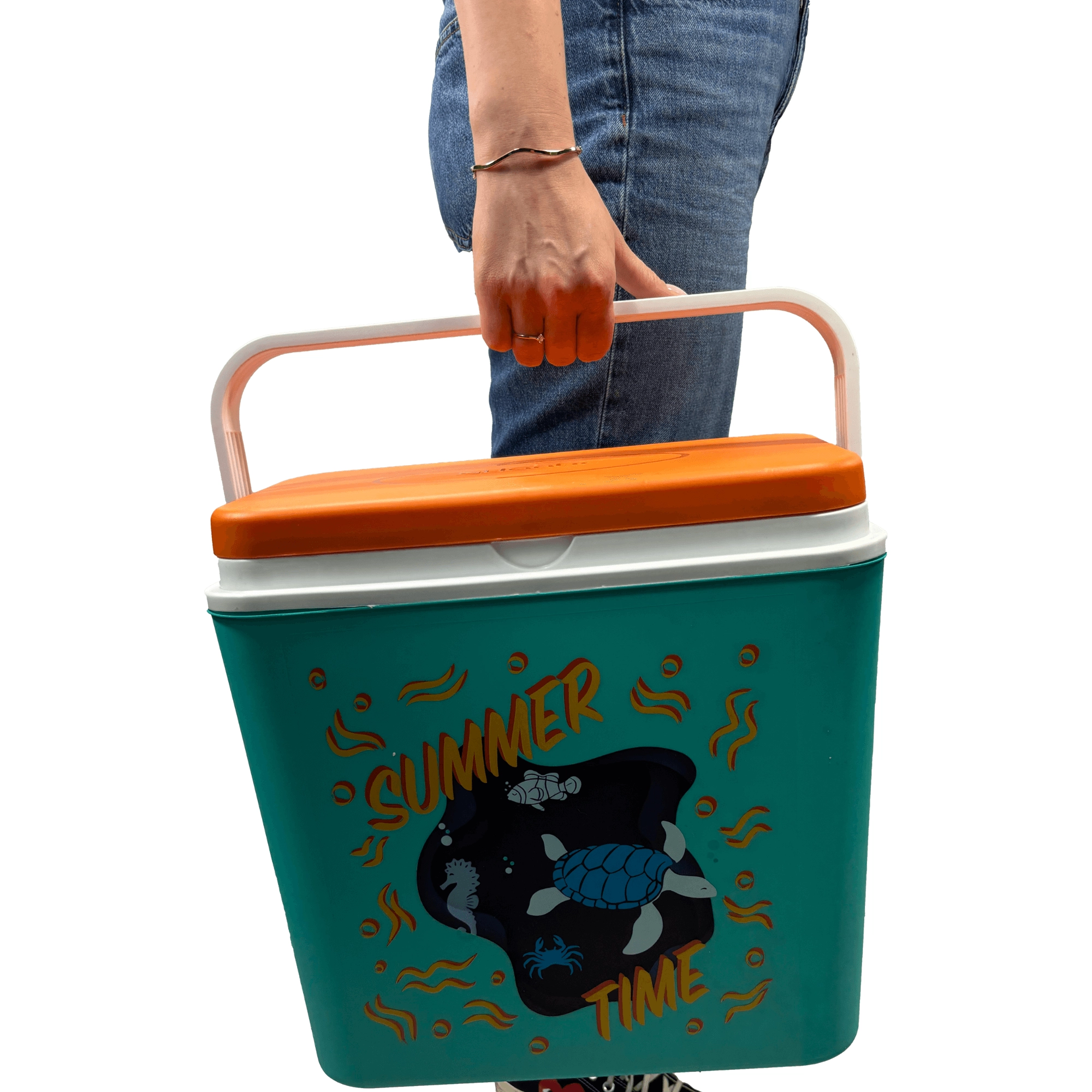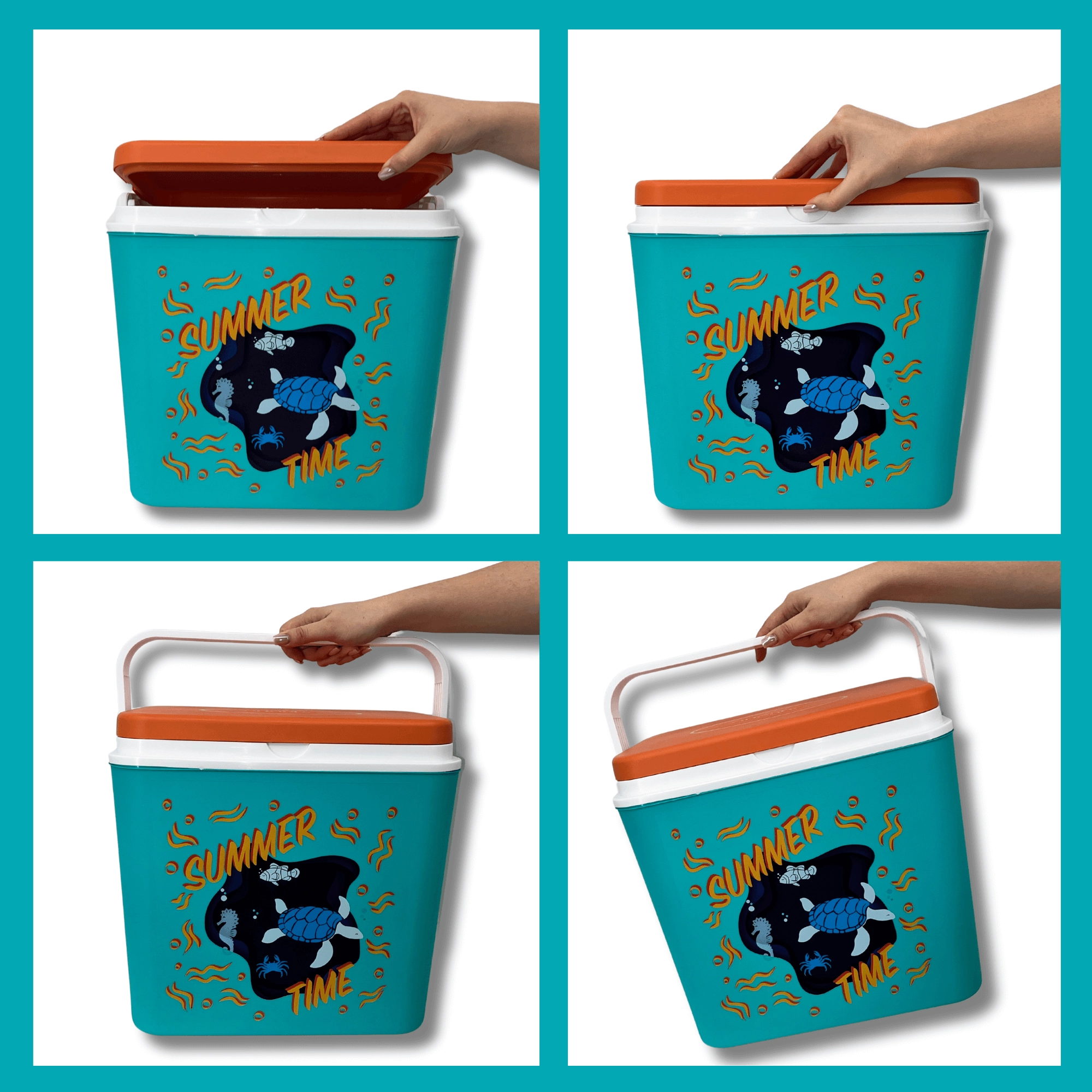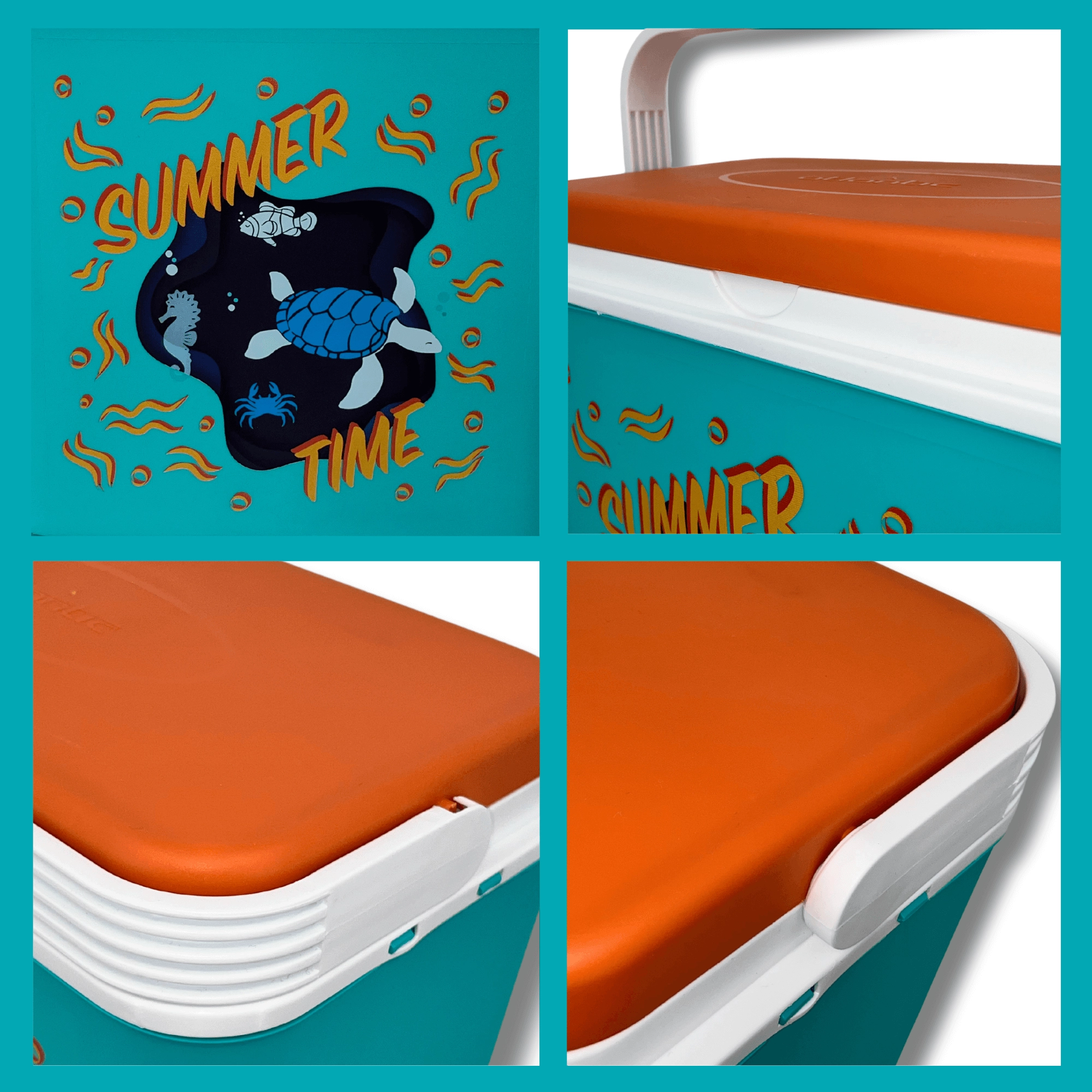 De box van duurzaam polypropyleen is eenvoudig te reinigen en de compacte constructie past in auto, camper en boot. De binnenhoogte maakt het mogelijk een 2 l fles rechtop te plaatsen; binnenin passen tot acht flessen van 1,5 l of drie van 2 l naast elkaar. De zomerse print met een schildpad en een zeepaardje en het contrasterende deksel geven de box een aantrekkelijke look.