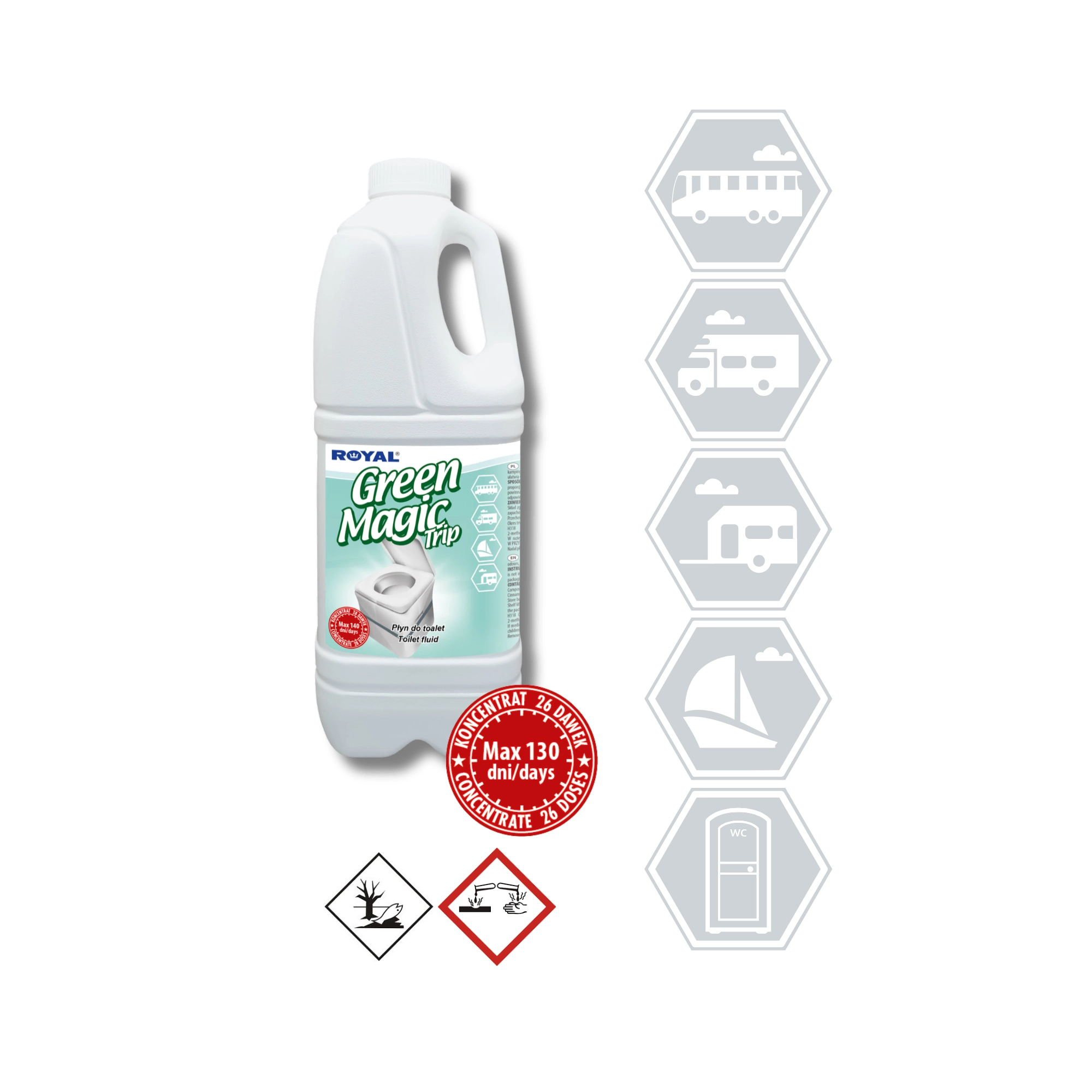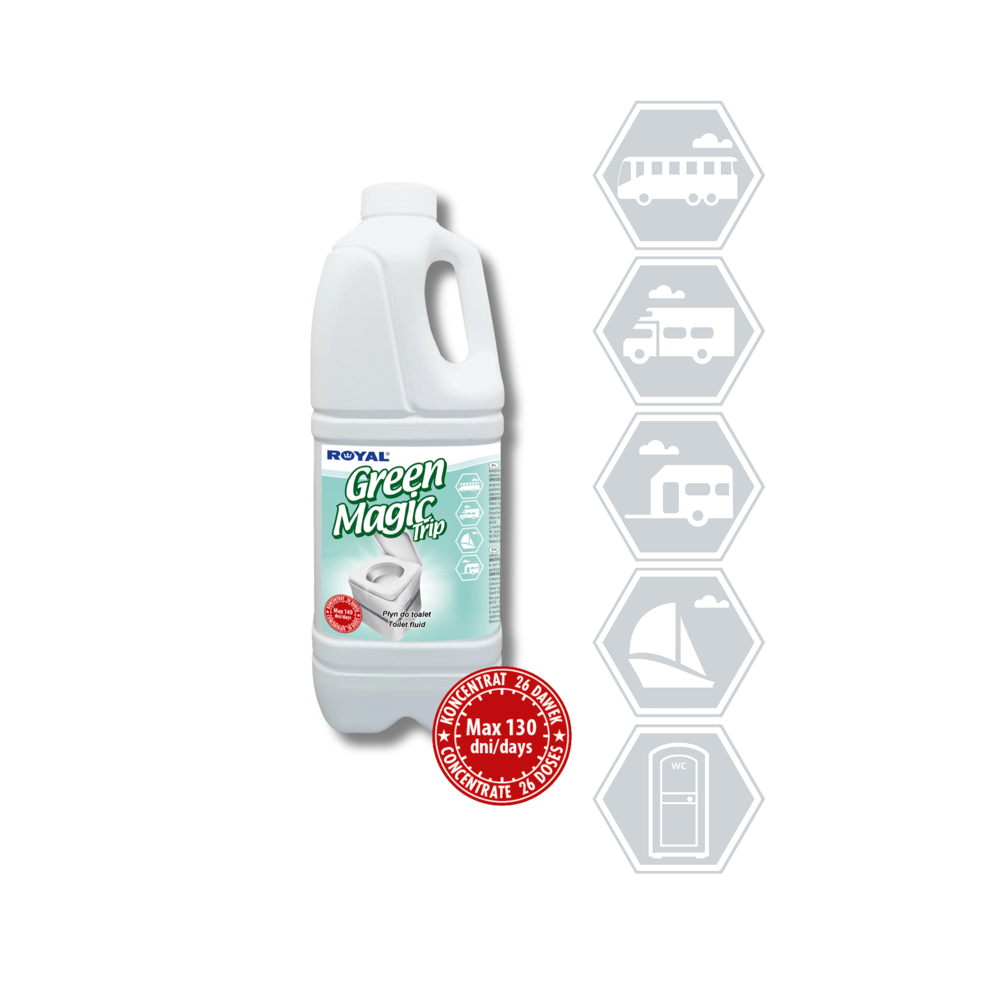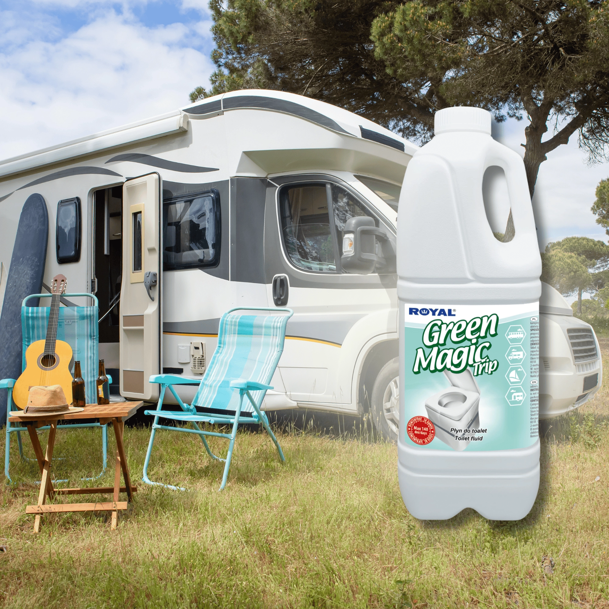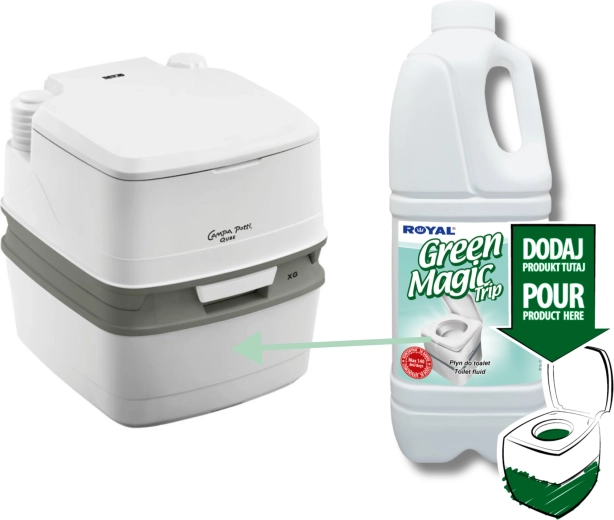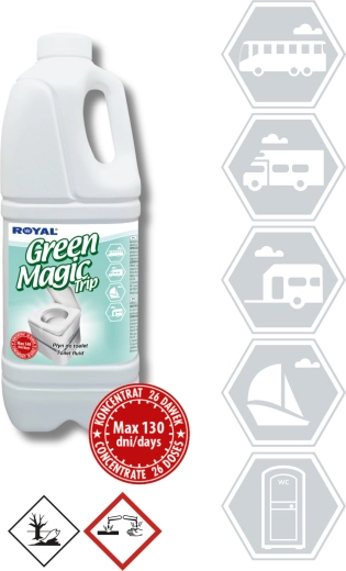 GREEN MAGIC TRIP is een geconcentreerd middel voor ondertanks van draagbare en cassette-toiletten in caravans, campers, boten en op bouwplaatsen of evenementen. Dankzij de sterke formulering onderdrukt het effectief onaangename geuren, versnelt het de afbraak van afval en toiletpapier en helpt het het toilet hygiënisch schoon te houden.