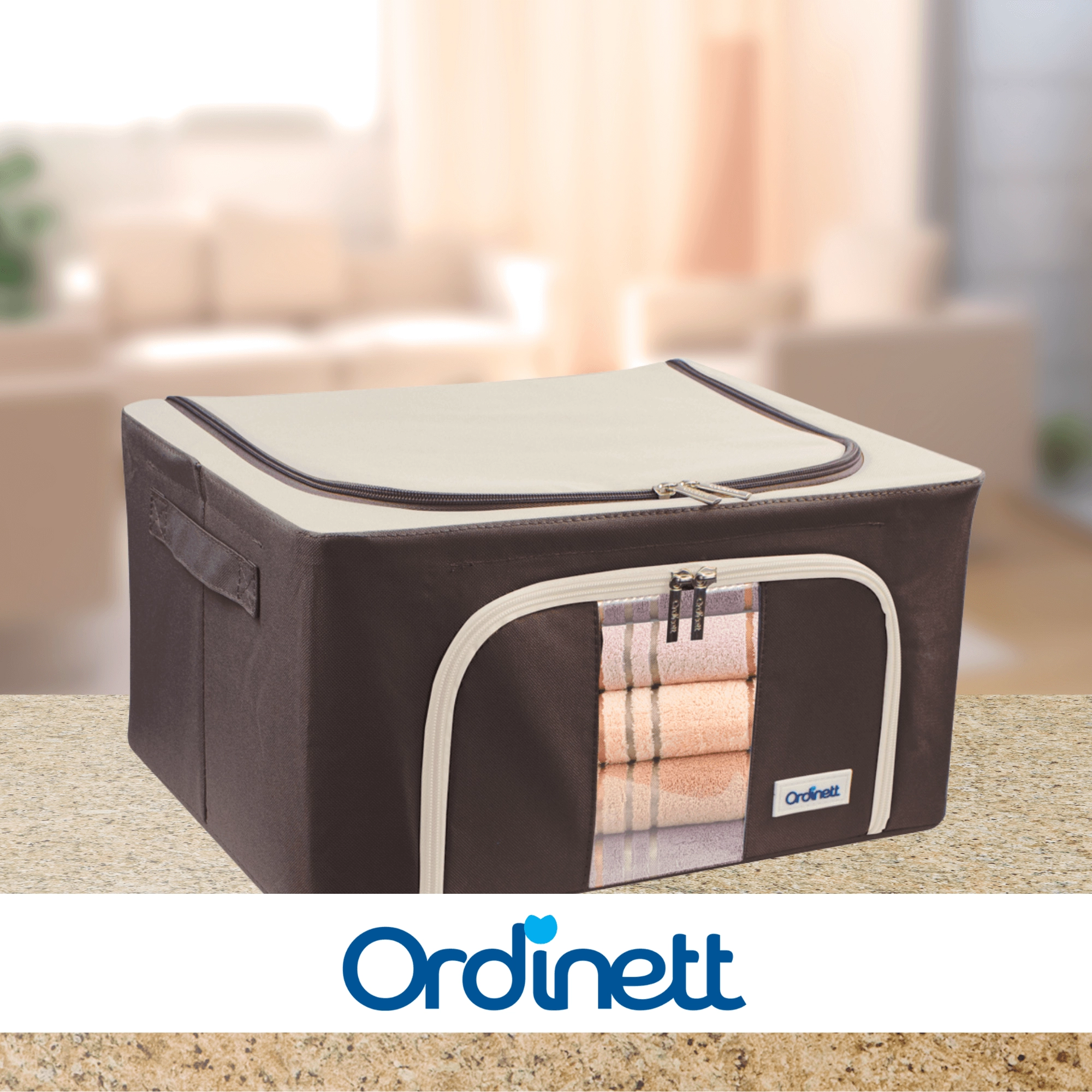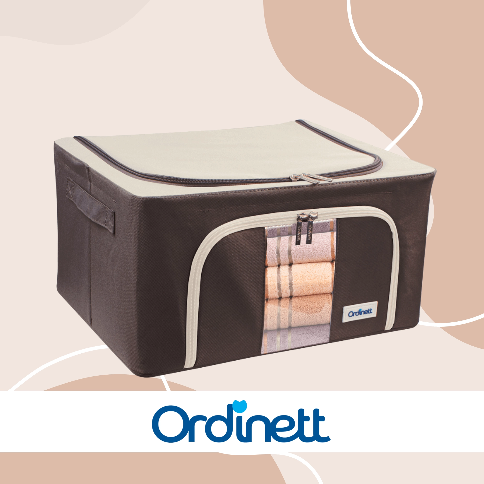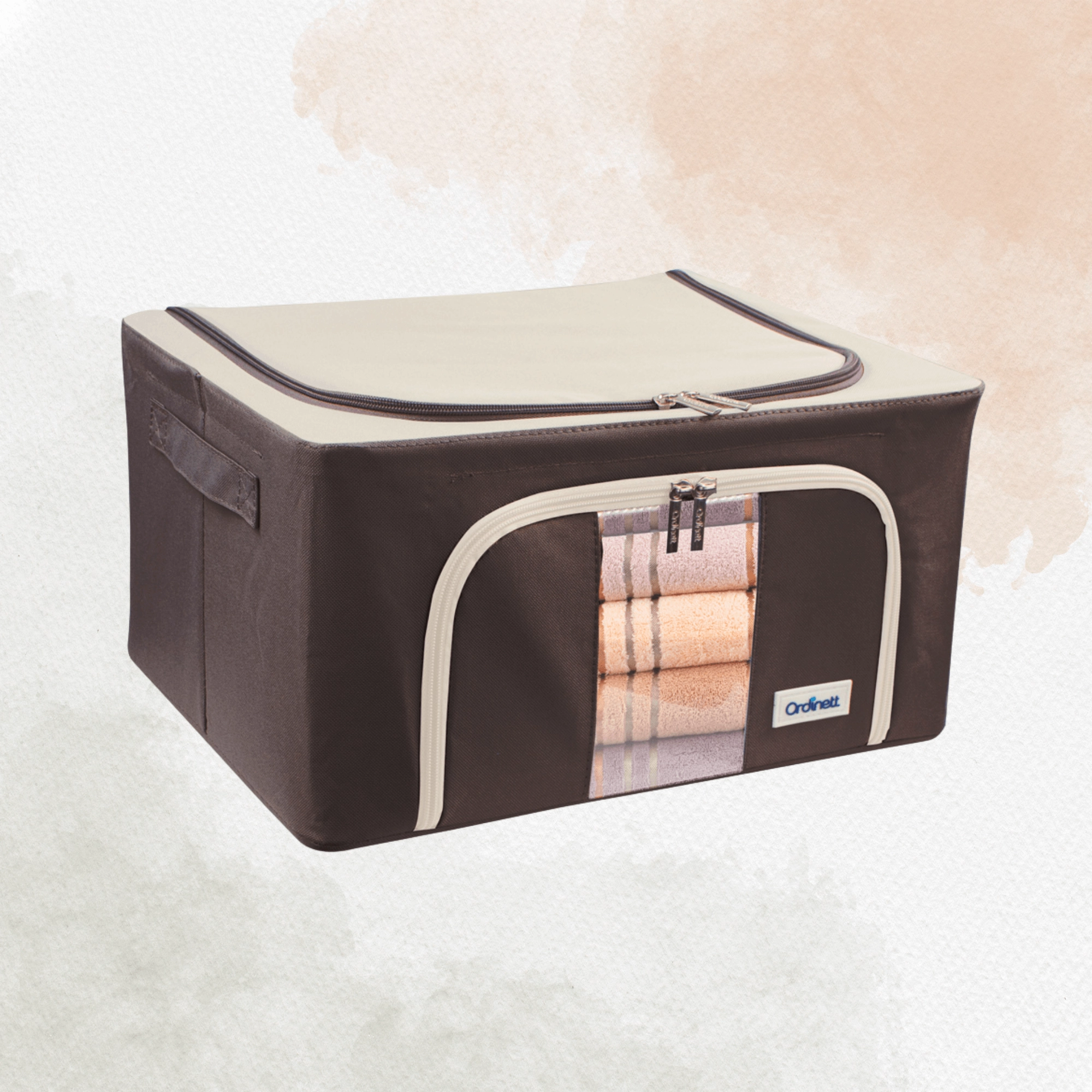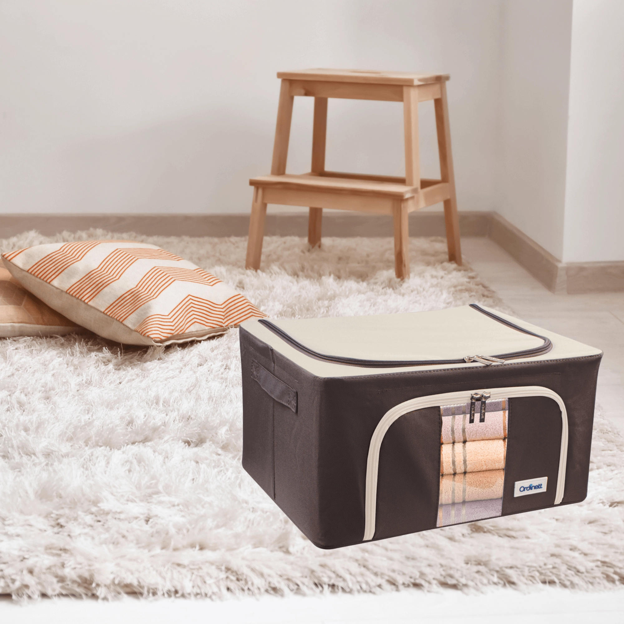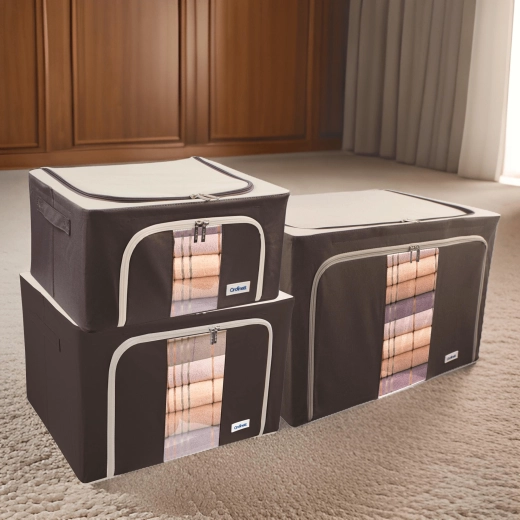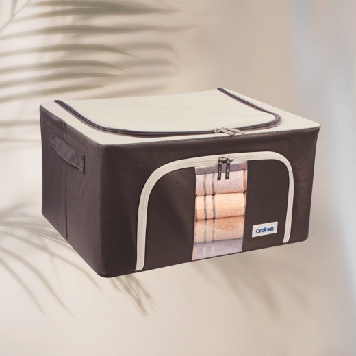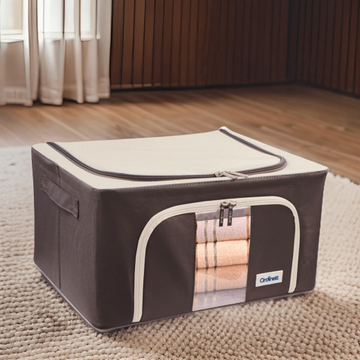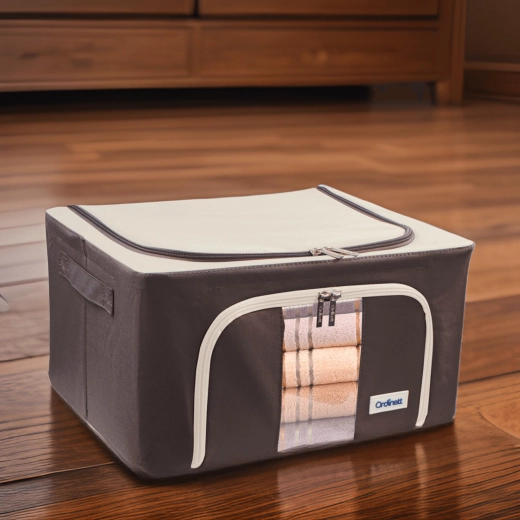 De opbergbox Kamai Gio Style is een praktische oplossing voor het overzichtelijk opbergen van kleding, beddengoed, dekens, handdoeken en speelgoed. De verstevigde constructie met een basis metalen frame behoudt de vorm, zodat de box niet vervormt, zelfs niet wanneer hij volledig gevuld is. Het transparante venster aan de voorkant laat u de inhoud meteen zien zonder te openen.