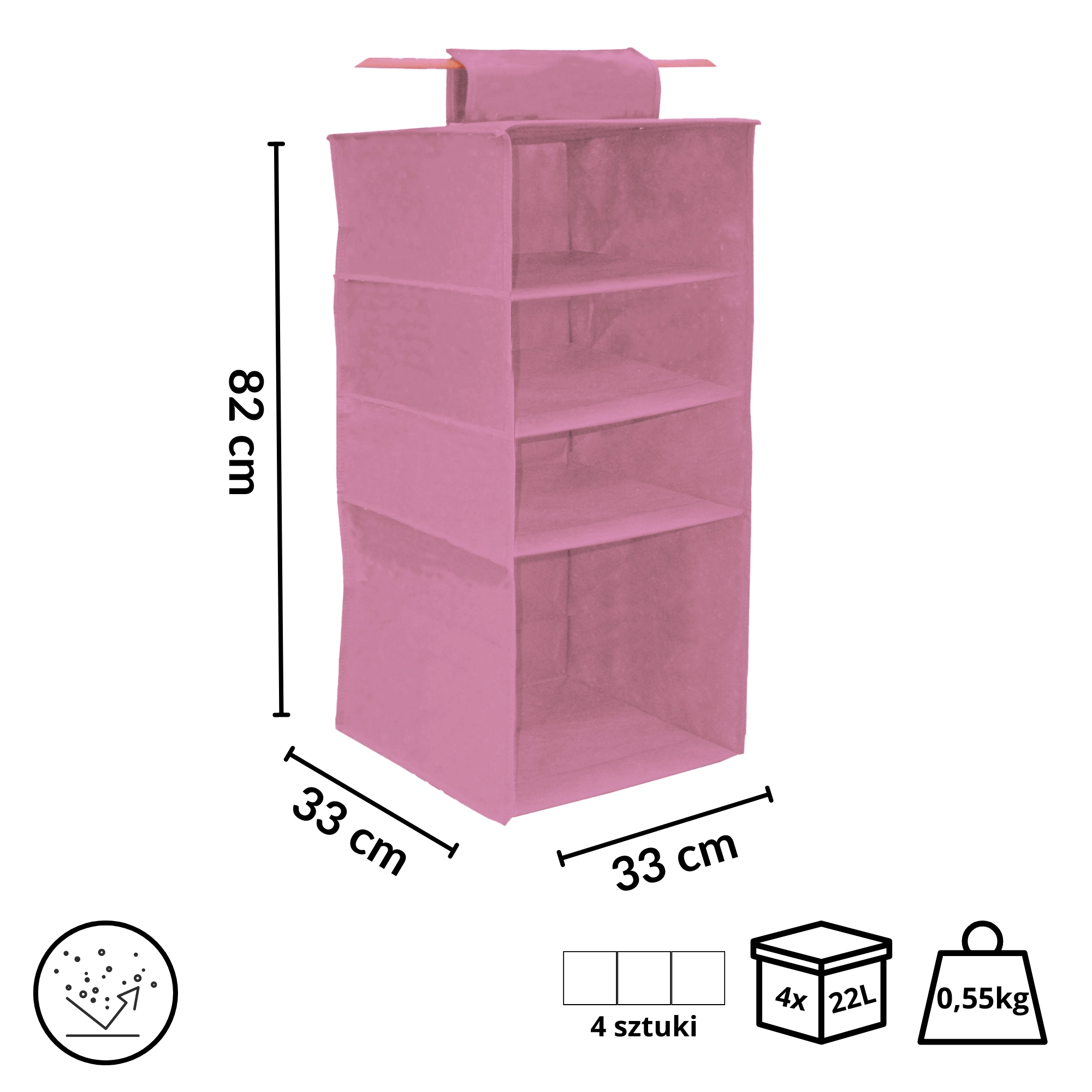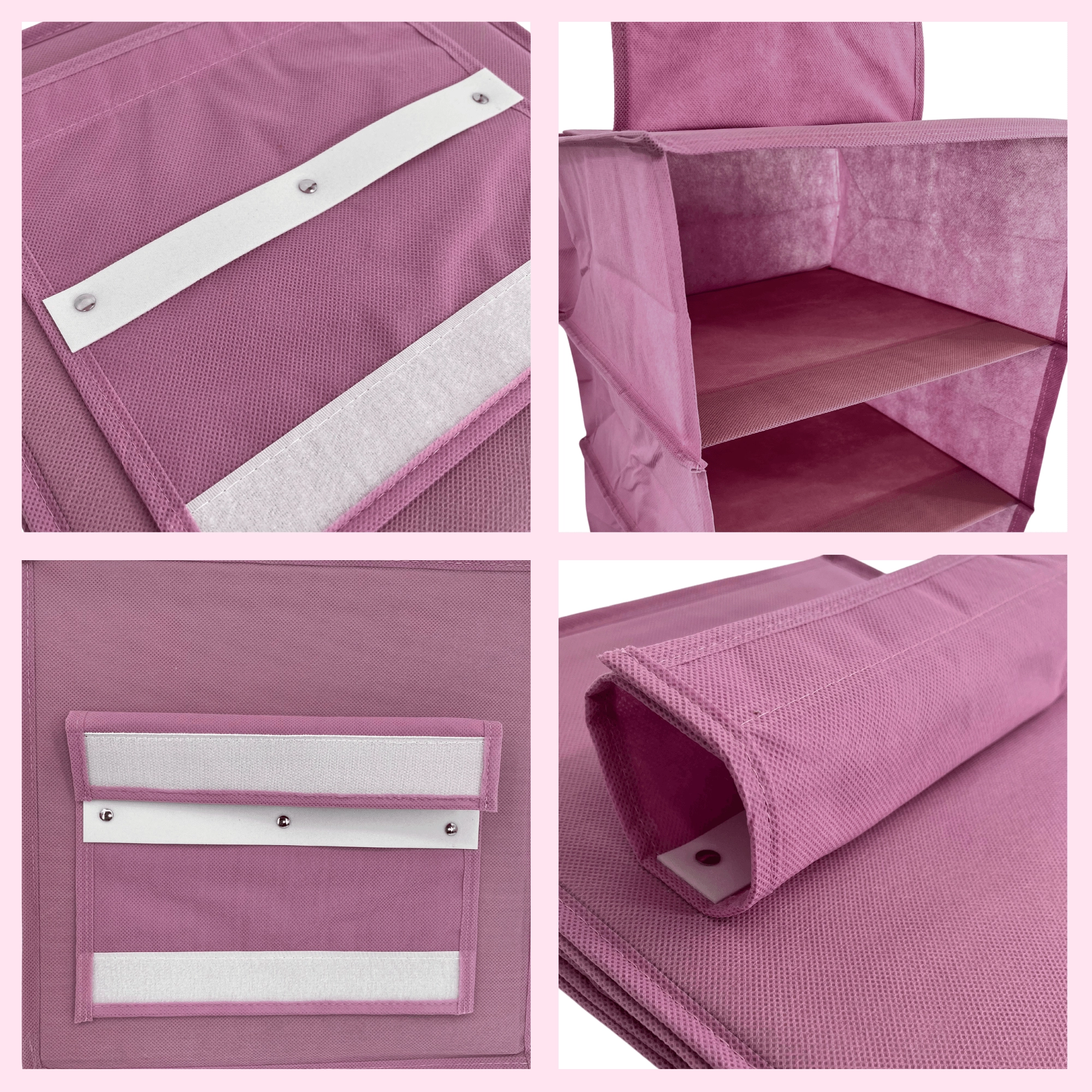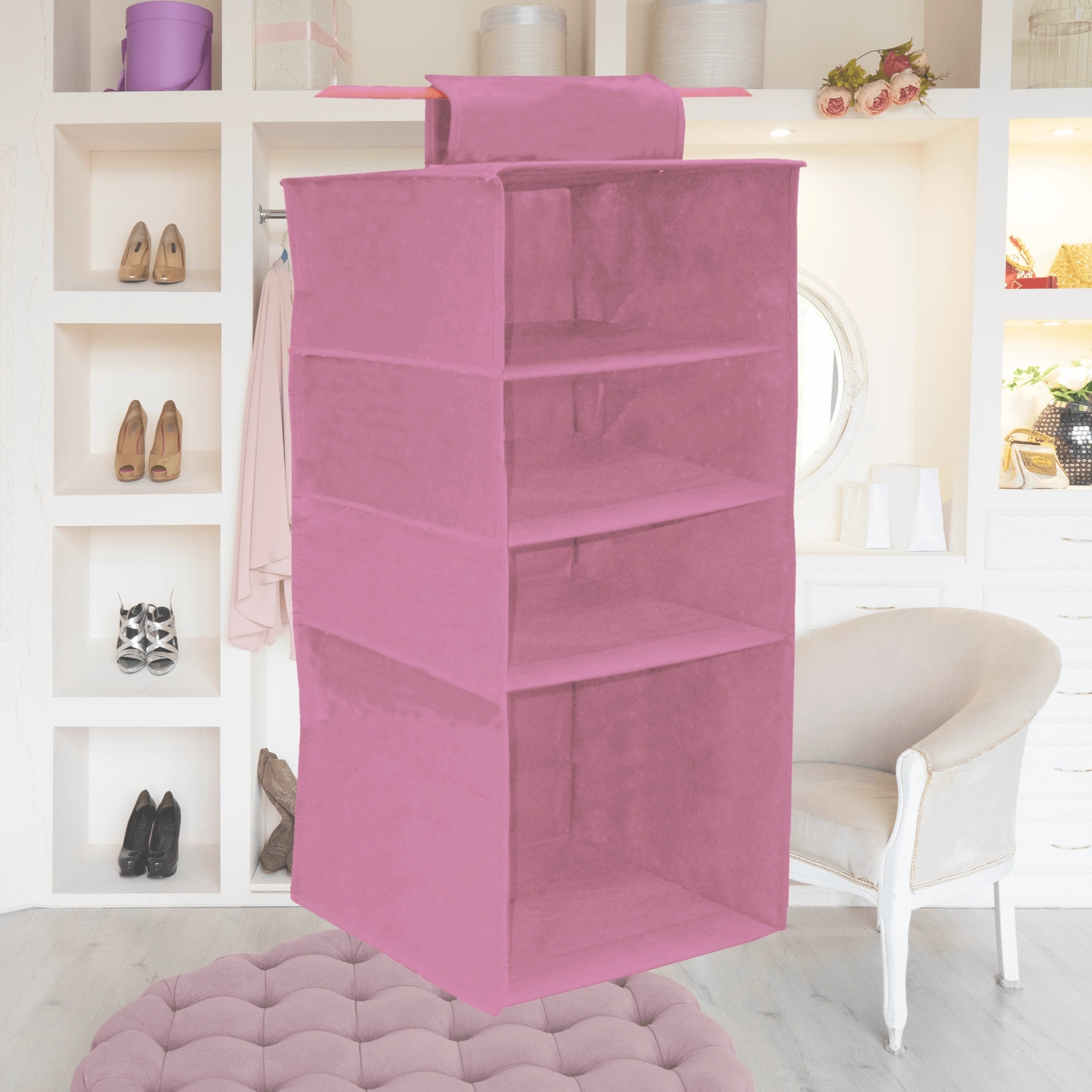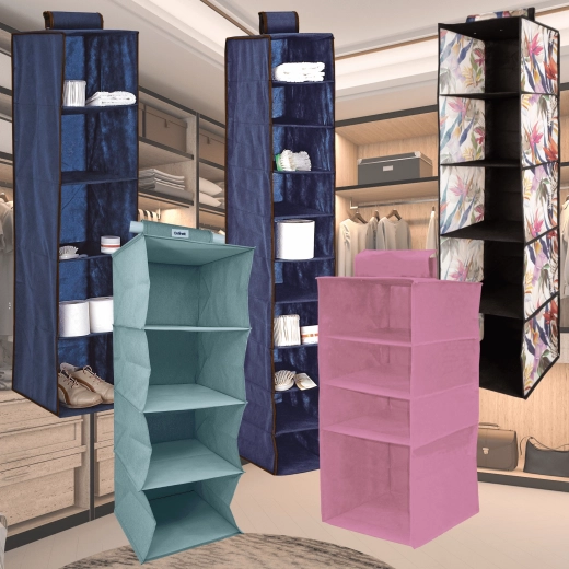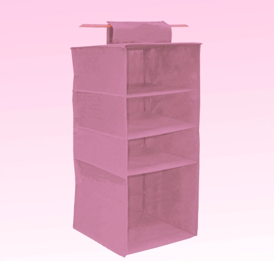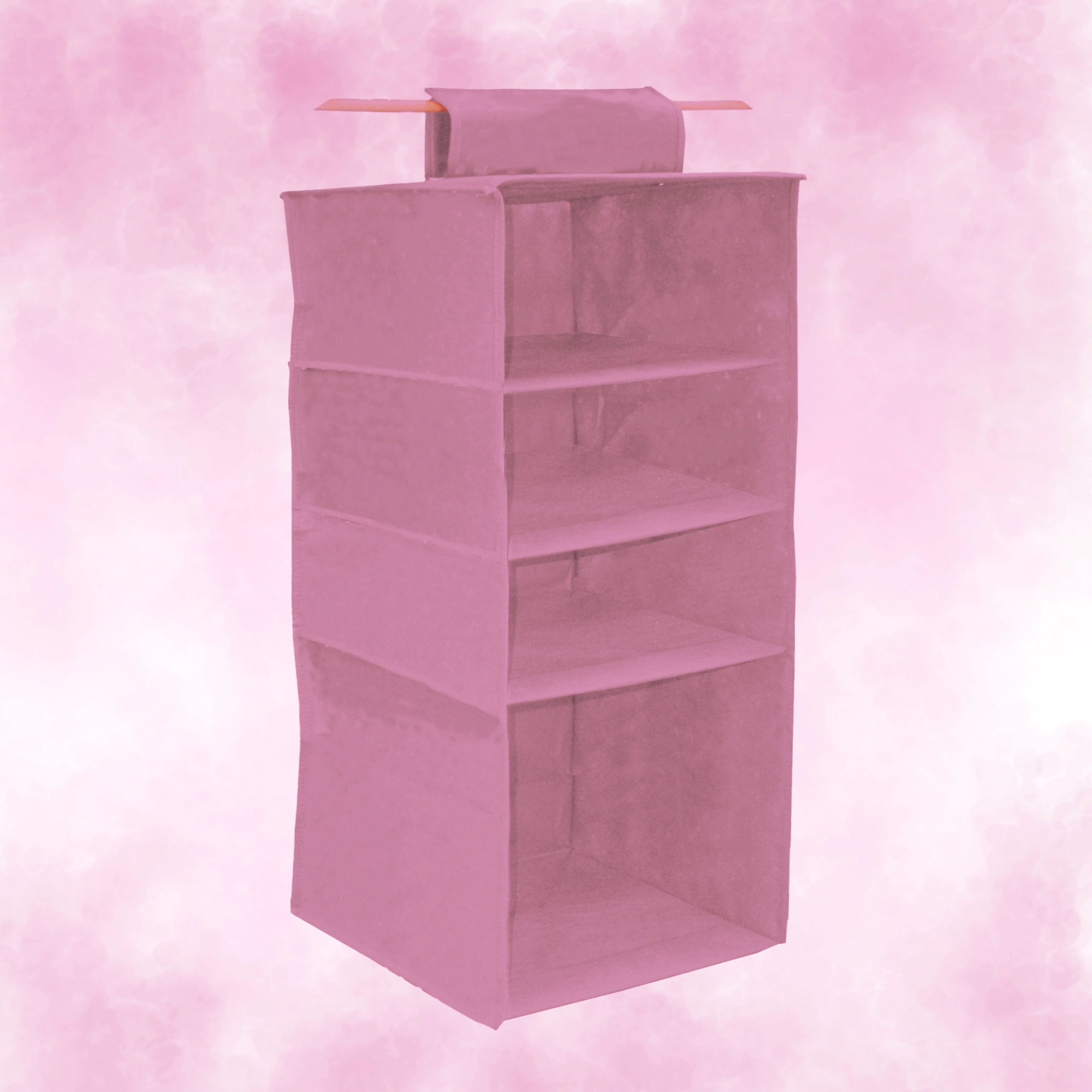 Breng in een oogwenk orde in je kast. De hangende organizer Blossom in het roze biedt 4 ruime legplanken, eenvoudig op te hangen aan de kledingroede met een omklapbare klittenbandstrap en een lichte maar stevige textiele constructie van non-woven textiel. Ideaal voor kleding, truien, accessoires en handdoeken – maximaliseert de verticale ruimte en houdt alles overzichtelijk binnen handbereik.