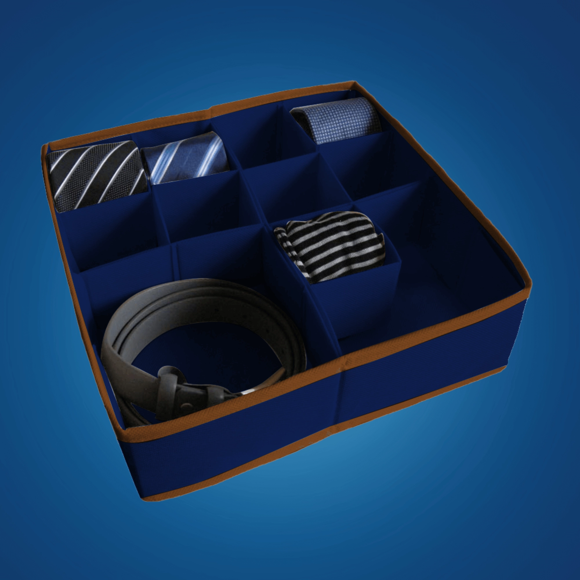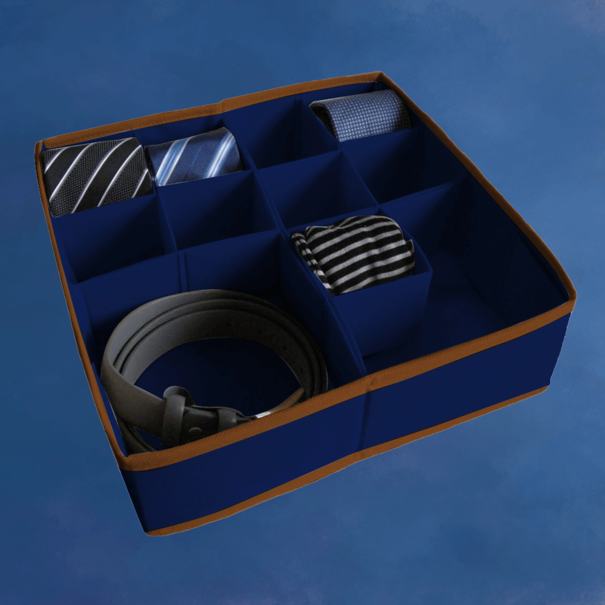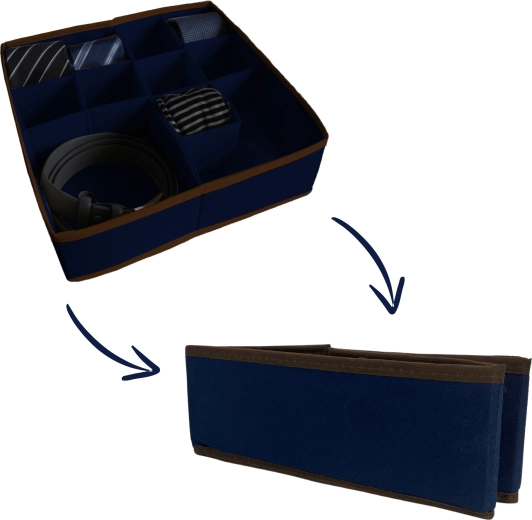 De praktische organizer met afmetingen 30,5 × 30,5 × 10 cm verandert chaos in een overzichtelijk systeem. De zachte maar stevige non-woven textiel is onderhoudsvriendelijk en vormvast, zodat kleine kledingstukken en accessoires netjes op hun plek blijven. De neutrale, donkerblauwe kleur met subtiele bies past bij elke kast en commode.