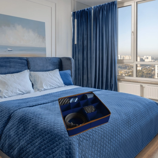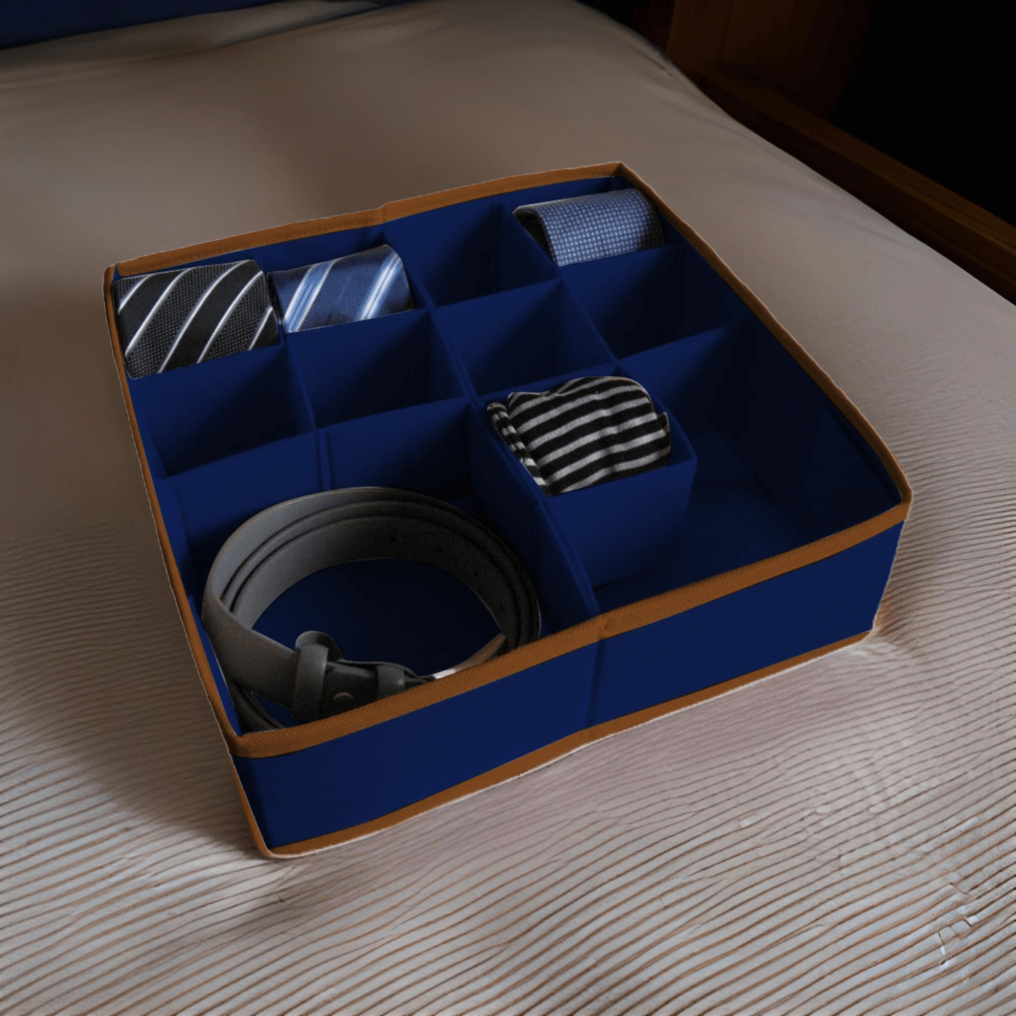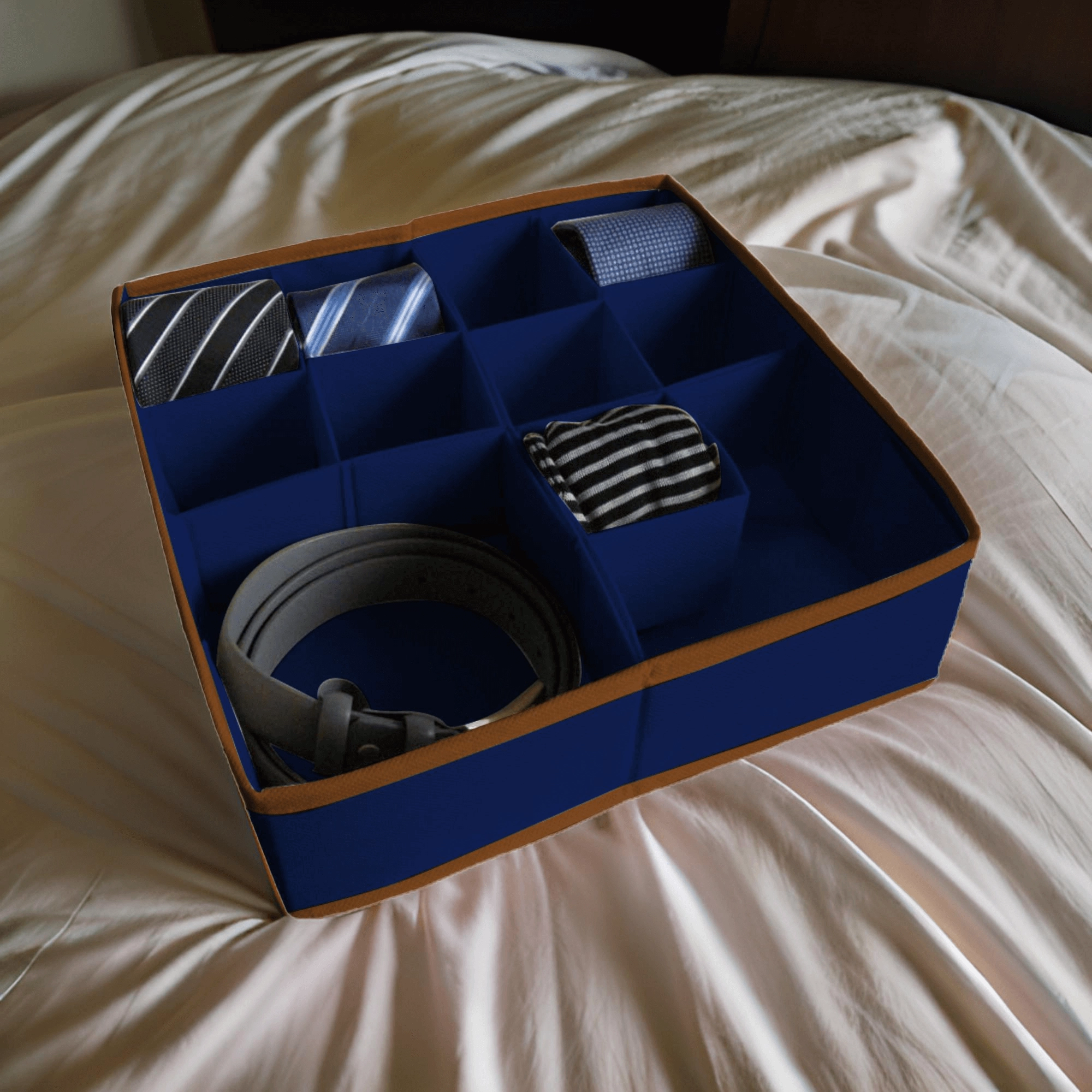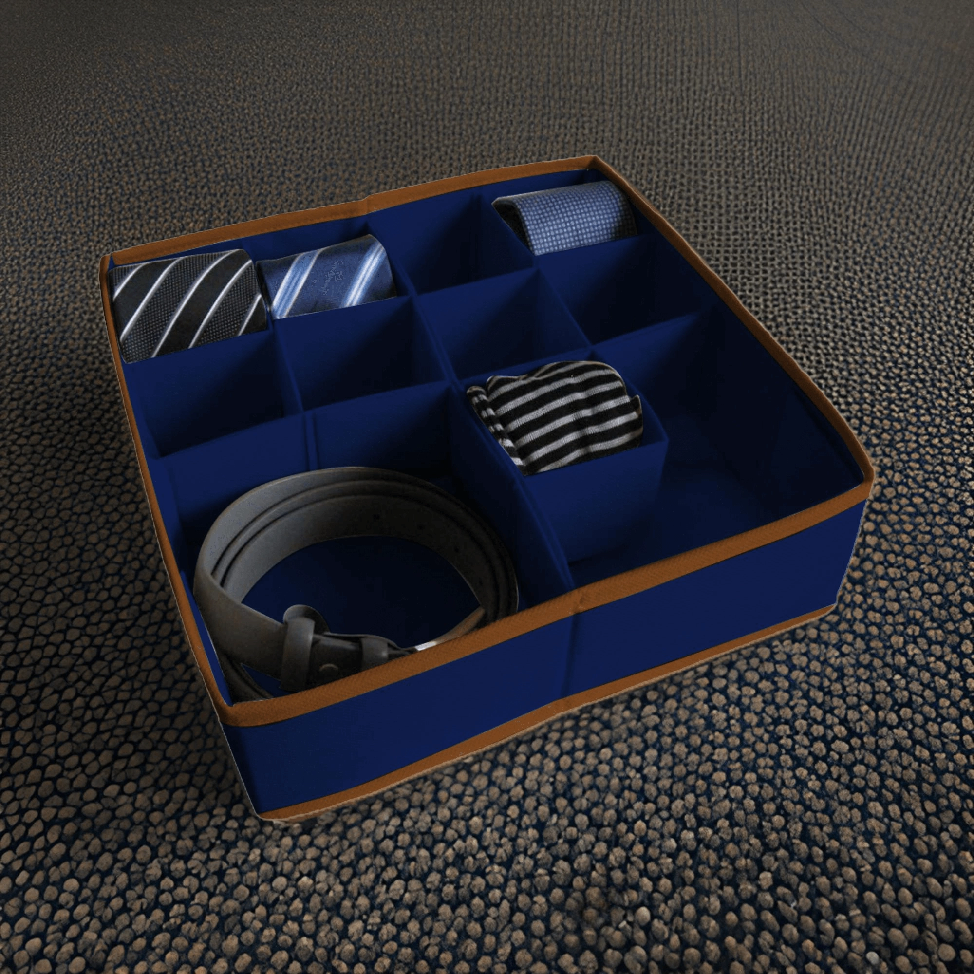 De praktische organizer met afmetingen 30,5 × 30,5 × 10 cm verandert chaos in een overzichtelijk systeem. De zachte maar stevige non-woven textiel is onderhoudsvriendelijk en vormvast, zodat kleine kledingstukken en accessoires netjes op hun plek blijven. De neutrale, donkerblauwe kleur met subtiele bies past bij elke kast en commode.