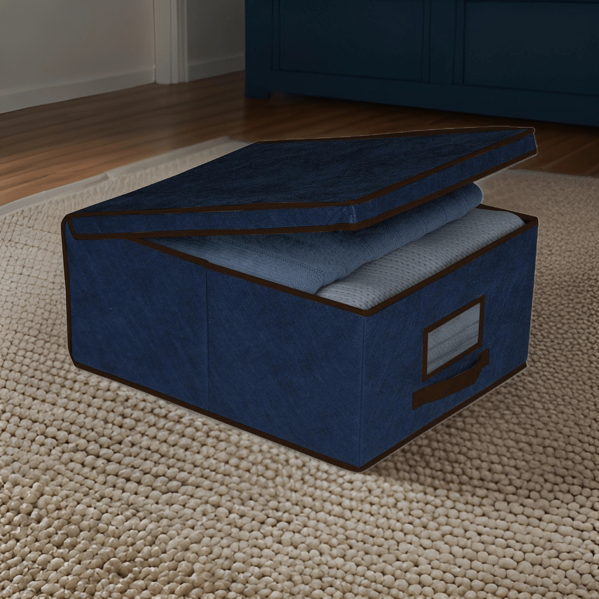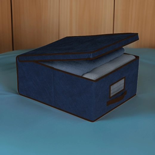 De blauwe opbergbox is ideaal voor het overzichtelijk opbergen van kleding, beddengoed, truien, speelgoed en accessoires. De stevige maar opvouwbare constructie van non-woven textiel behoudt zijn vorm en neemt geen ruimte in wanneer je hem even niet gebruikt.