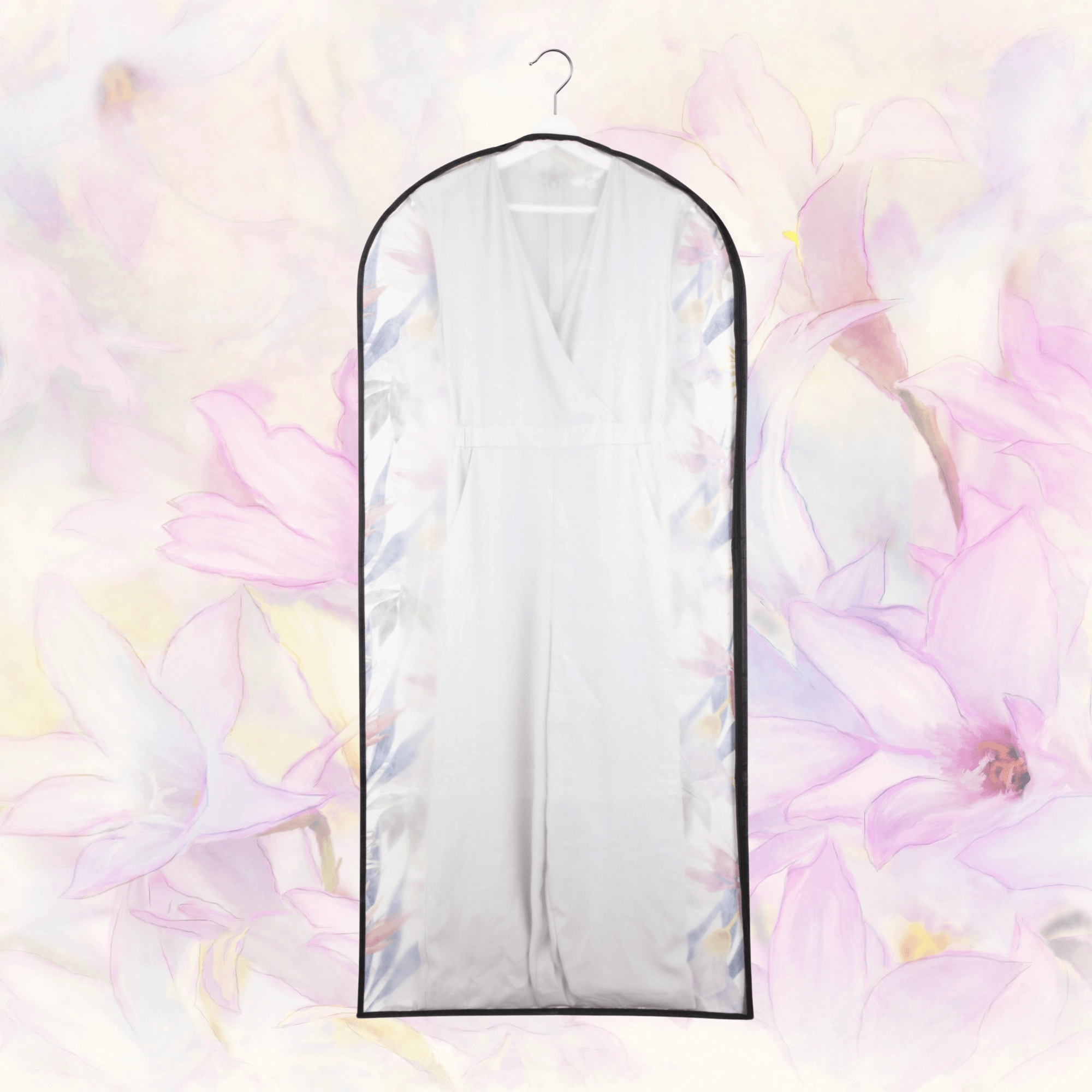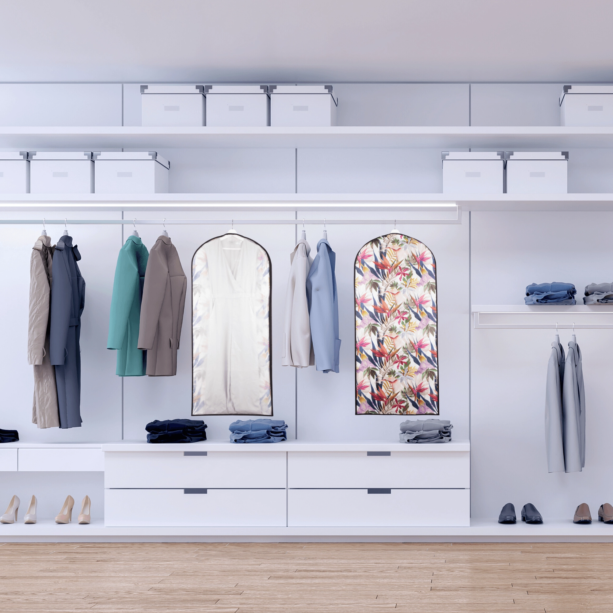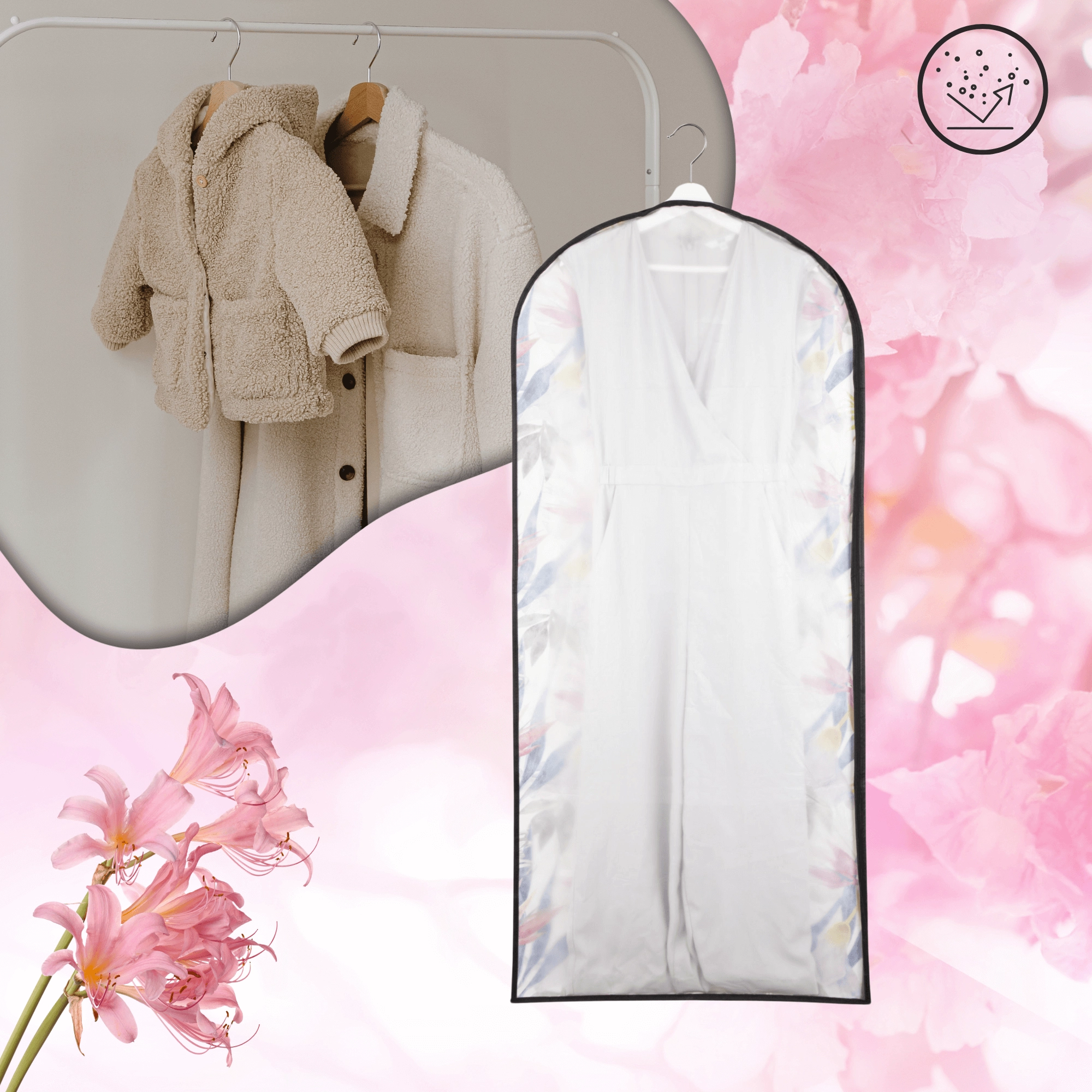 De vrolijke floral print maakt het interieur knus en verandert praktische kledingbescherming in een elegante accessoire.