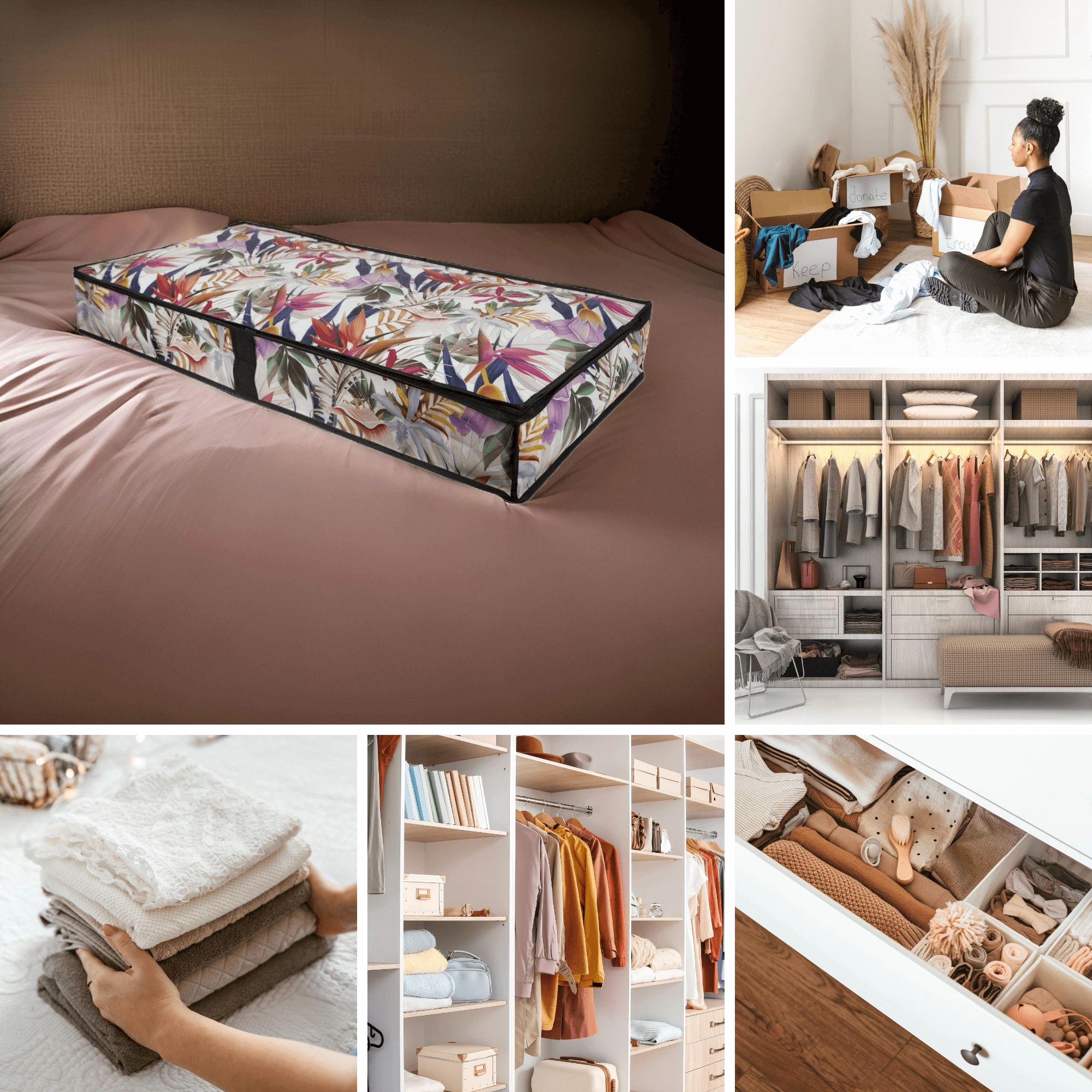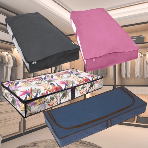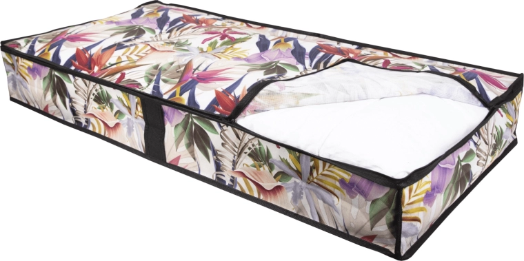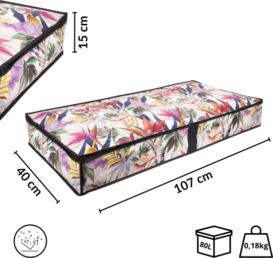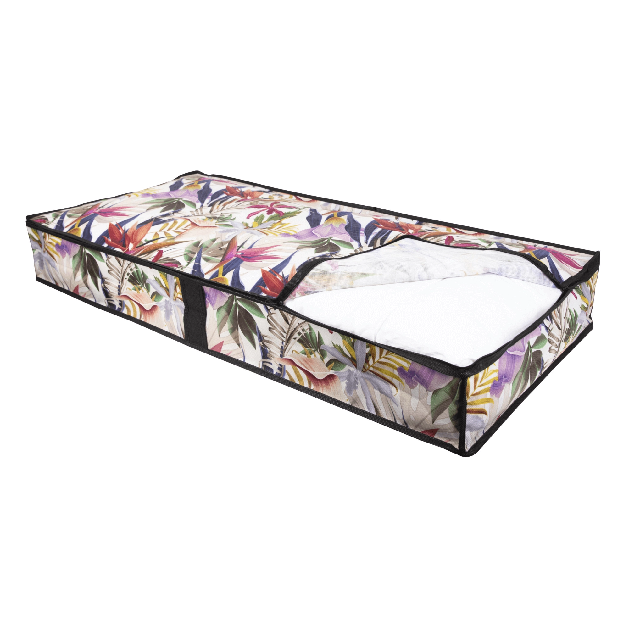 Haal het maximum uit elke centimeter. Het lage profiel van de opbergbox met afmetingen 107 × 50 × 15 cm schuift soepel onder het bed of op een kastplank en houdt je textiel overzichtelijk geordend en beschermd tegen stof. De bloemenprint geeft je interieur een frisse en stijlvolle touch.